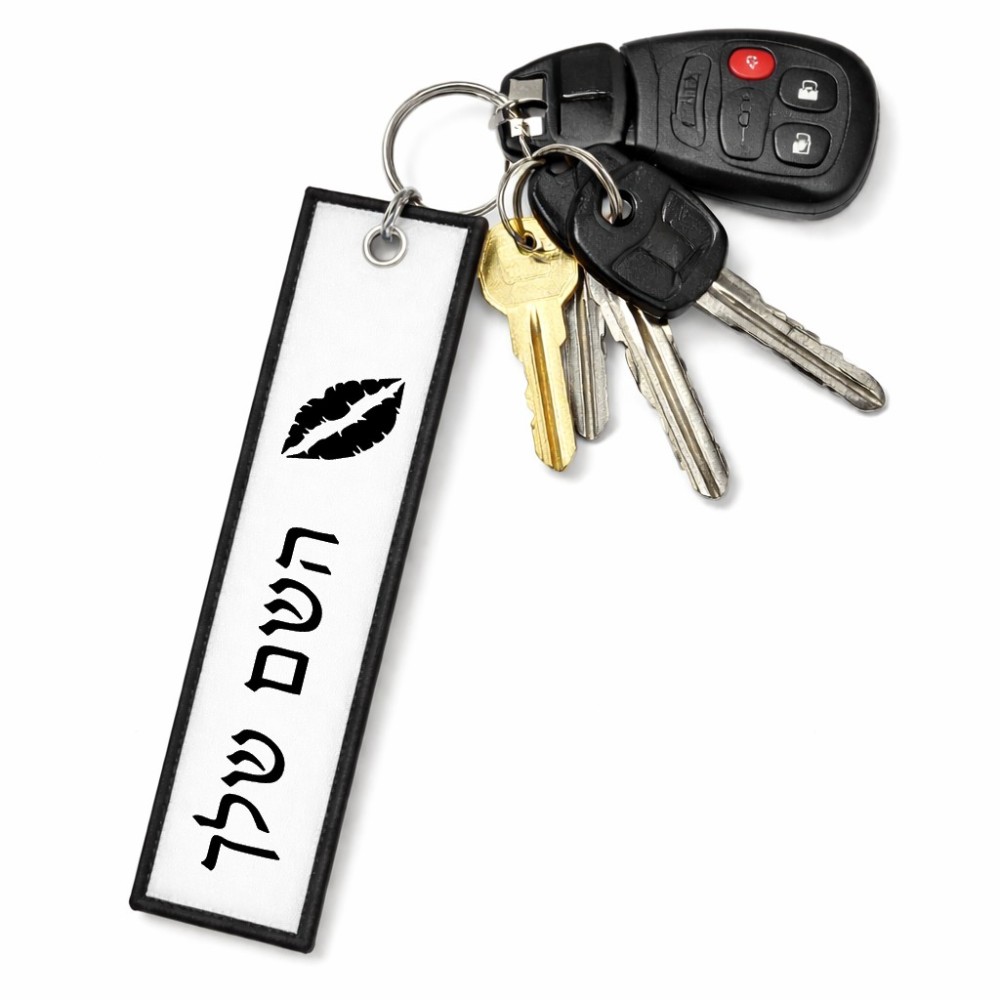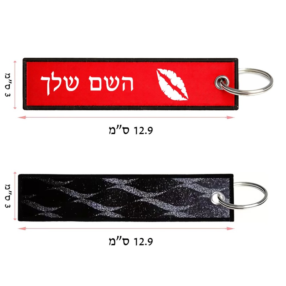 תווית סימון תיקים \ צרור מפתחות בעיצוב אישי עם השם שלך בעיצוב שפתיים - נשיקה גודל התווית 12.9 × 3 ס"מ. את השם המבוקש ניתן לציין בהזמנה, אם לא צויין אנחנו ניצור קשר לבירור.