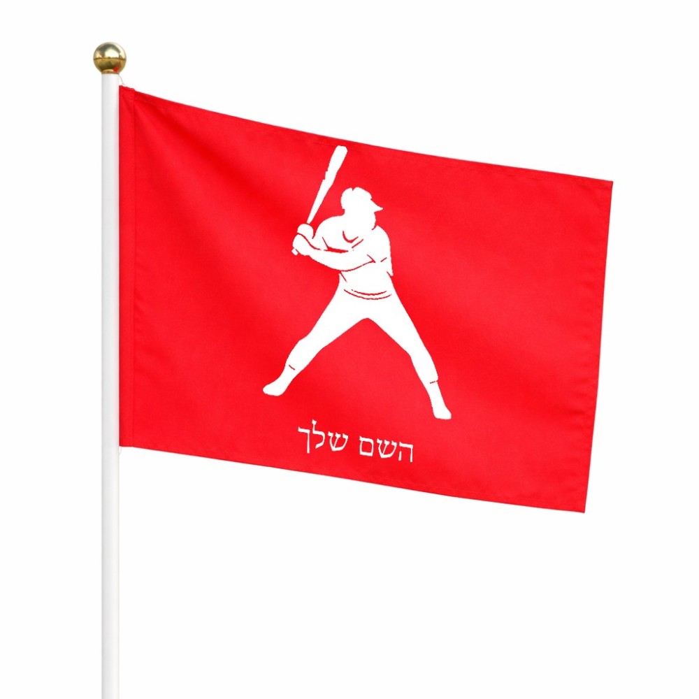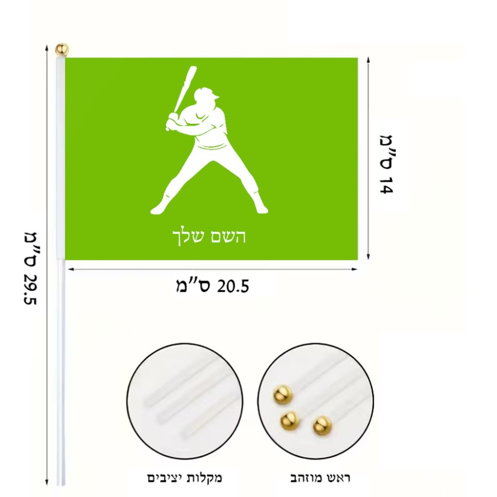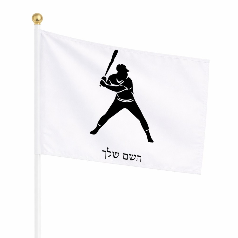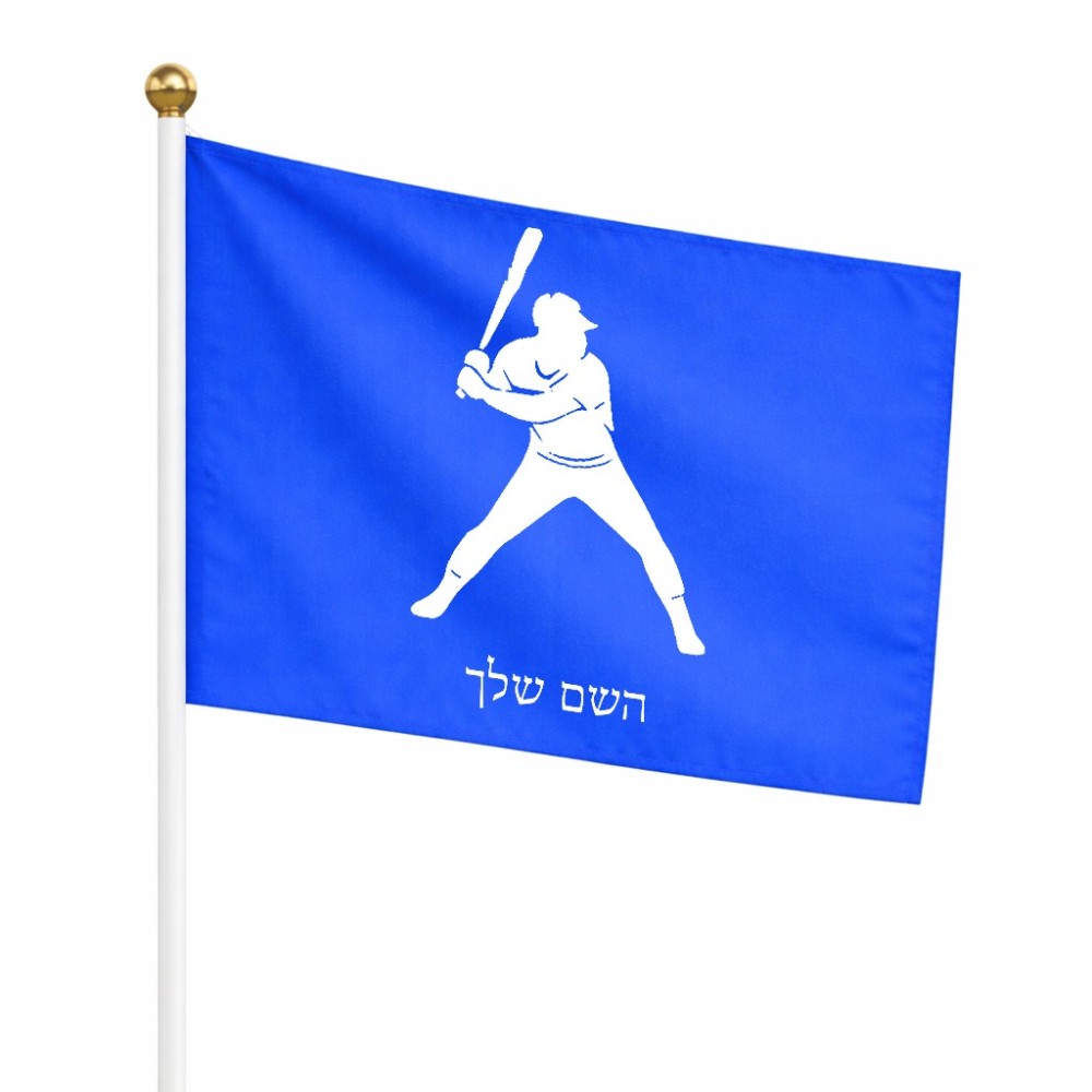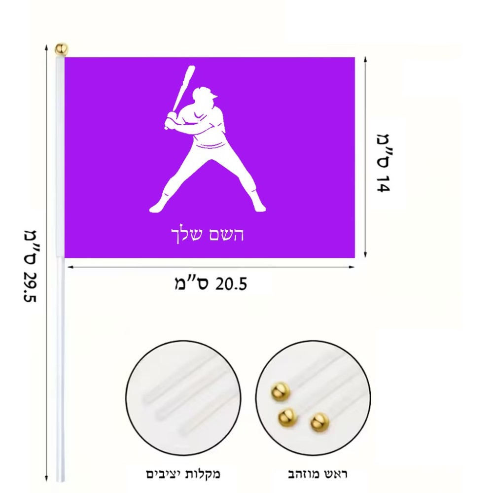 דיגלון בעיצוב אישי עם השם שלך בעיצוב שחקן בייסבול גודל הדיגלון 20.5 × 14 ס"מ, ההדפסה מתבצעת בשני צידי הדגל, את השם המבוקש ניתן לציין בהזמנה, אם לא צויין אנחנו ניצור קשר לבירור.