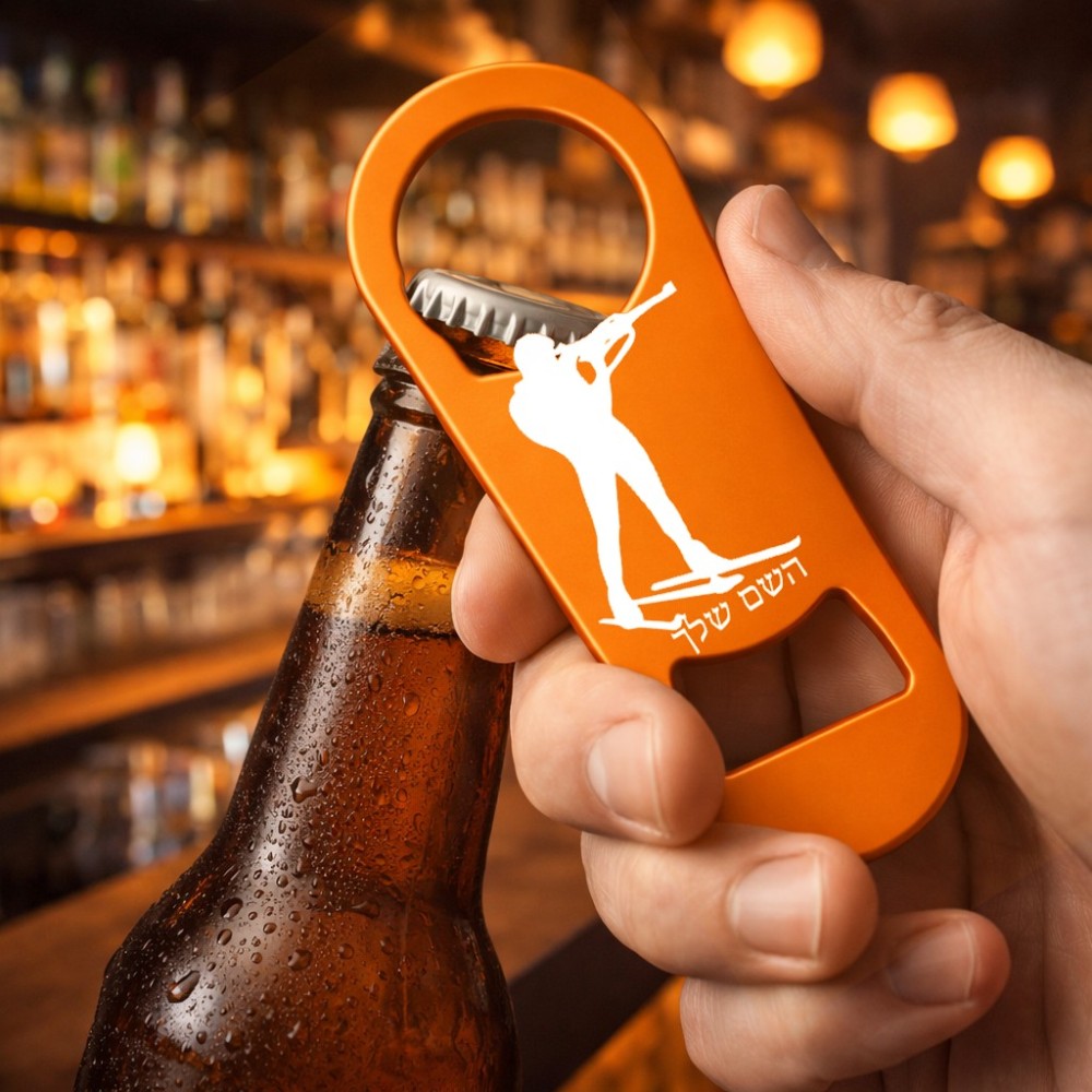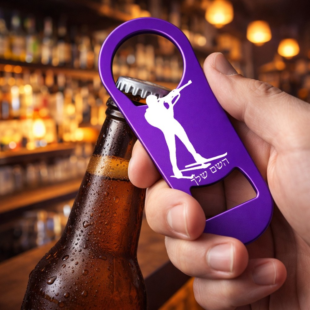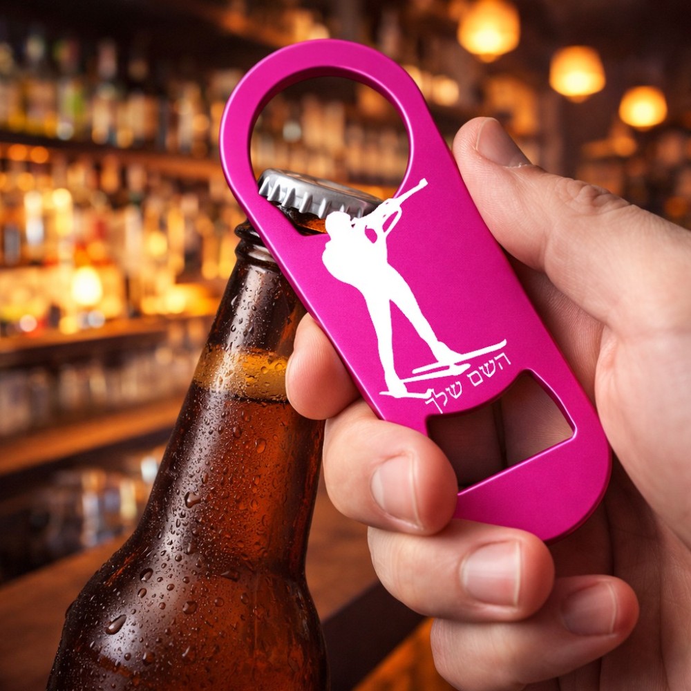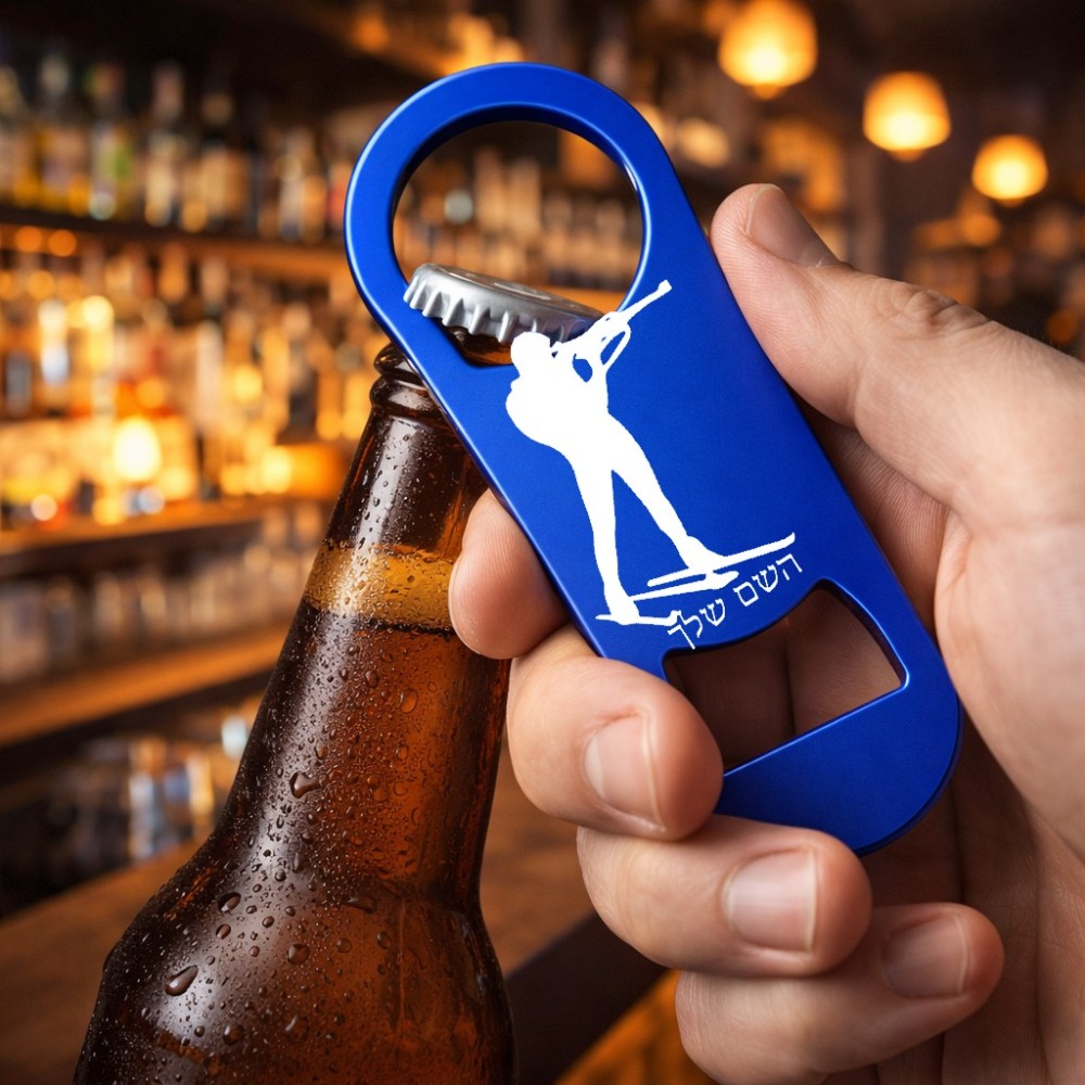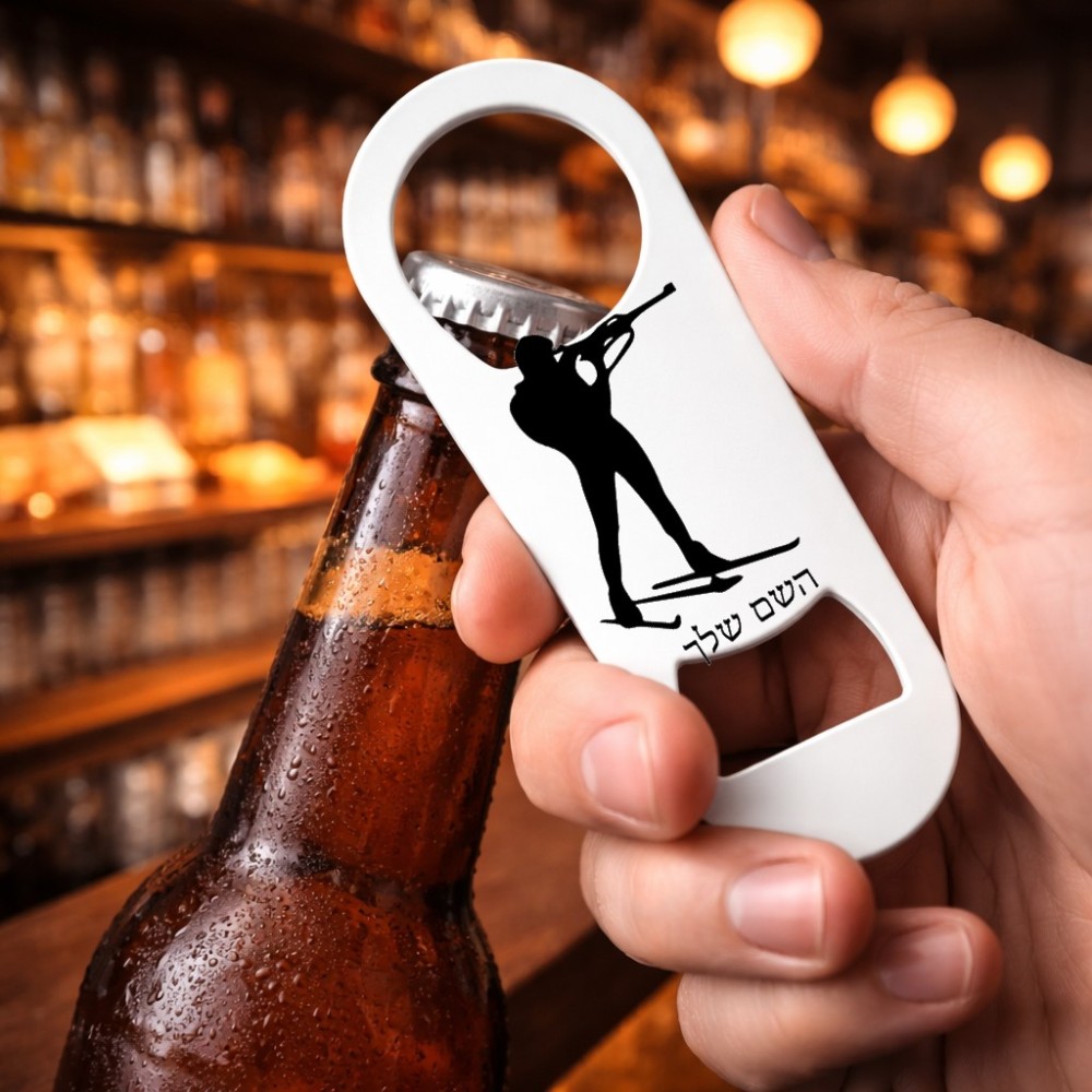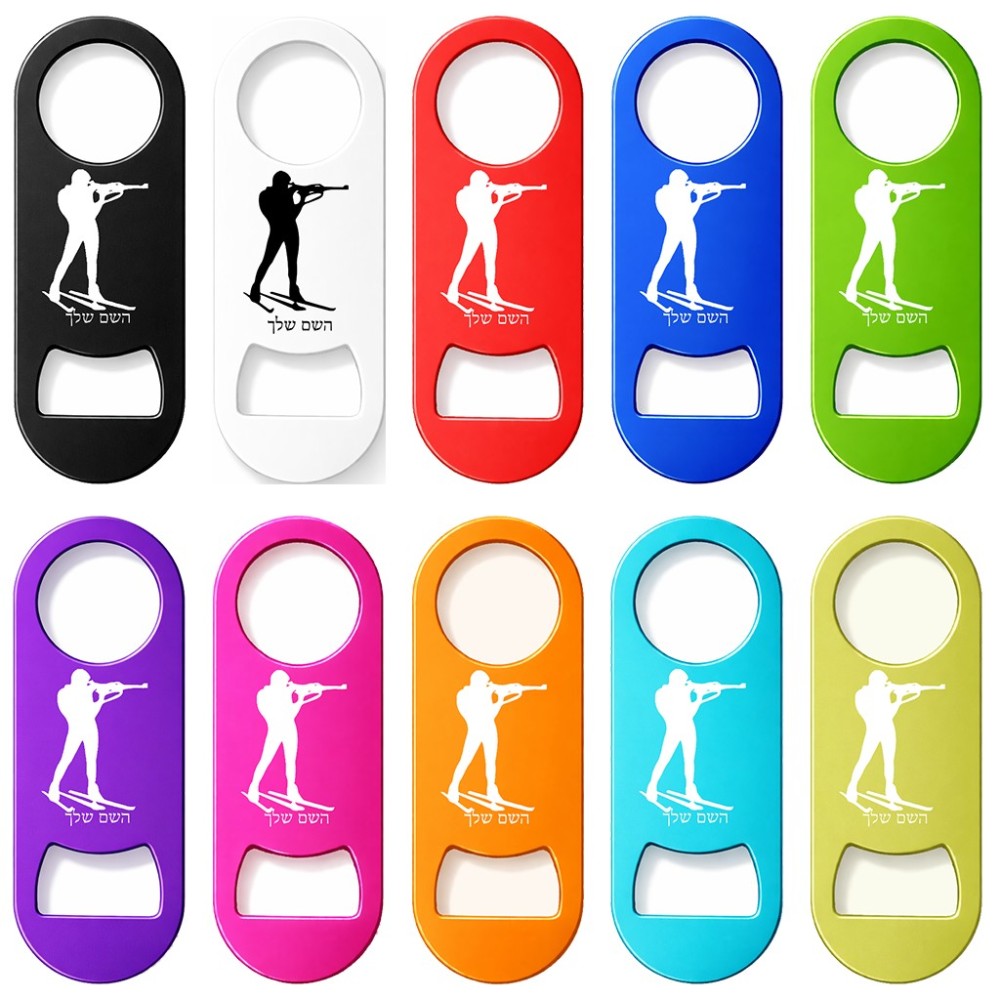 פותחן בקבוקים בעיצוב אישי עם השם שלך בעיצוב ביאתלון גודל הפותחן 3.2 × 8.7 ס"מ