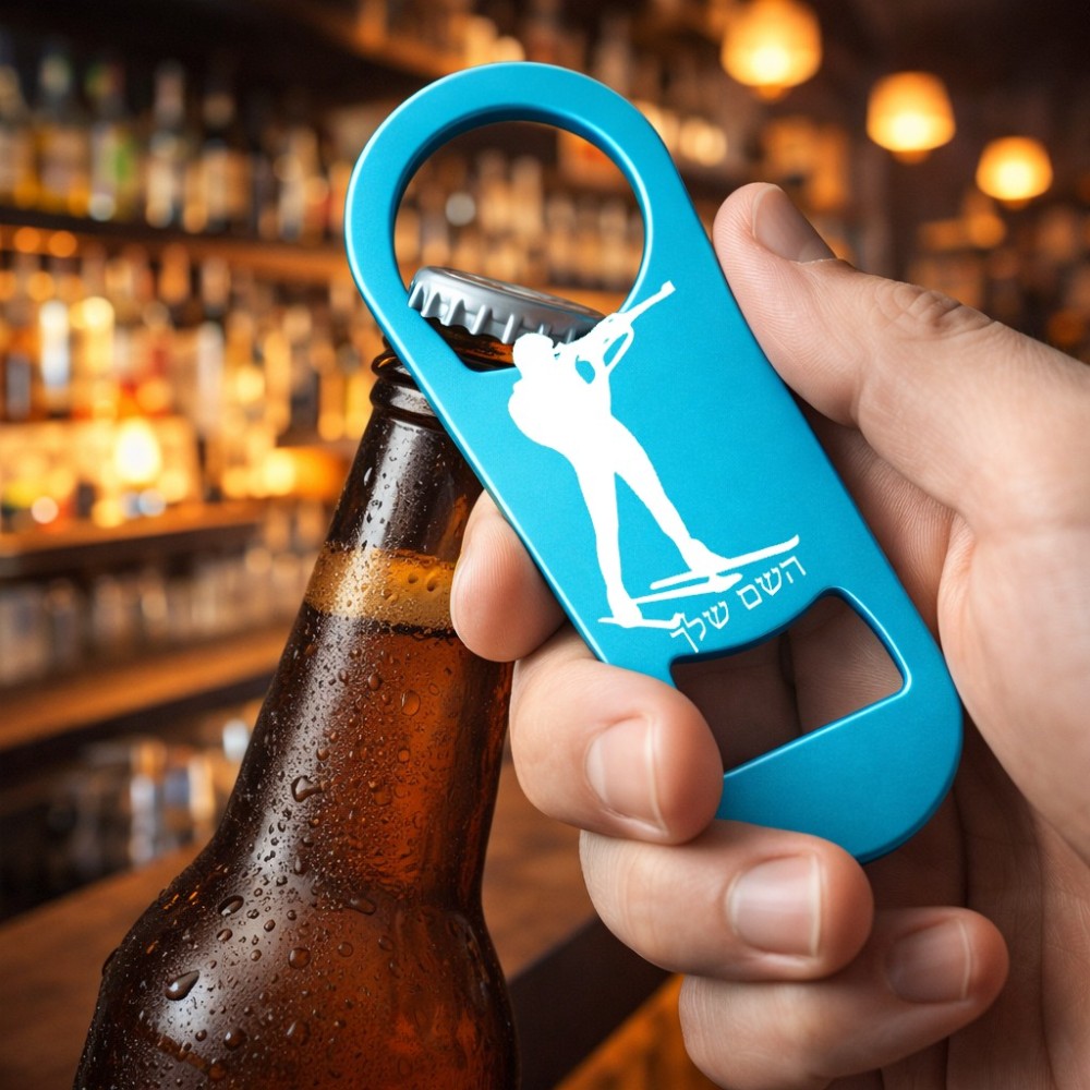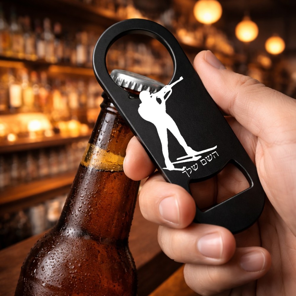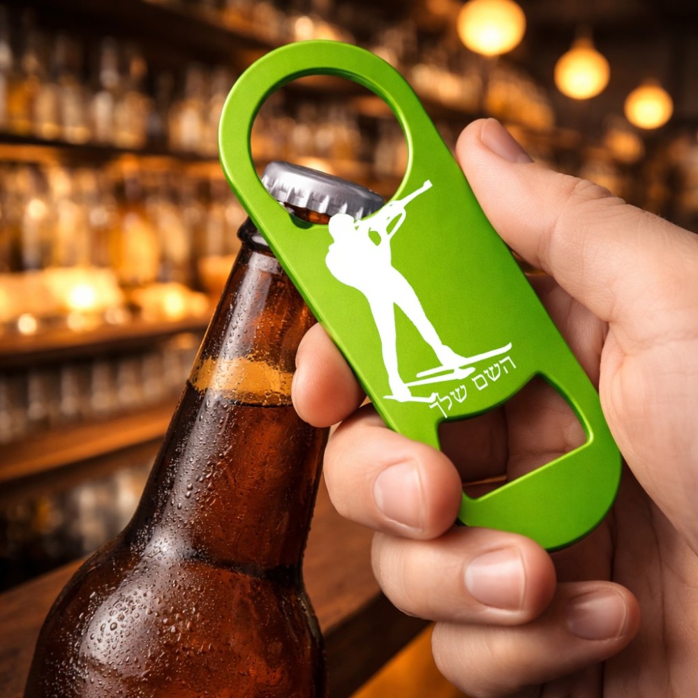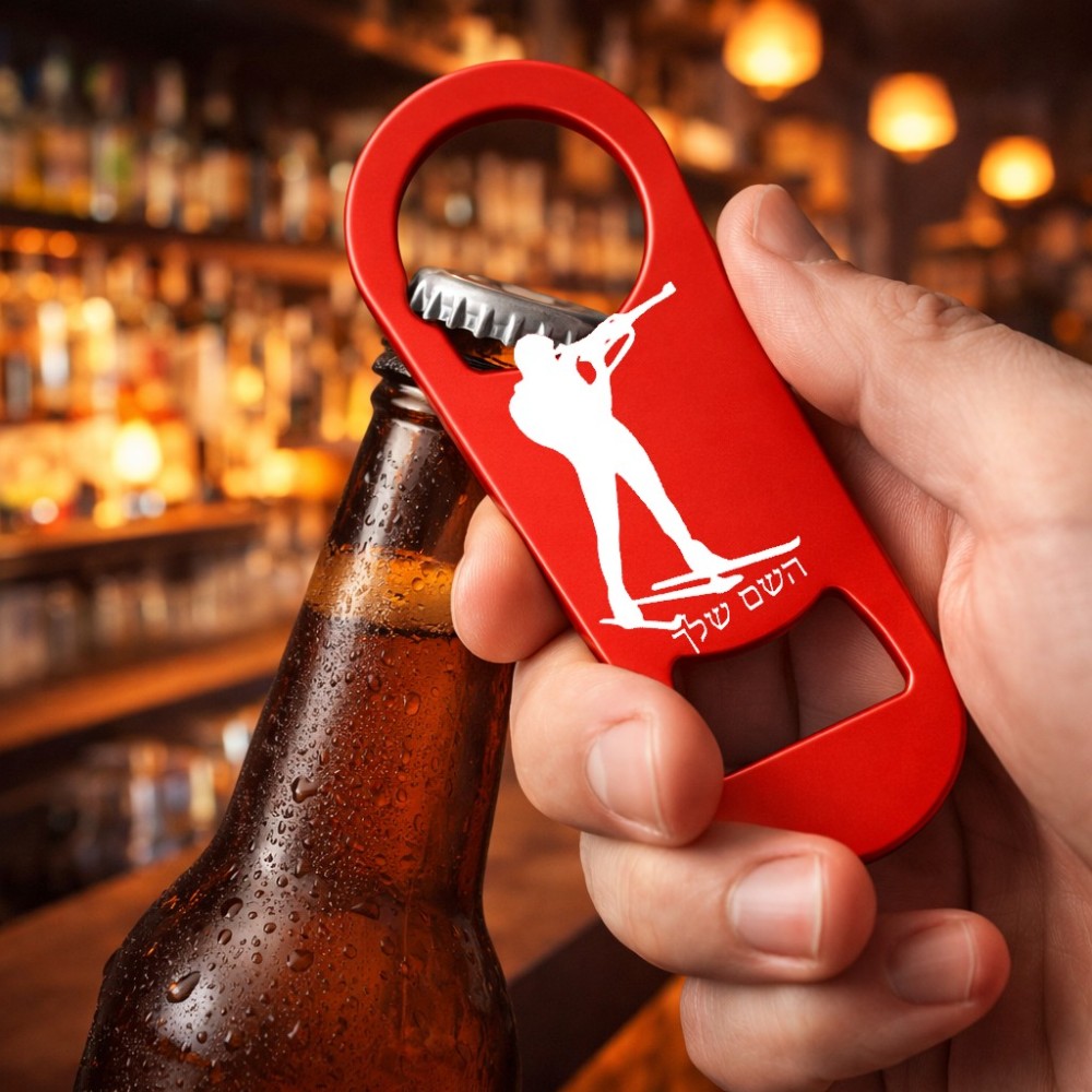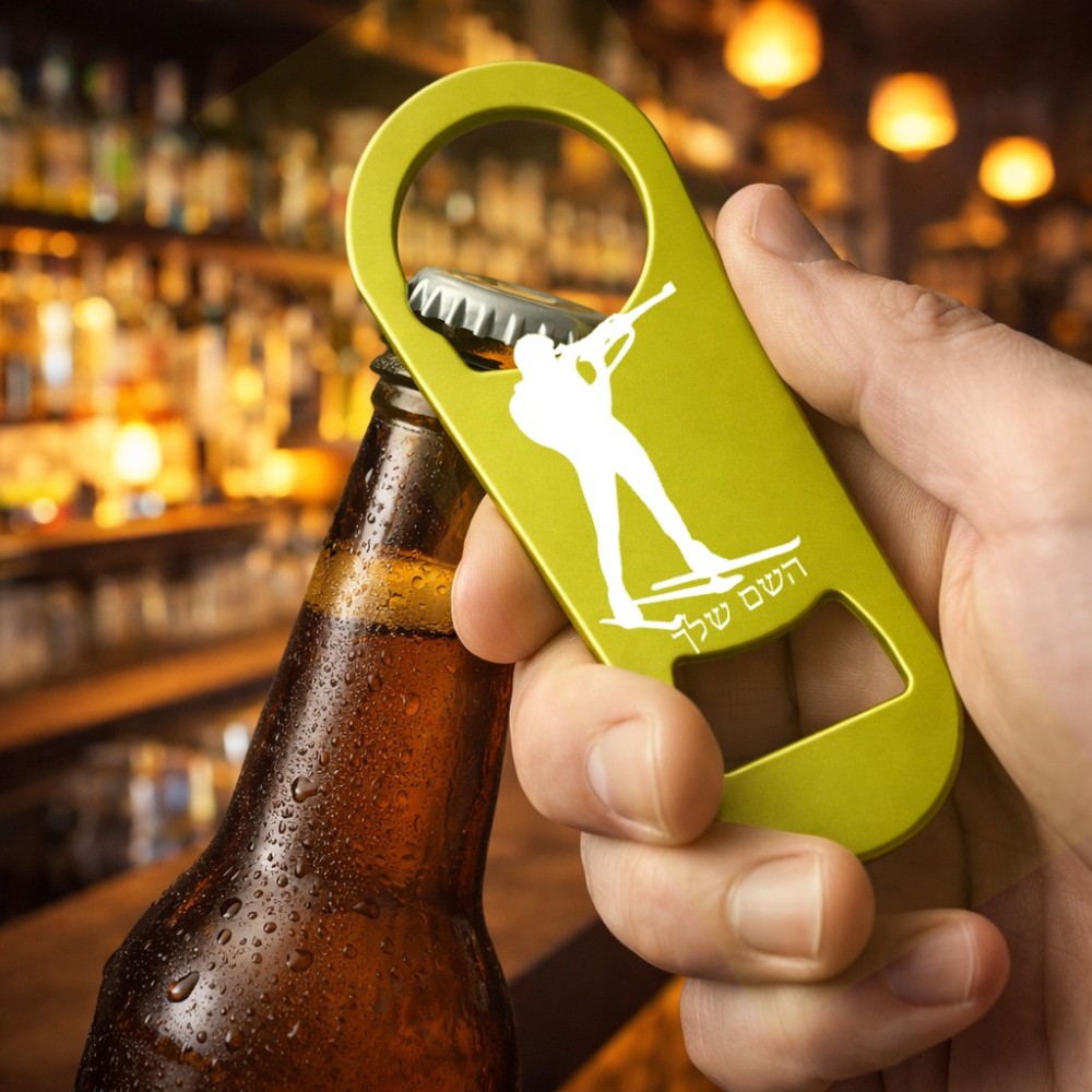 פותחן בקבוקים בעיצוב אישי עם השם שלך בעיצוב ביאתלון גודל הפותחן 3.2 × 8.7 ס"מ