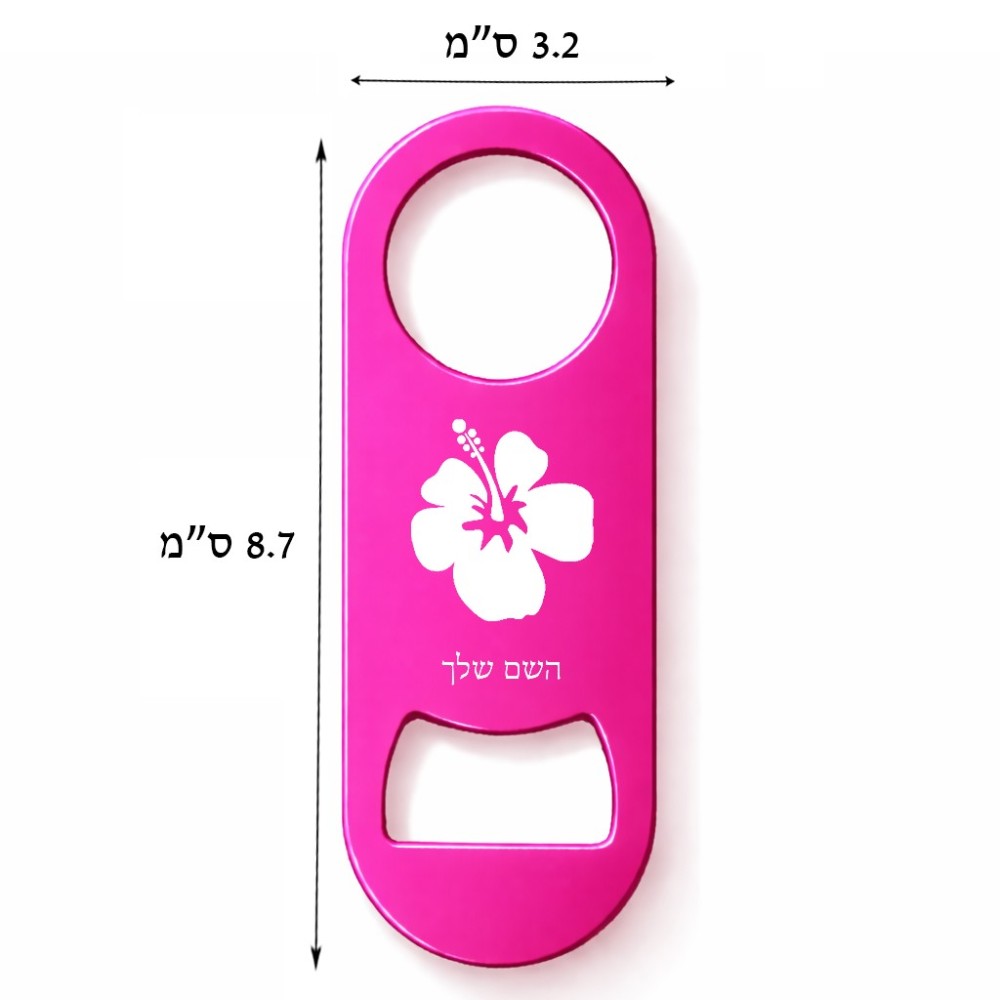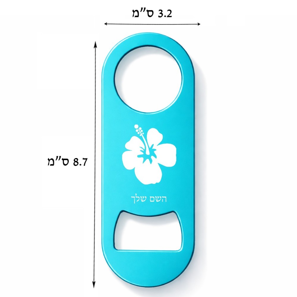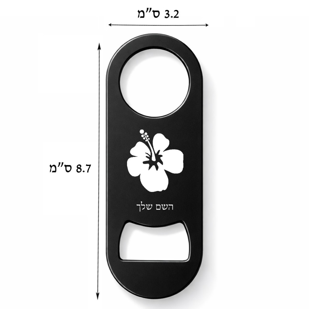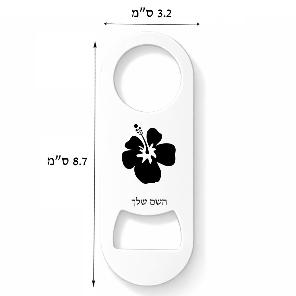 פותחן בקבוקים בעיצוב אישי עם השם שלך בעיצוב פרח היביסקוס גודל הפותחן 3.2 × 8.7 ס"מ
