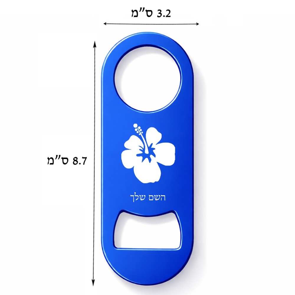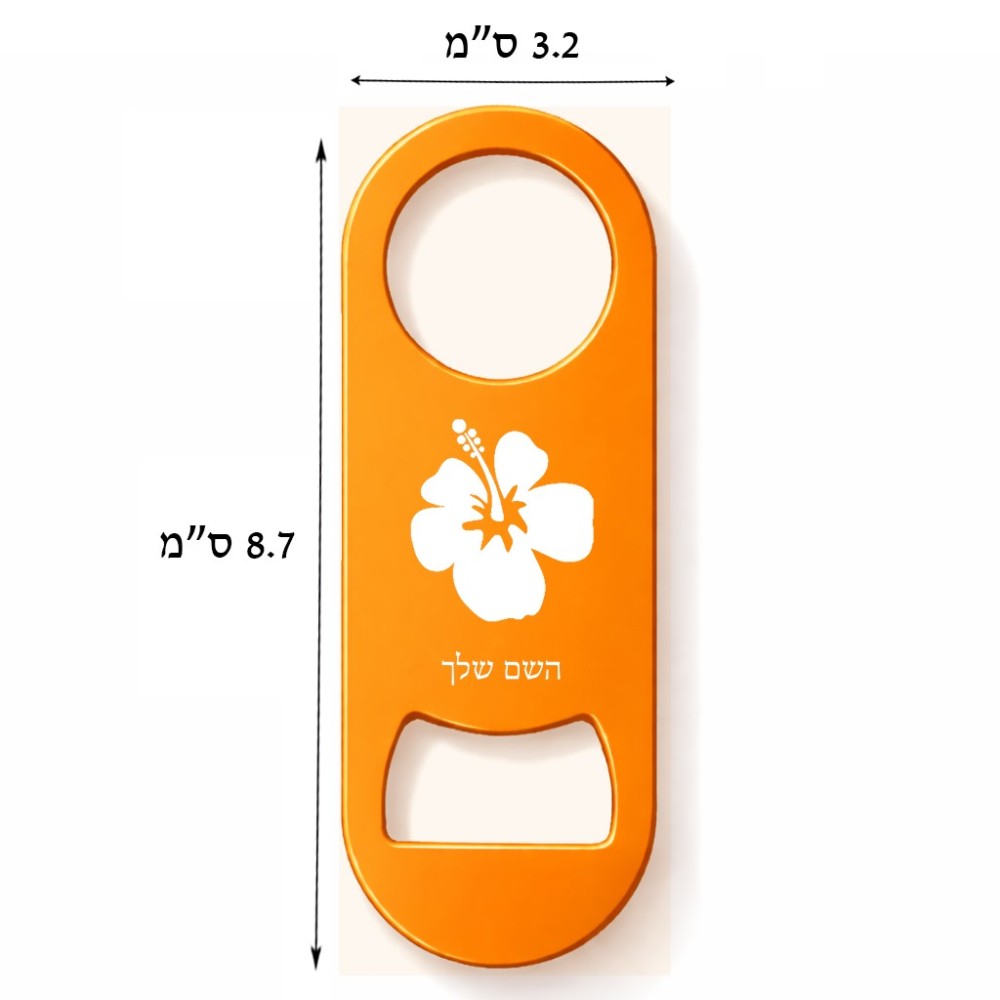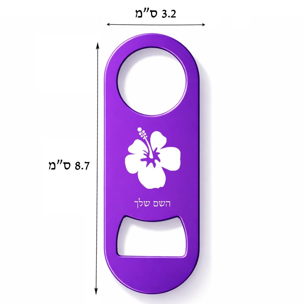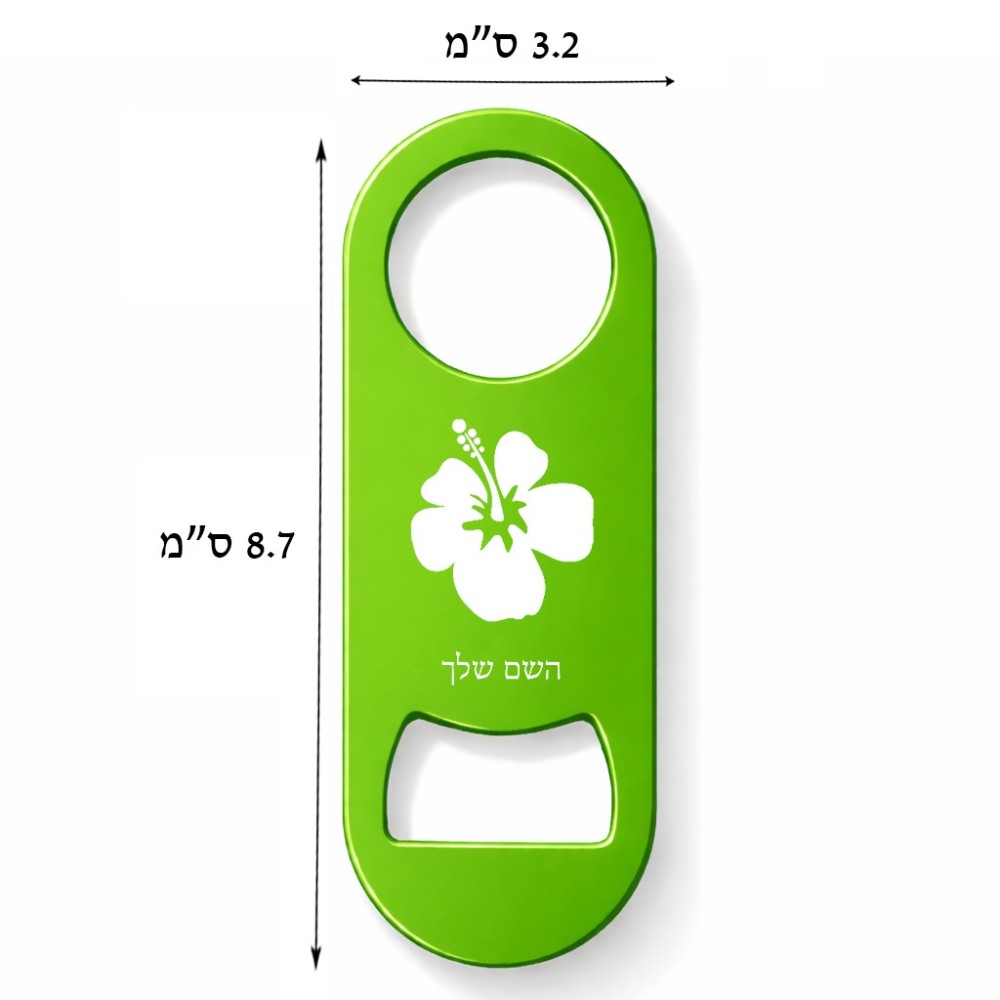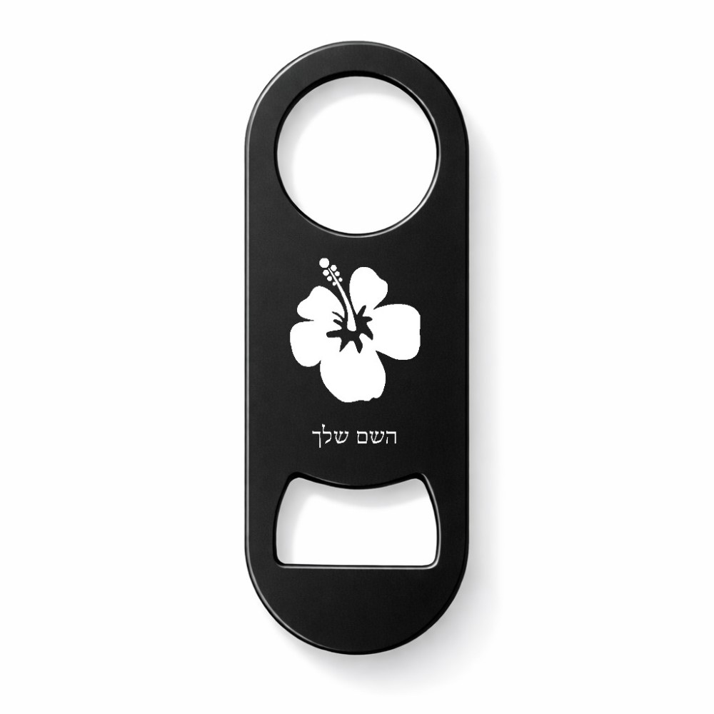 פותחן בקבוקים בעיצוב אישי עם השם שלך בעיצוב פרח היביסקוס גודל הפותחן 3.2 × 8.7 ס"מ