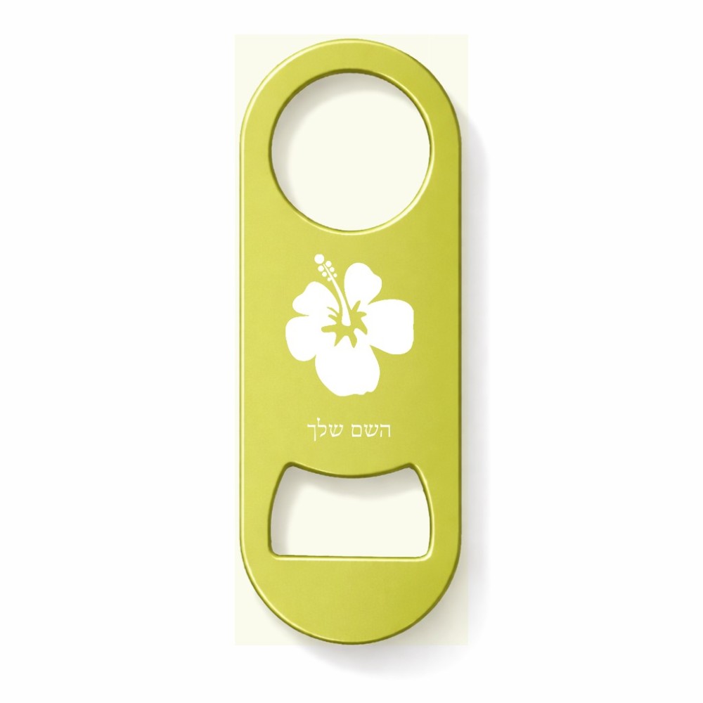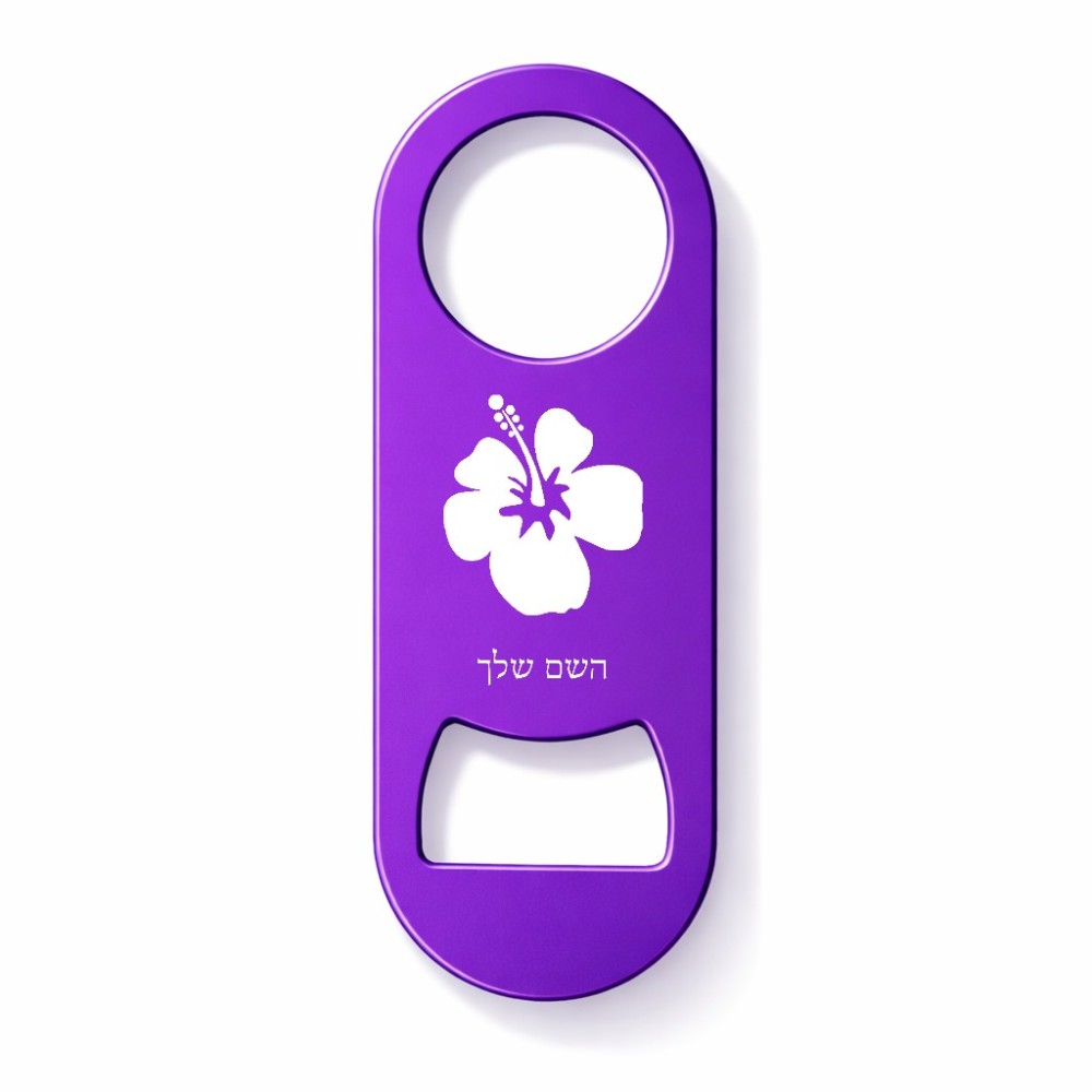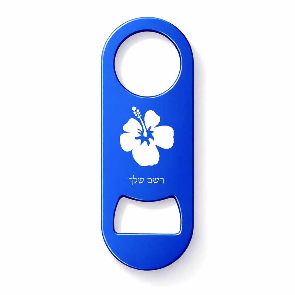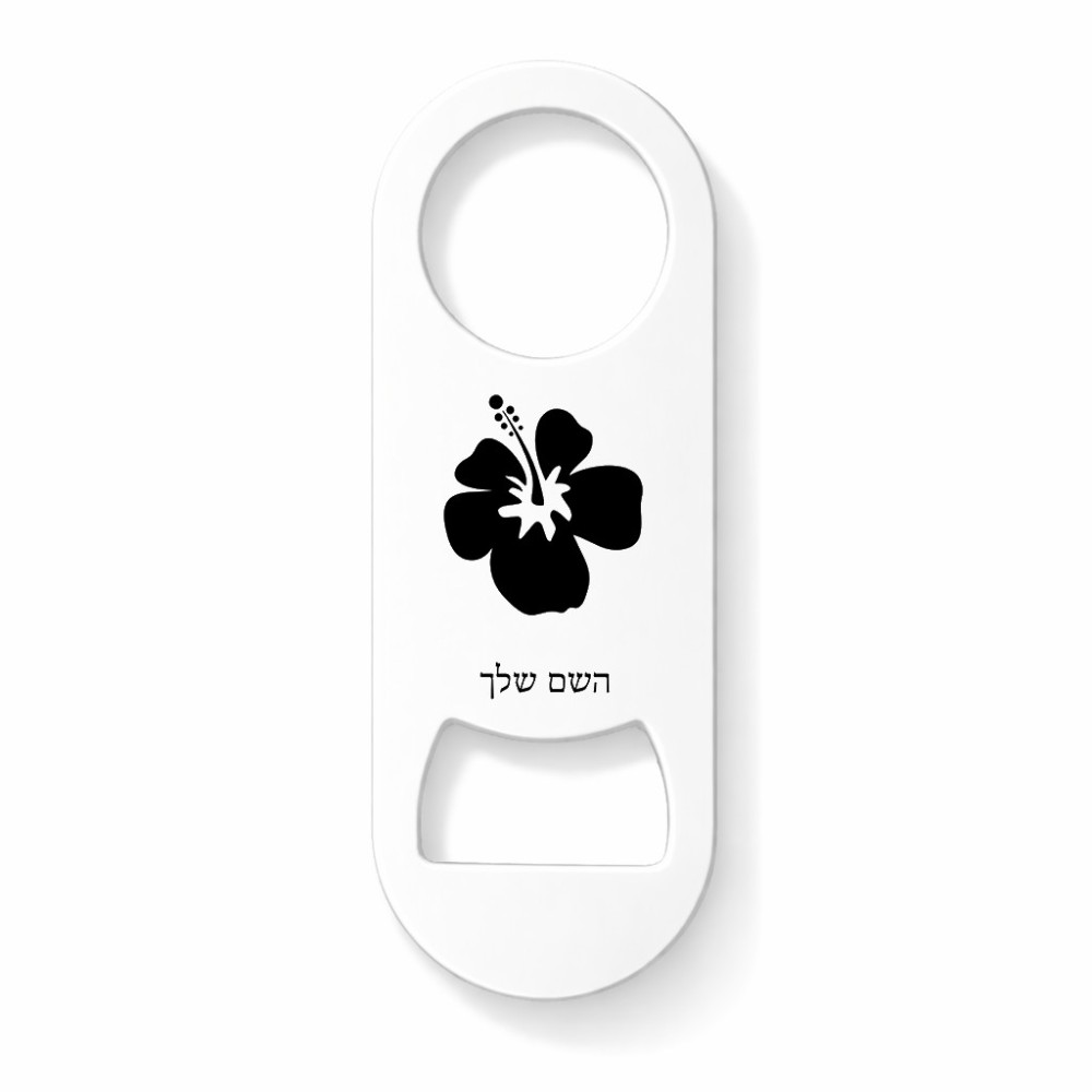 פותחן בקבוקים בעיצוב אישי עם השם שלך בעיצוב פרח היביסקוס גודל הפותחן 3.2 × 8.7 ס"מ