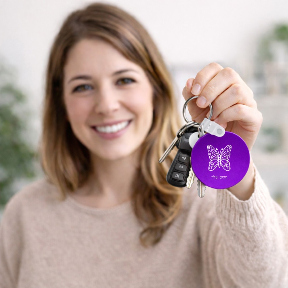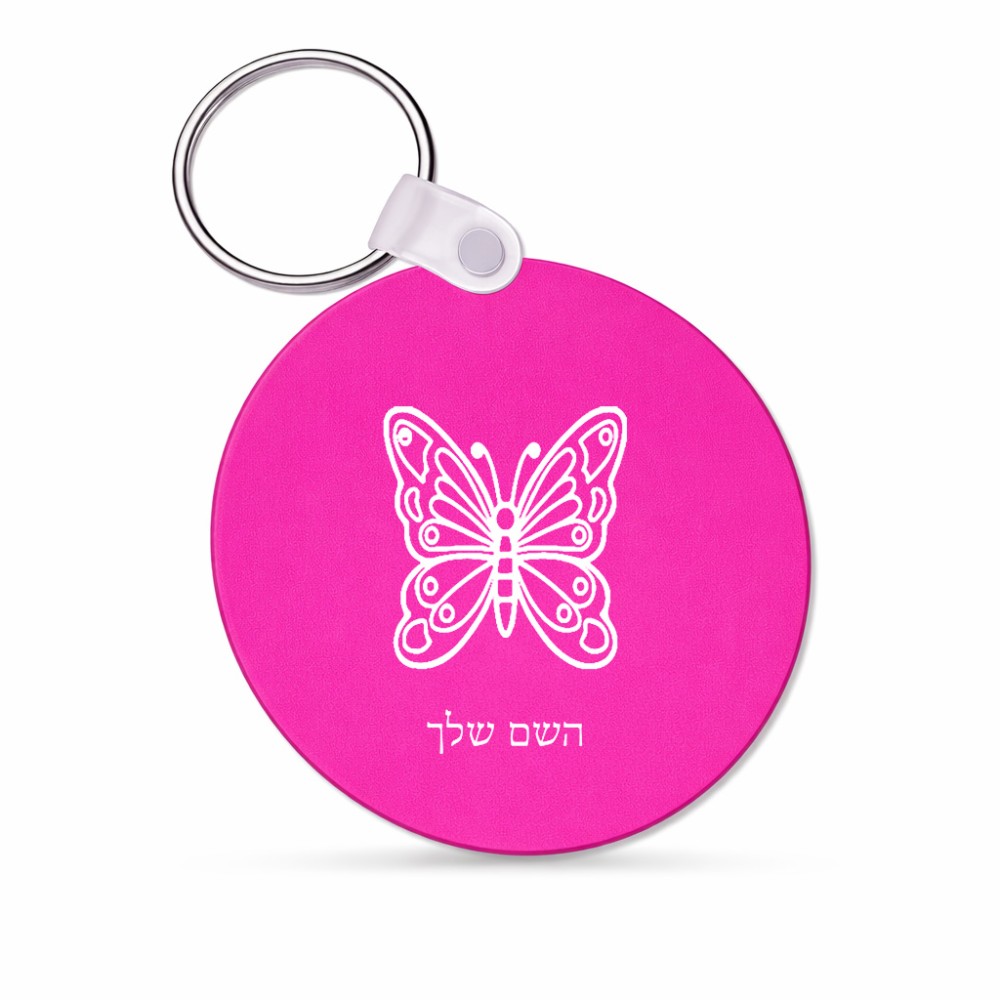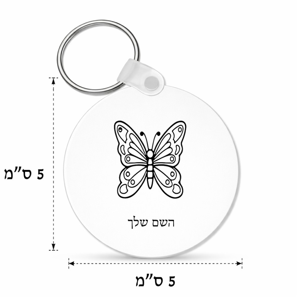מחזיק מפתחות בצורת עיגול בעיצוב אישי עם השם שלך בעיצוב פרפר גודל המחזיק 5 × 5 ס"מ. את השם המבוקש ניתן לציין בהזמנה, אם לא צויין אנחנו ניצור קשר לבירור.