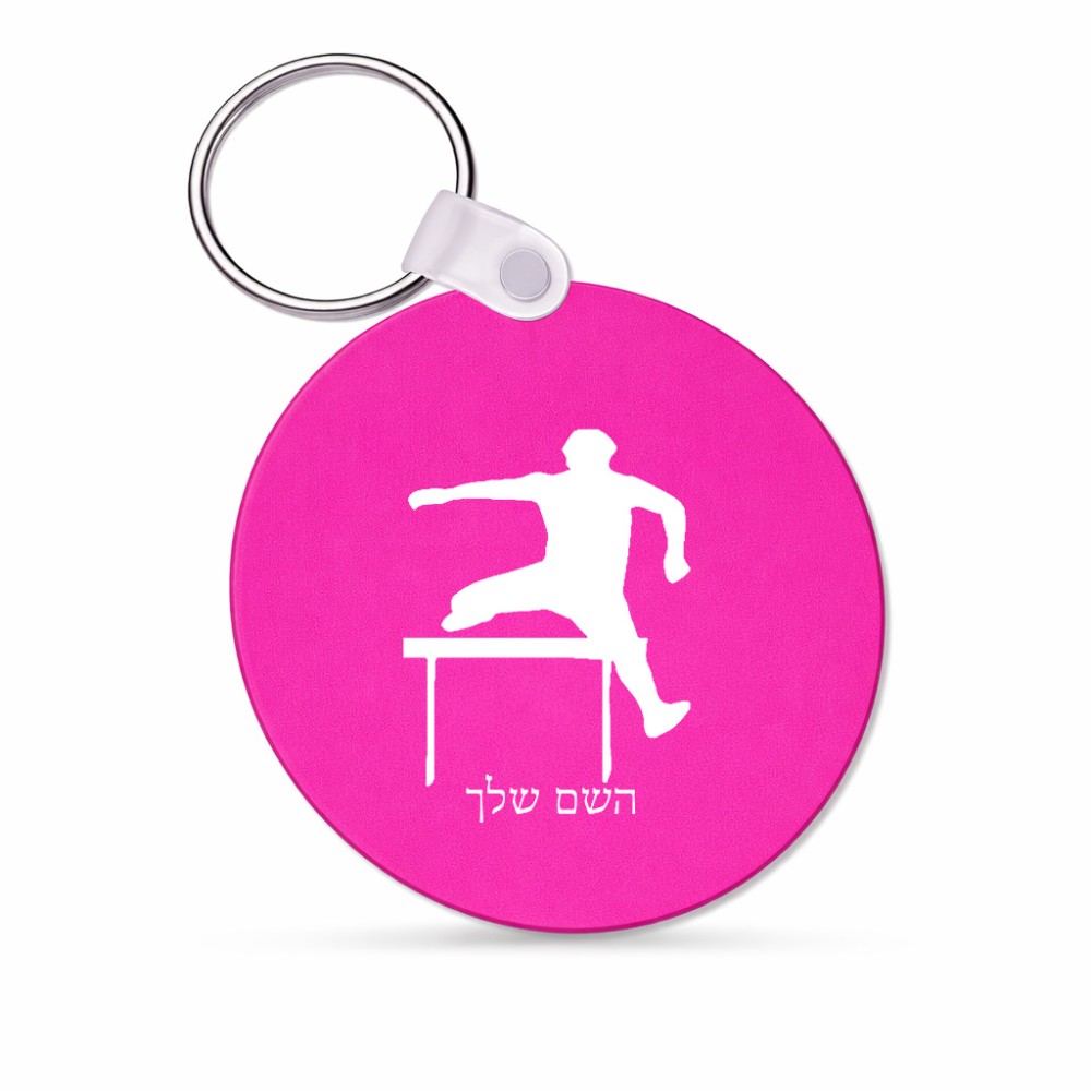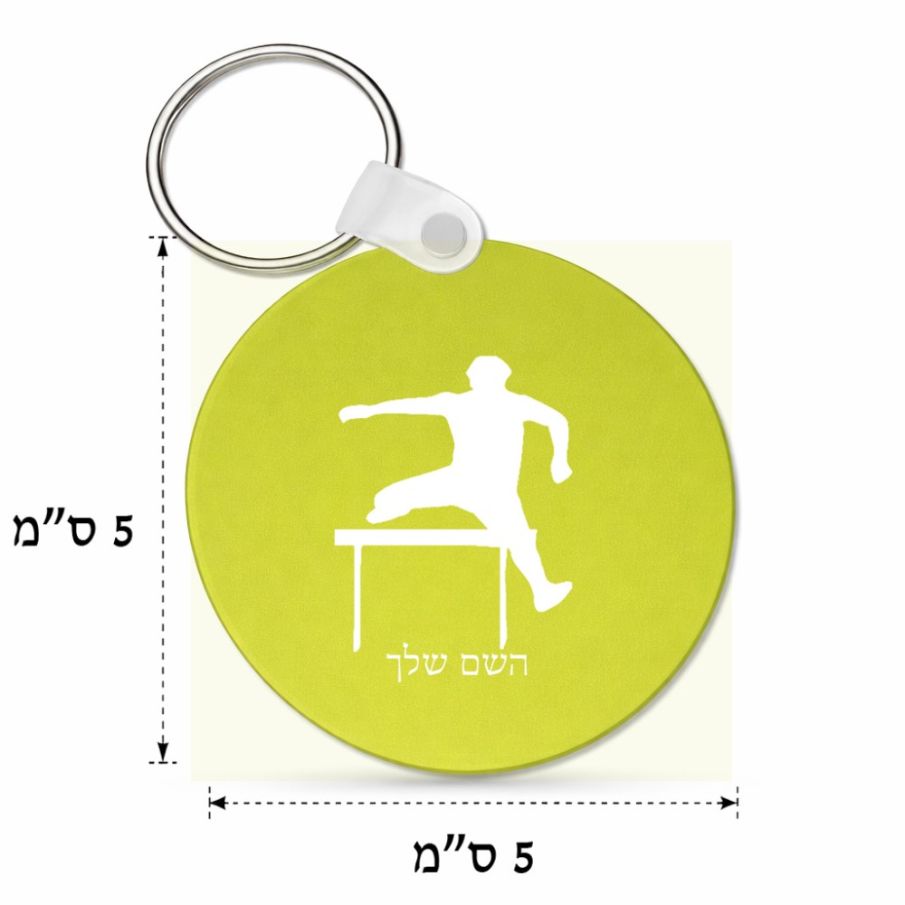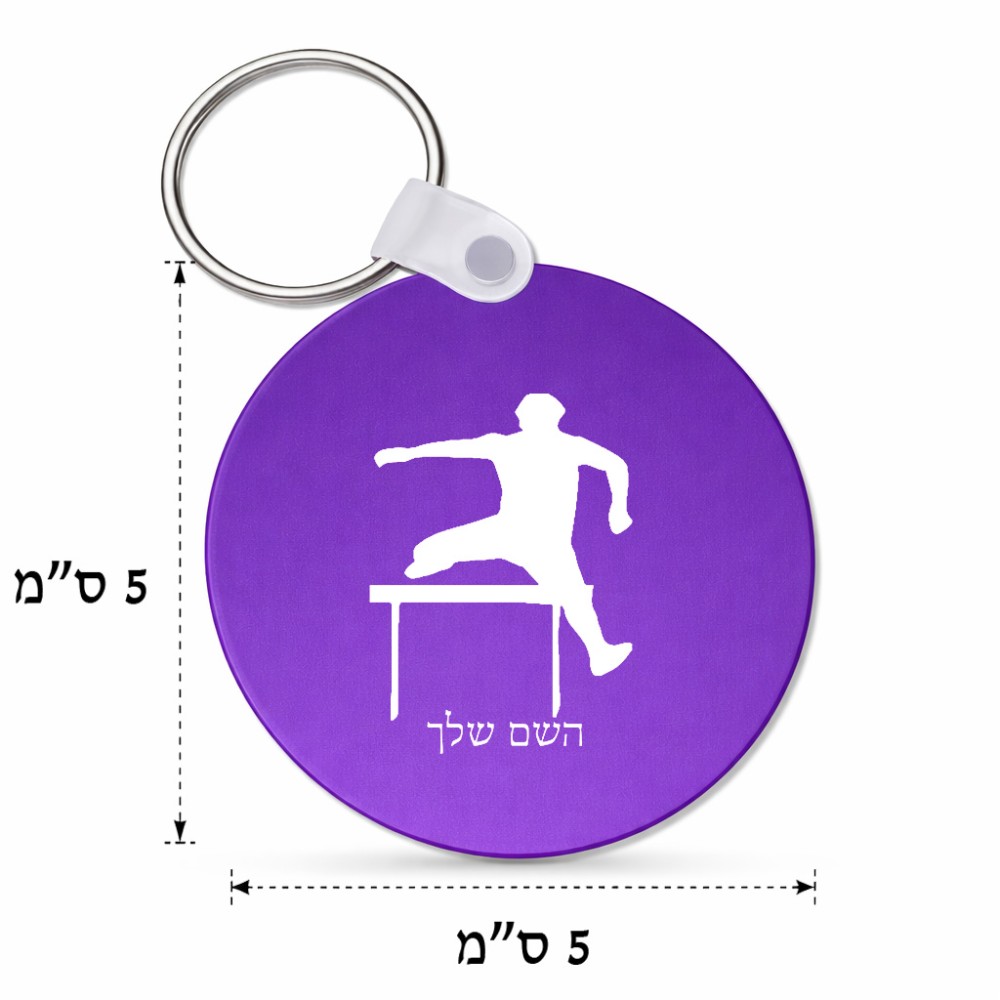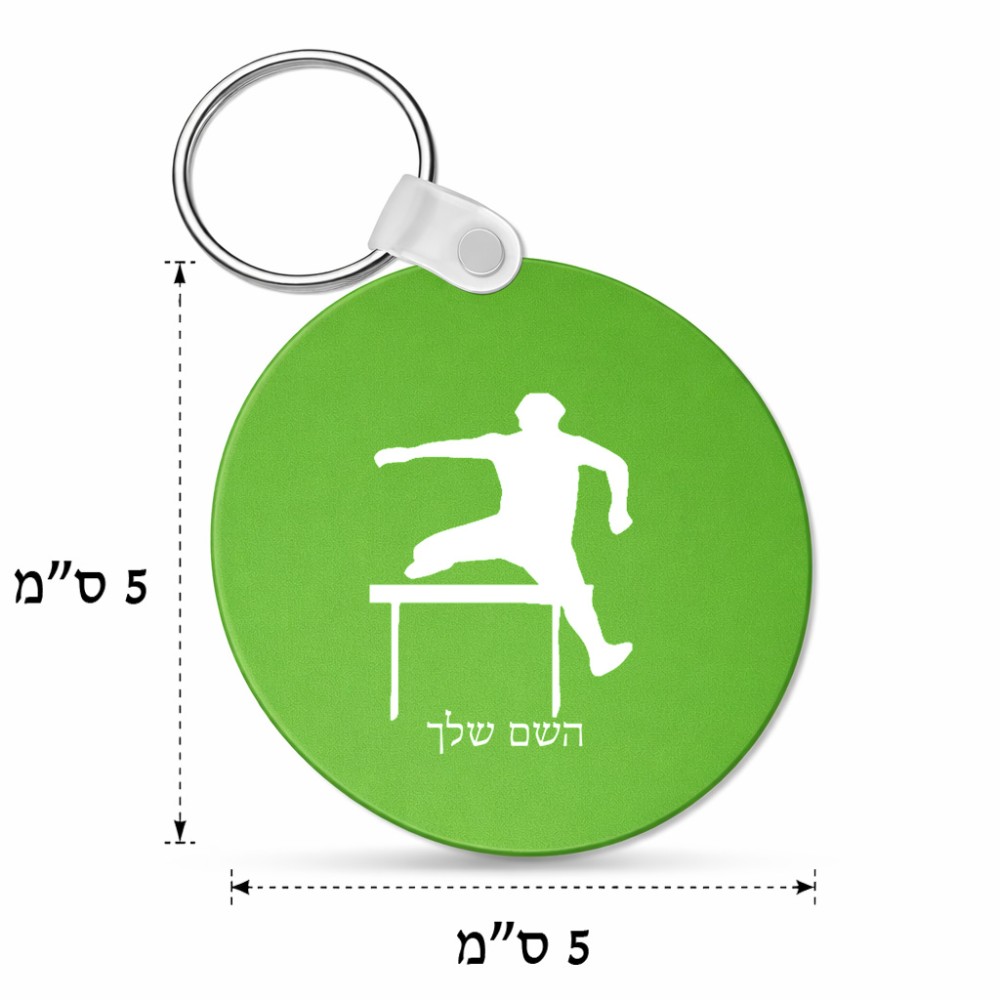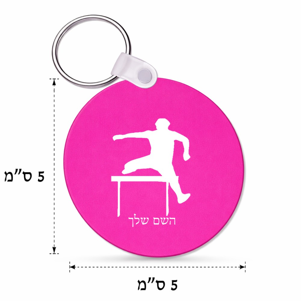 מחזיק מפתחות בצורת עיגול בעיצוב אישי עם השם שלך בעיצוב קפיצת משוכות גודל המחזיק 5 × 5 ס"מ. את השם המבוקש ניתן לציין בהזמנה, אם לא צויין אנחנו ניצור קשר לבירור.