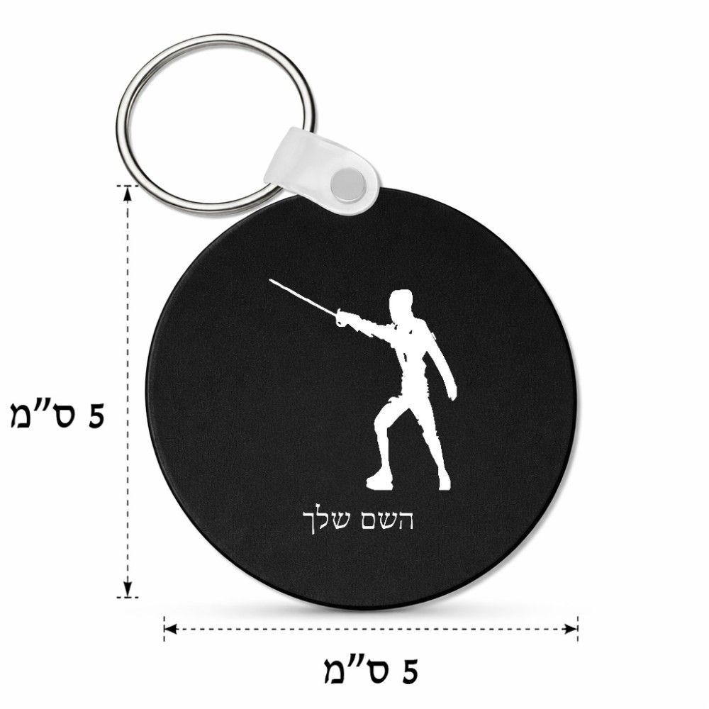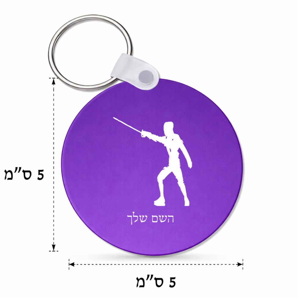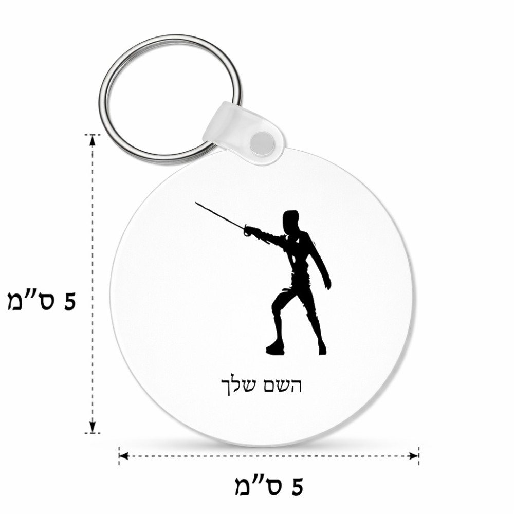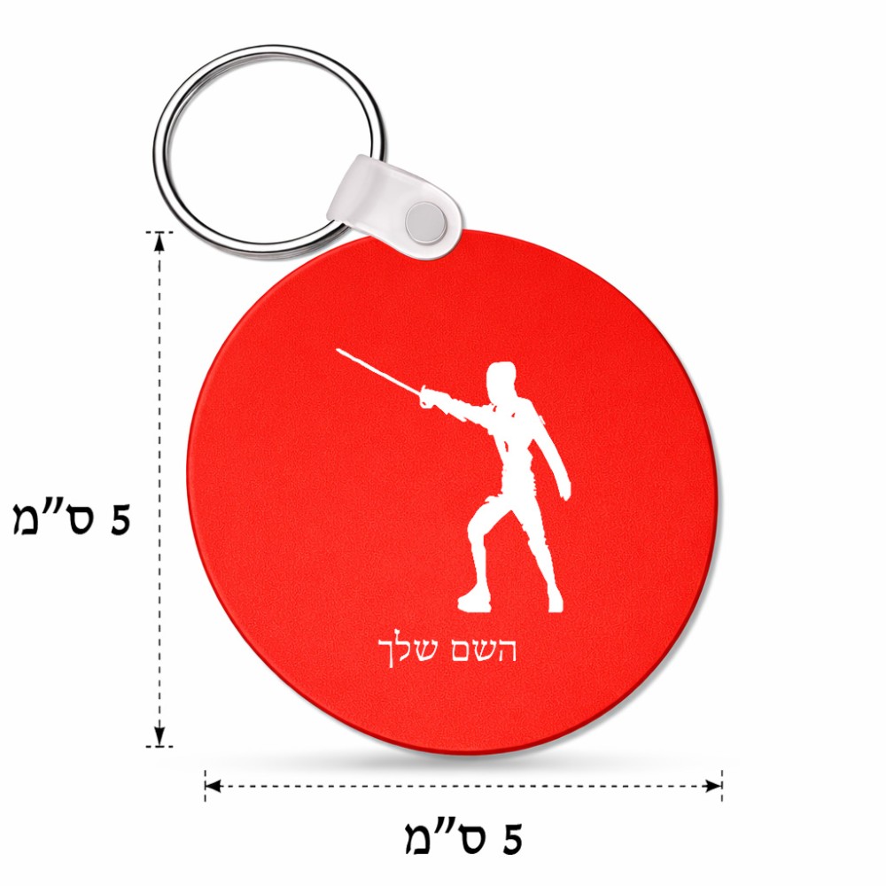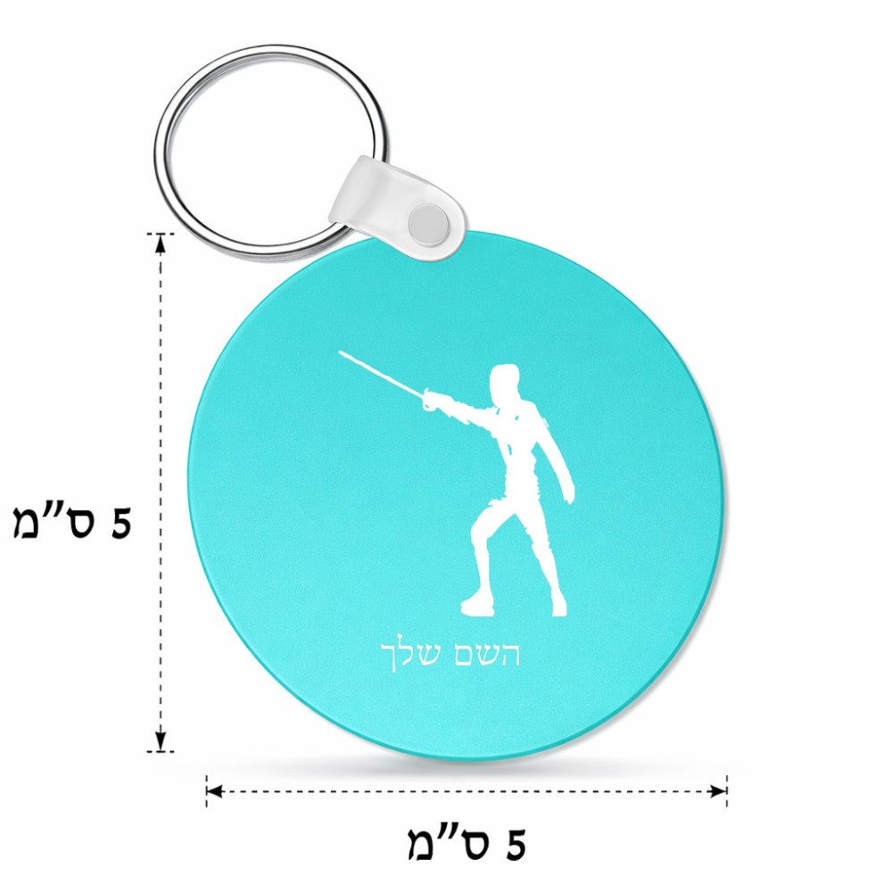 מחזיק מפתחות בצורת עיגול בעיצוב אישי עם השם שלך בעיצוב לוחם סייף גודל המחזיק 5 × 5 ס"מ. את השם המבוקש ניתן לציין בהזמנה, אם לא צויין אנחנו ניצור קשר לבירור.
