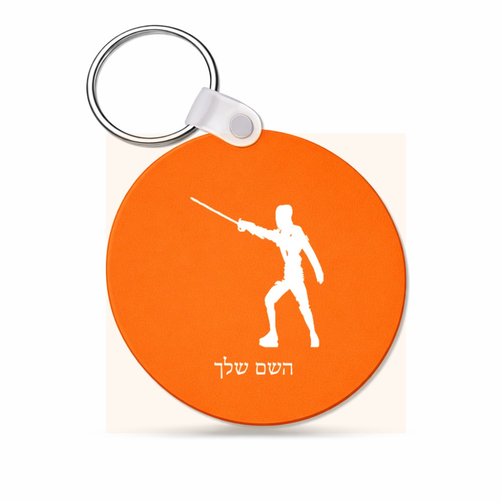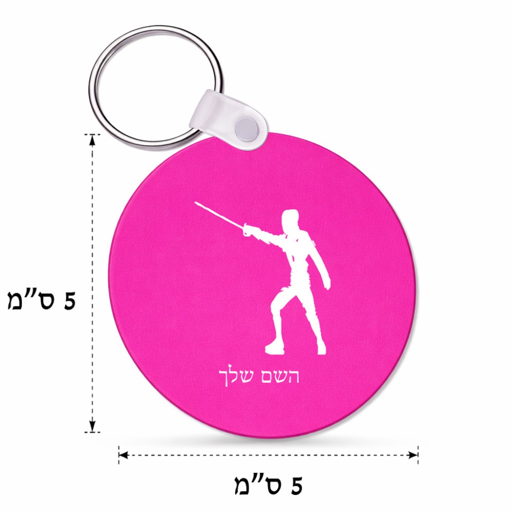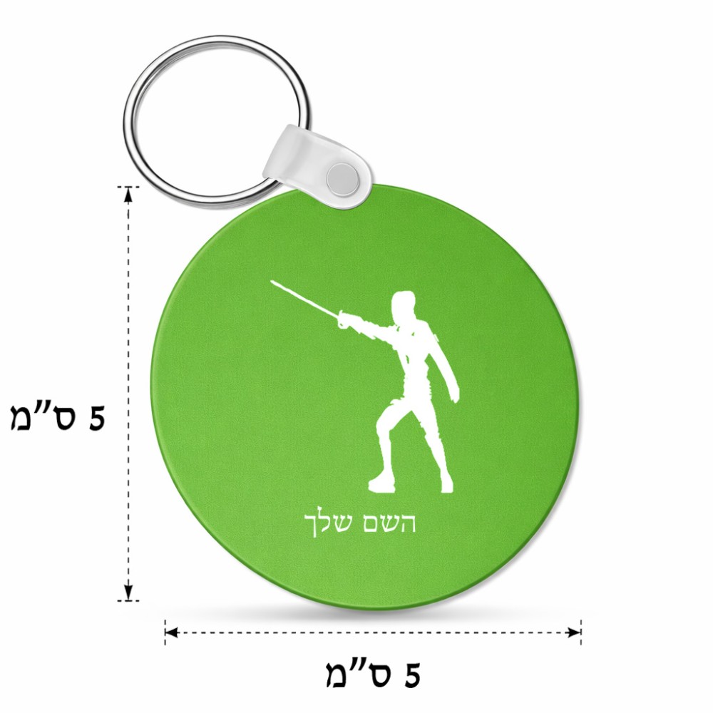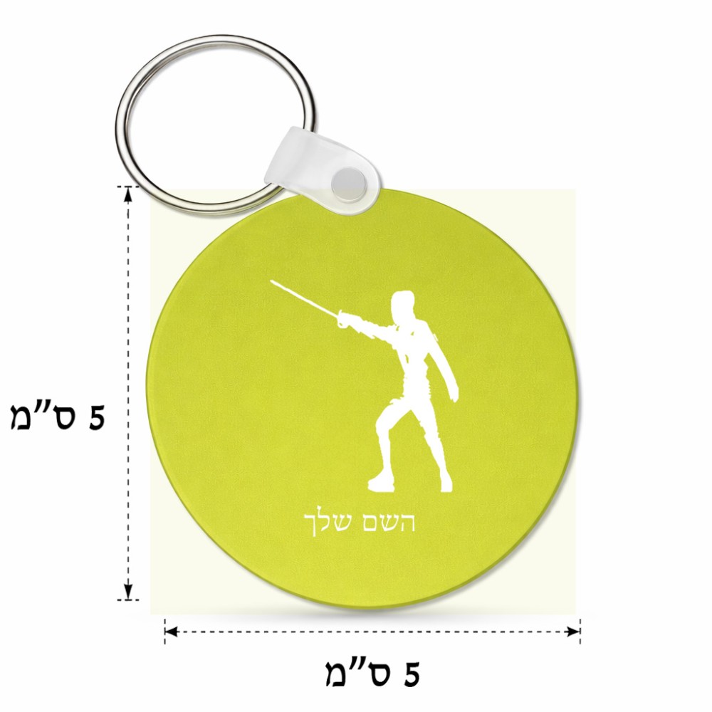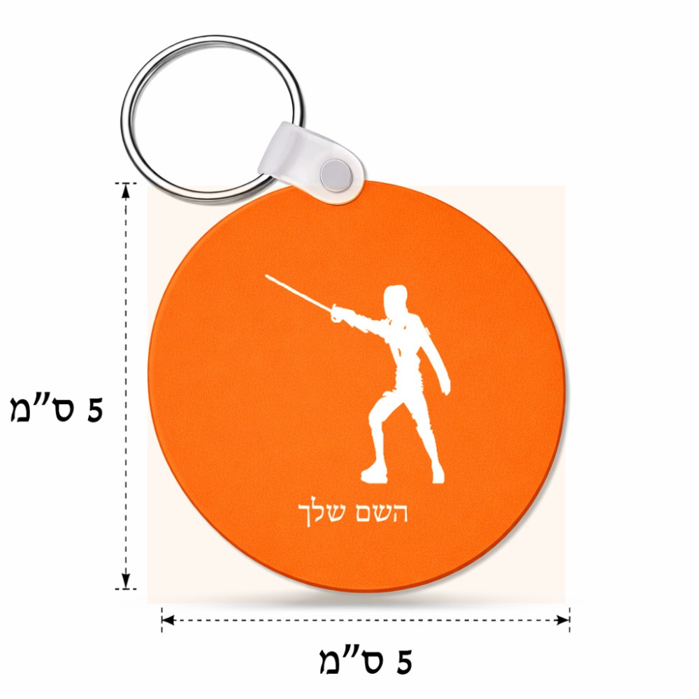 מחזיק מפתחות בצורת עיגול בעיצוב אישי עם השם שלך בעיצוב לוחם סייף גודל המחזיק 5 × 5 ס"מ. את השם המבוקש ניתן לציין בהזמנה, אם לא צויין אנחנו ניצור קשר לבירור.
