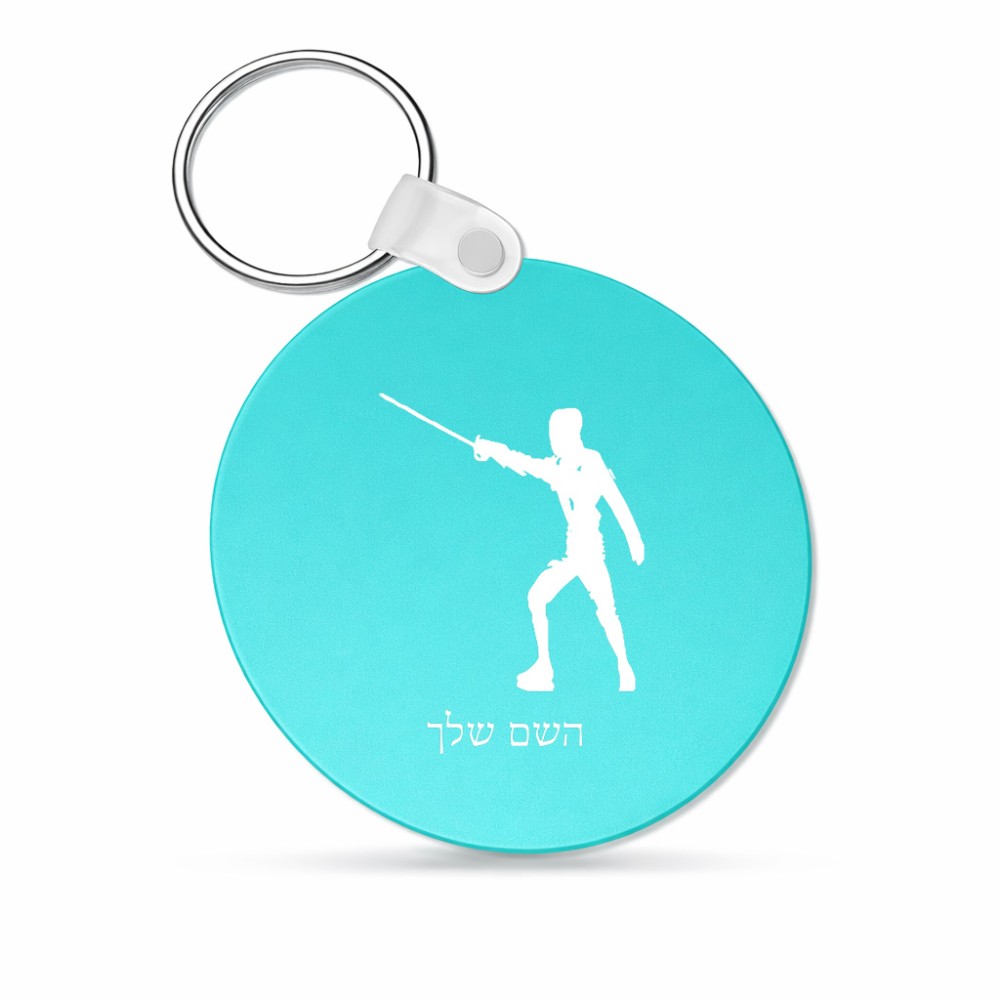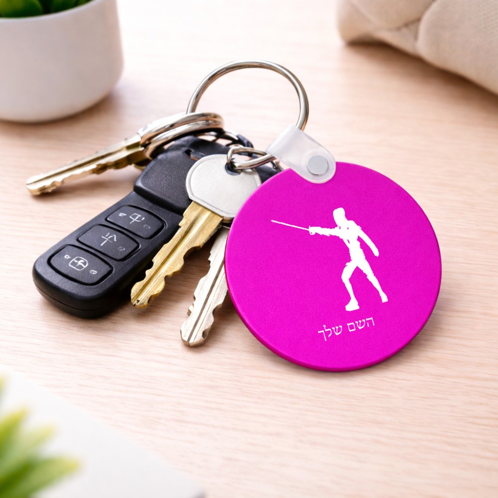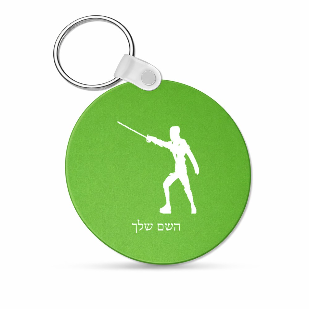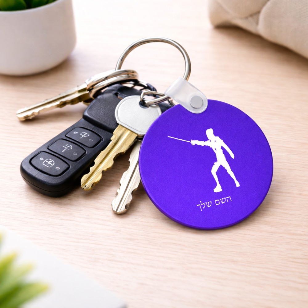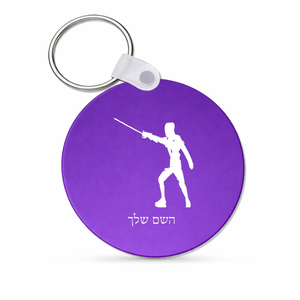 מחזיק מפתחות בצורת עיגול בעיצוב אישי עם השם שלך בעיצוב לוחם סייף גודל המחזיק 5 × 5 ס"מ. את השם המבוקש ניתן לציין בהזמנה, אם לא צויין אנחנו ניצור קשר לבירור.