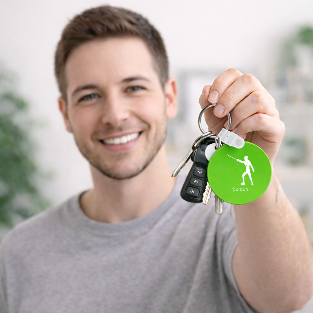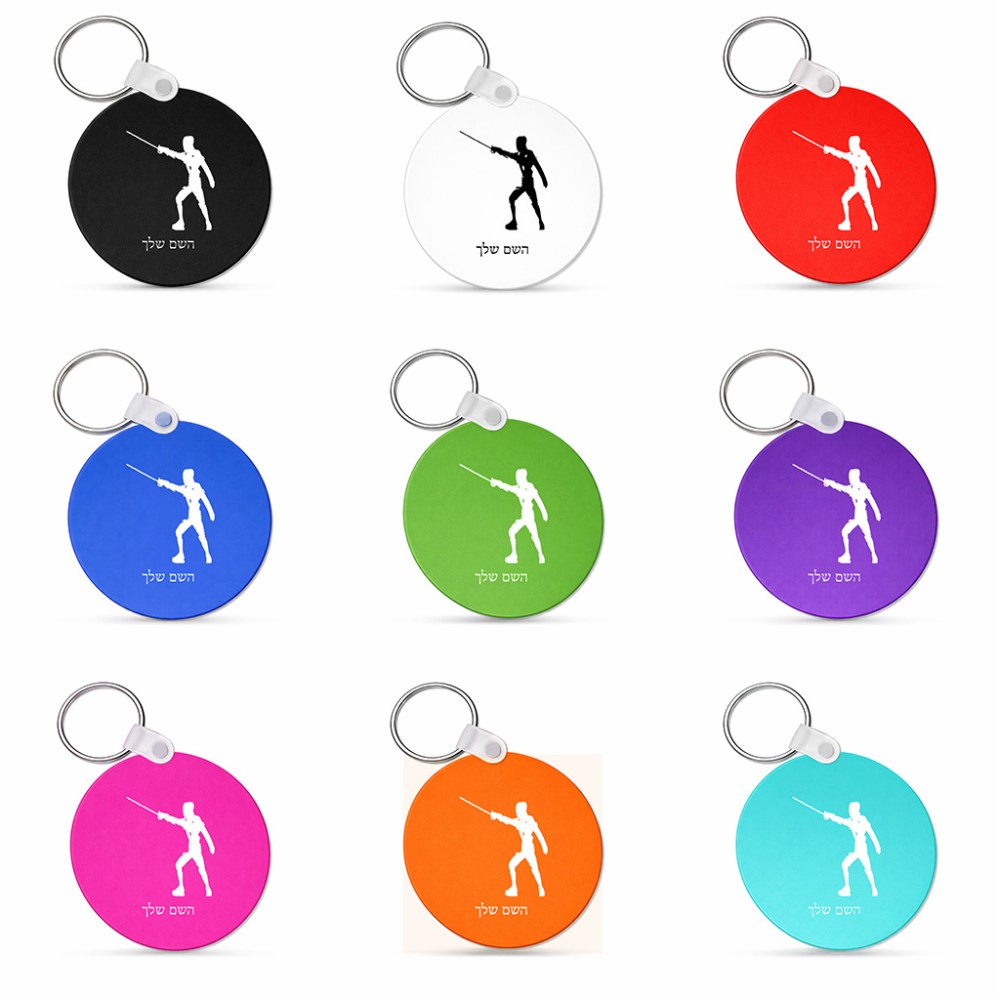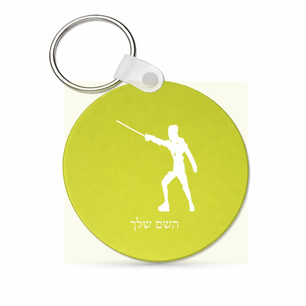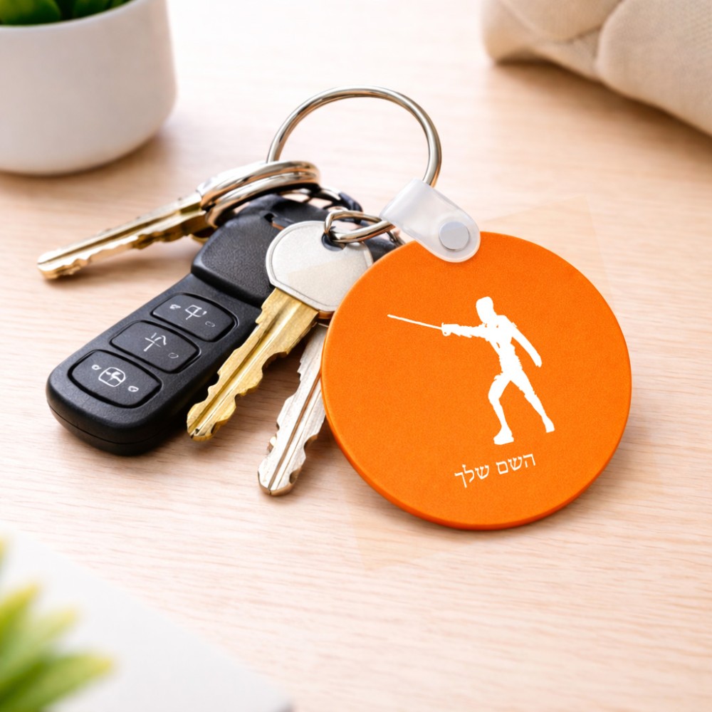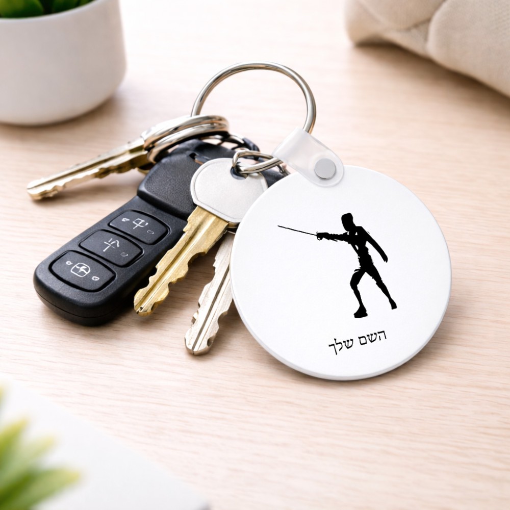 מחזיק מפתחות בצורת עיגול בעיצוב אישי עם השם שלך בעיצוב לוחם סייף גודל המחזיק 5 × 5 ס"מ. את השם המבוקש ניתן לציין בהזמנה, אם לא צויין אנחנו ניצור קשר לבירור.