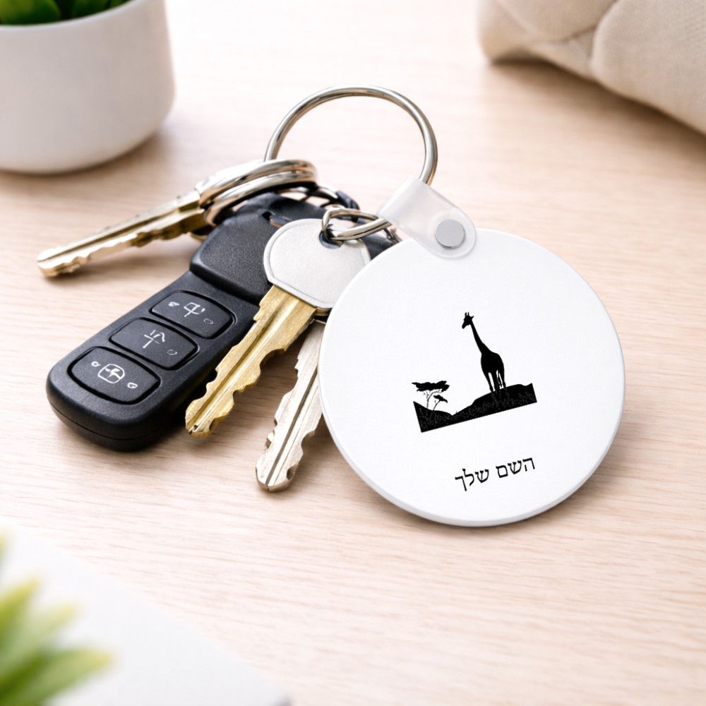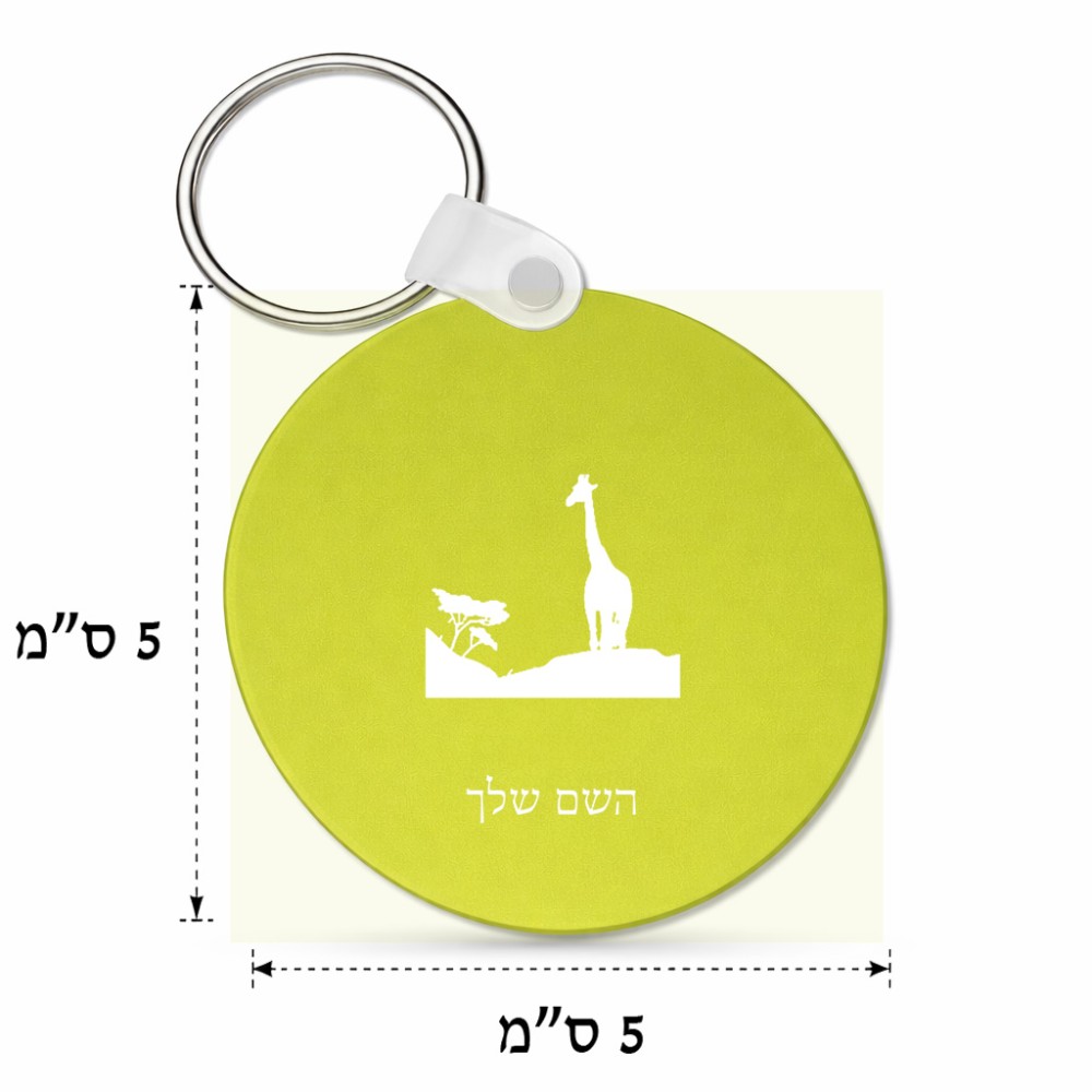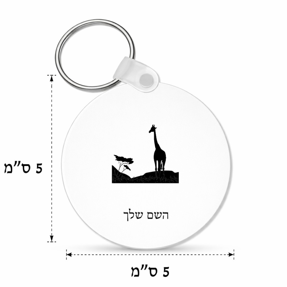 מחזיק מפתחות בצורת עיגול בעיצוב אישי עם השם שלך בעיצוב ג'ירפה באפריקה גודל המחזיק 5 × 5 ס"מ. את השם המבוקש ניתן לציין בהזמנה, אם לא צויין אנחנו ניצור קשר לבירור.