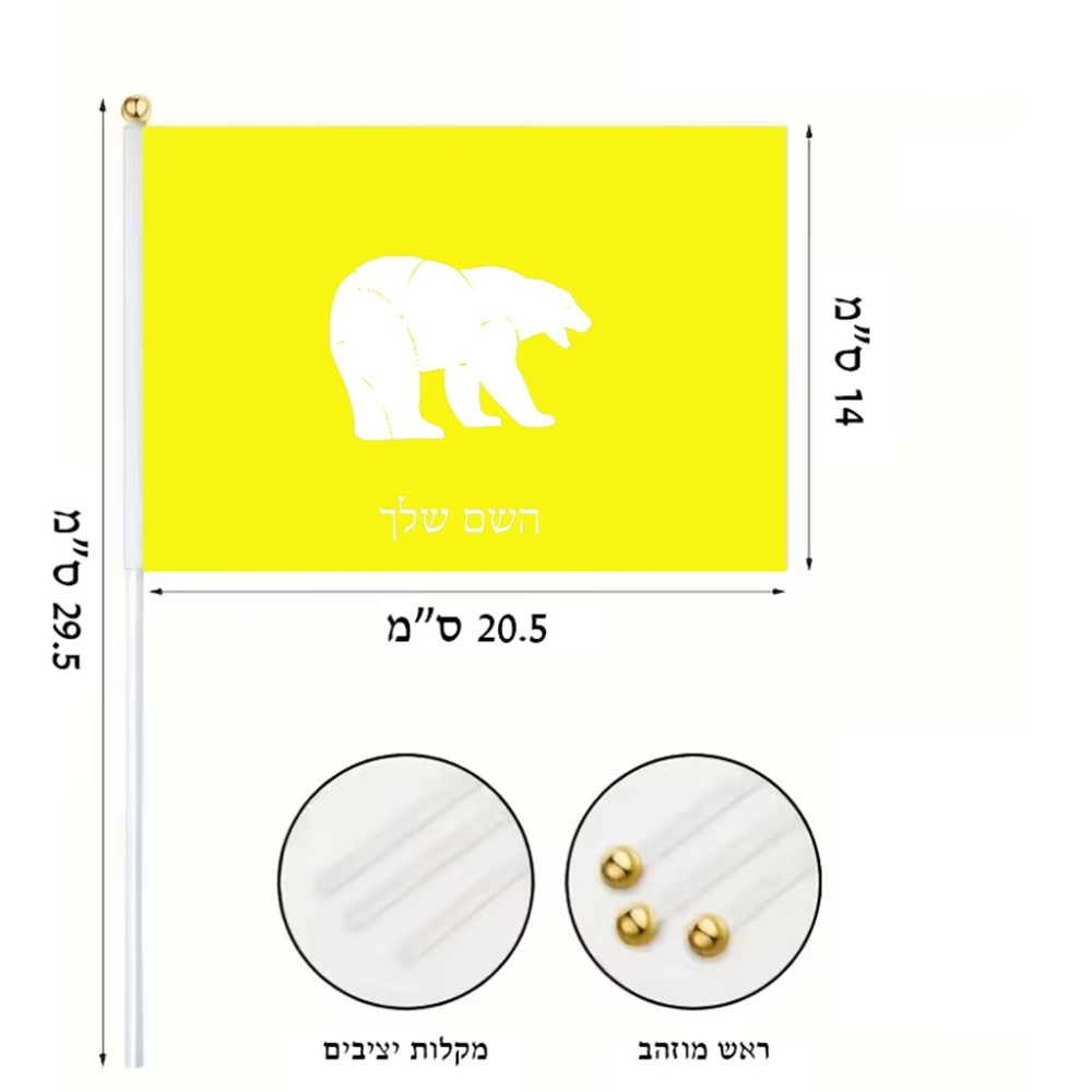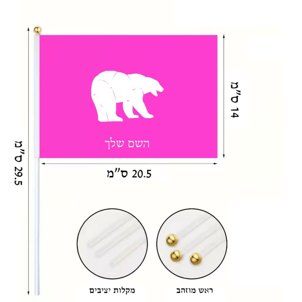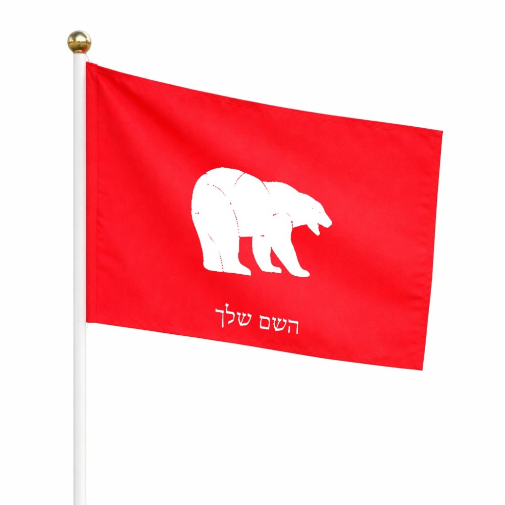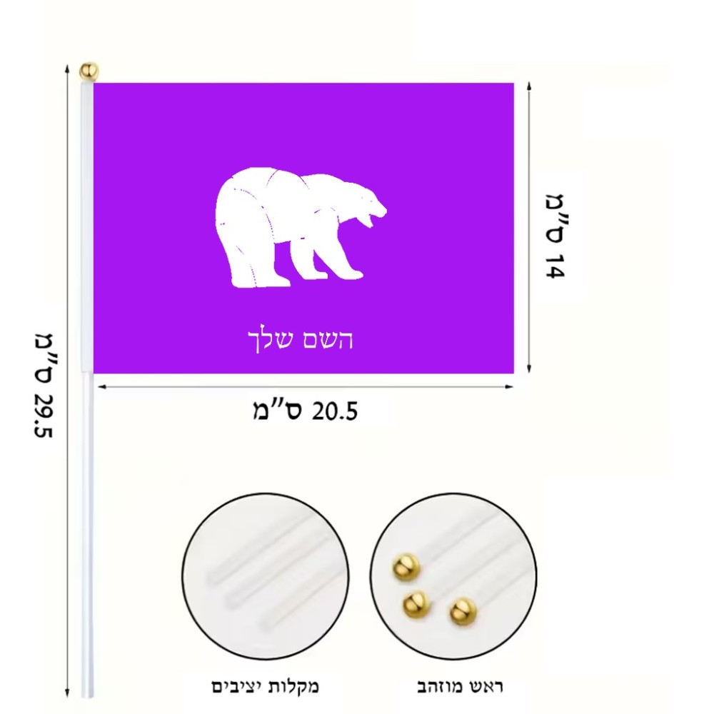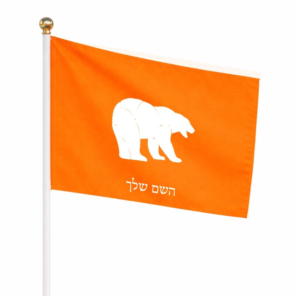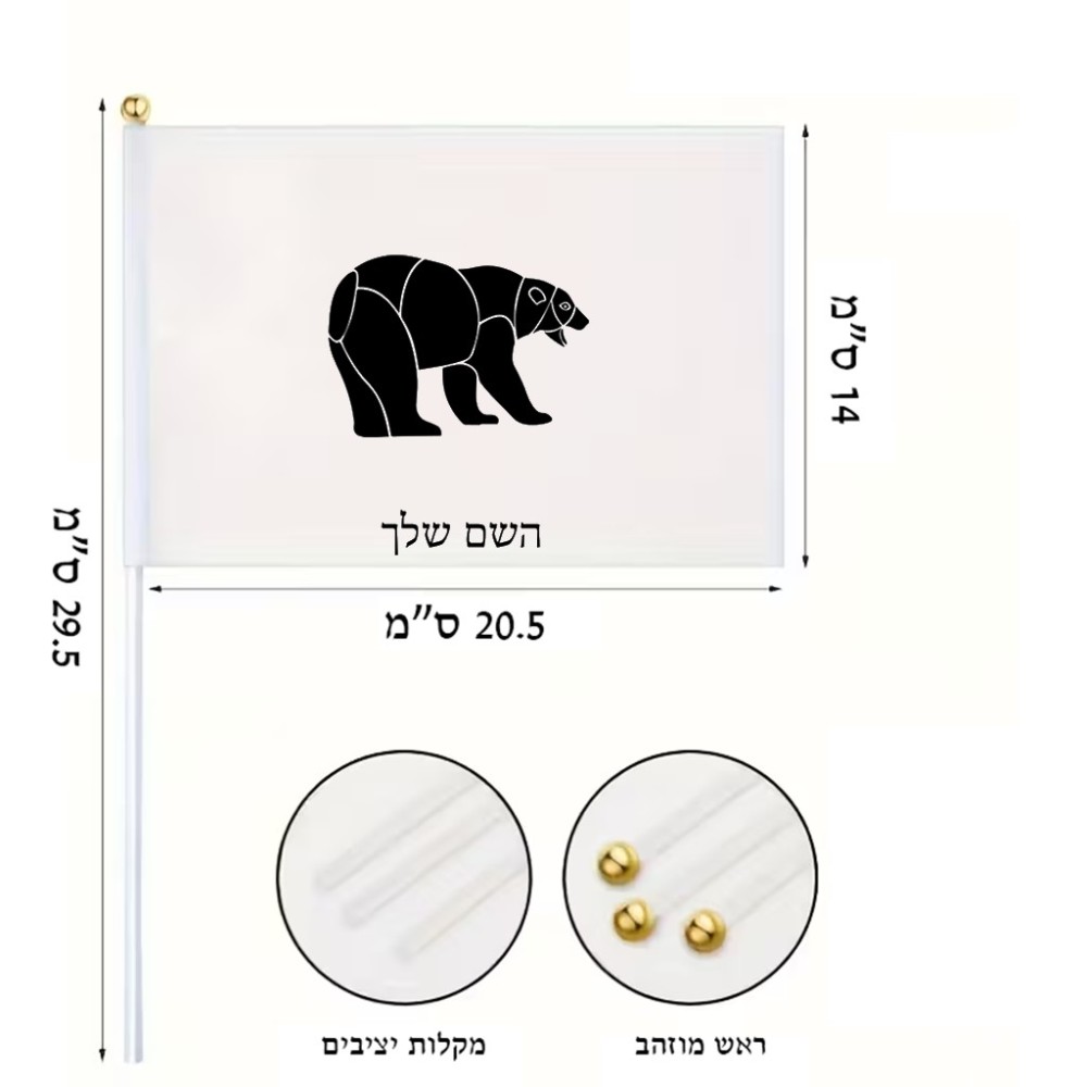 דיגלון בעיצוב אישי עם השם שלך בעיצוב דוב גודל הדיגלון 20.5 × 14 ס"מ, ההדפסה מתבצעת בשני צידי הדגל, את השם המבוקש ניתן לציין בהזמנה, אם לא צויין אנחנו ניצור קשר לבירור.