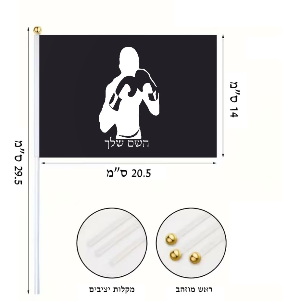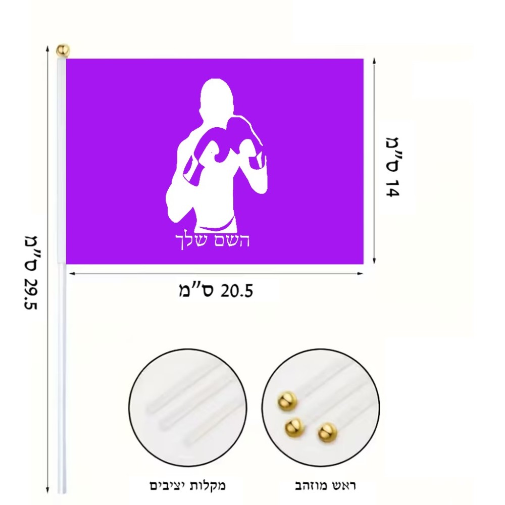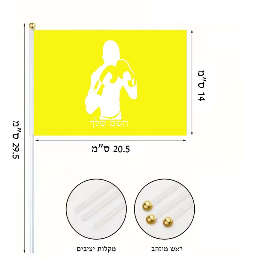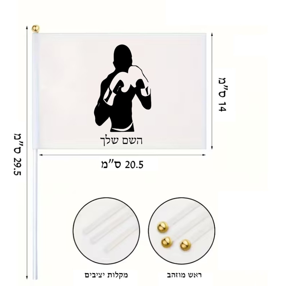 דיגלון בעיצוב אישי עם השם שלך בעיצוב אגרוף גודל הדיגלון 20.5 × 14 ס"מ, ההדפסה מתבצעת בשני צידי הדגל, את השם המבוקש ניתן לציין בהזמנה, אם לא צויין אנחנו ניצור קשר לבירור.