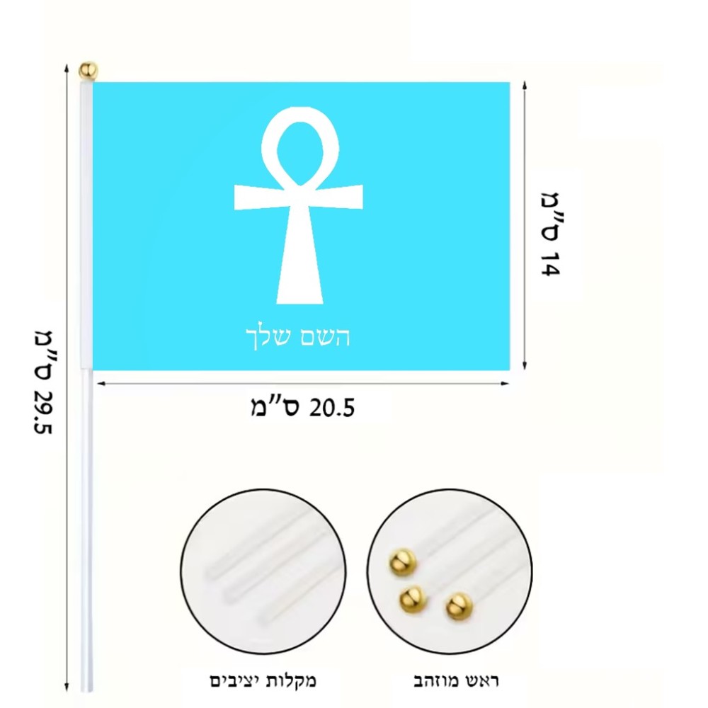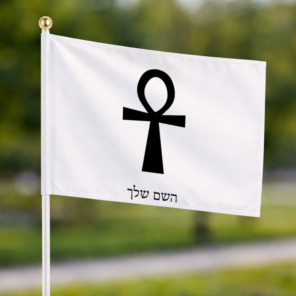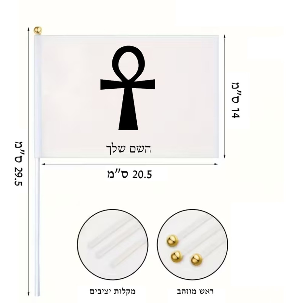 דיגלון בעיצוב אישי עם השם שלך בעיצוב אנק - מפתח החיים המצרי גודל הדיגלון 20.5 × 14 ס"מ, ההדפסה מתבצעת בשני צידי הדגל, את השם המבוקש ניתן לציין בהזמנה, אם לא צויין אנחנו ניצור קשר לבירור.