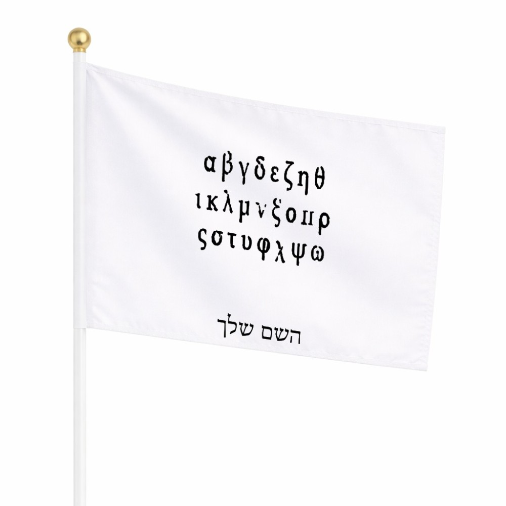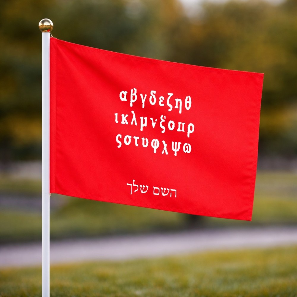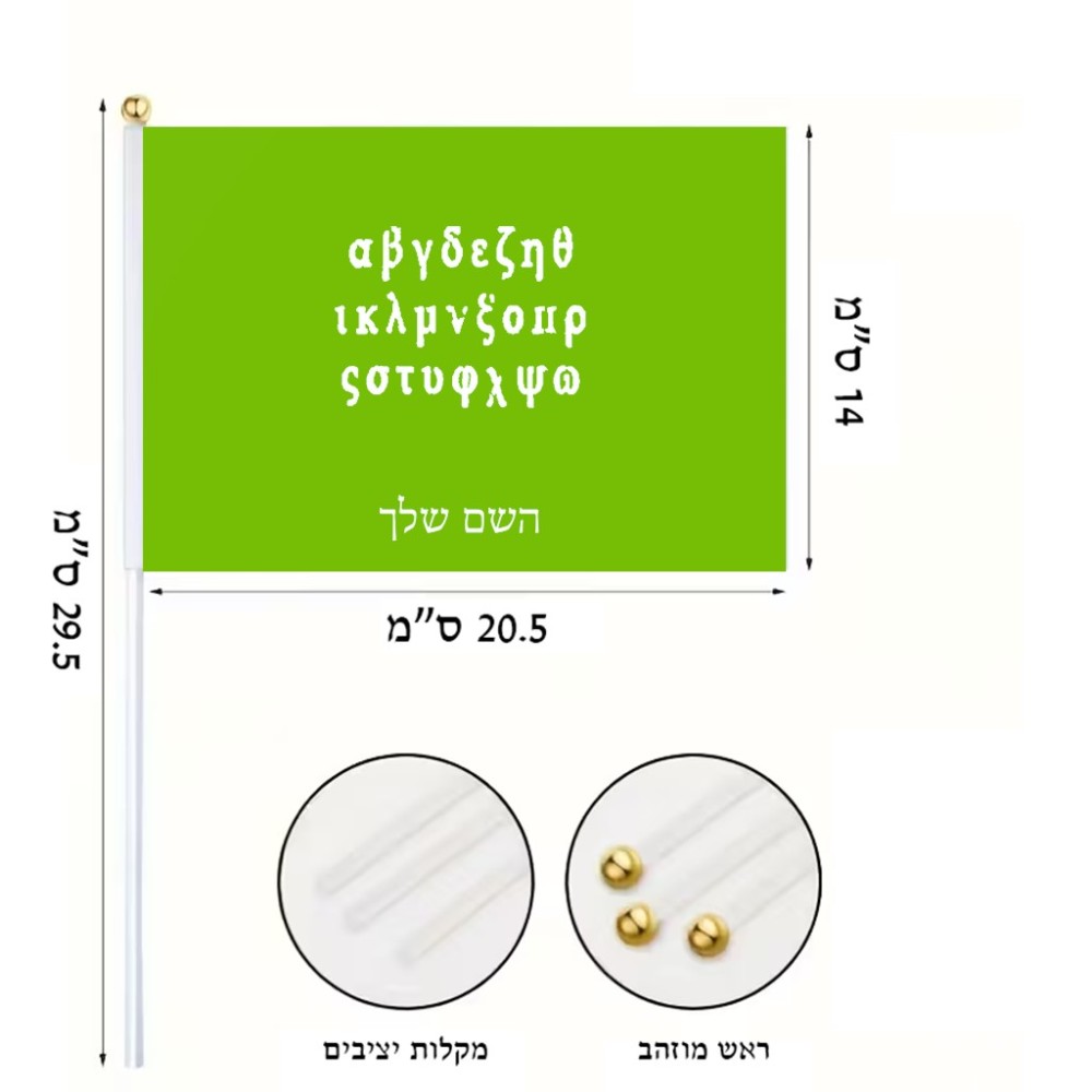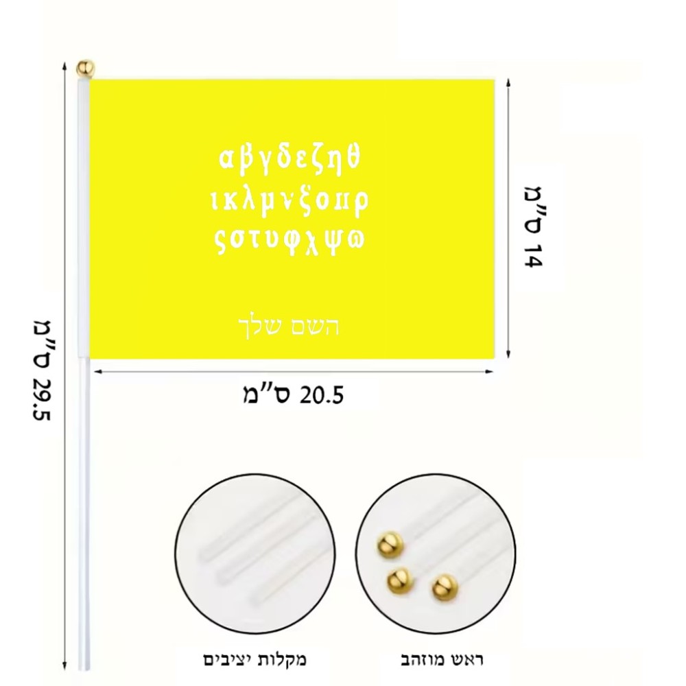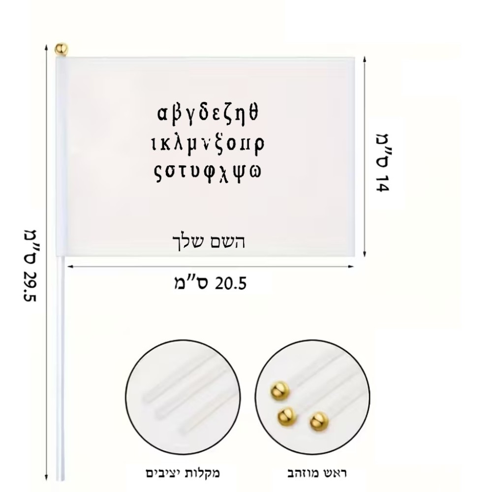 דיגלון בעיצוב אישי עם השם שלך בעיצוב האלפבית היווני גודל הדיגלון 20.5 × 14 ס"מ, ההדפסה מתבצעת בשני צידי הדגל, את השם המבוקש ניתן לציין בהזמנה, אם לא צויין אנחנו ניצור קשר לבירור.