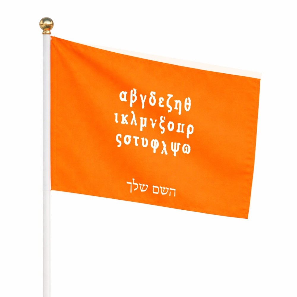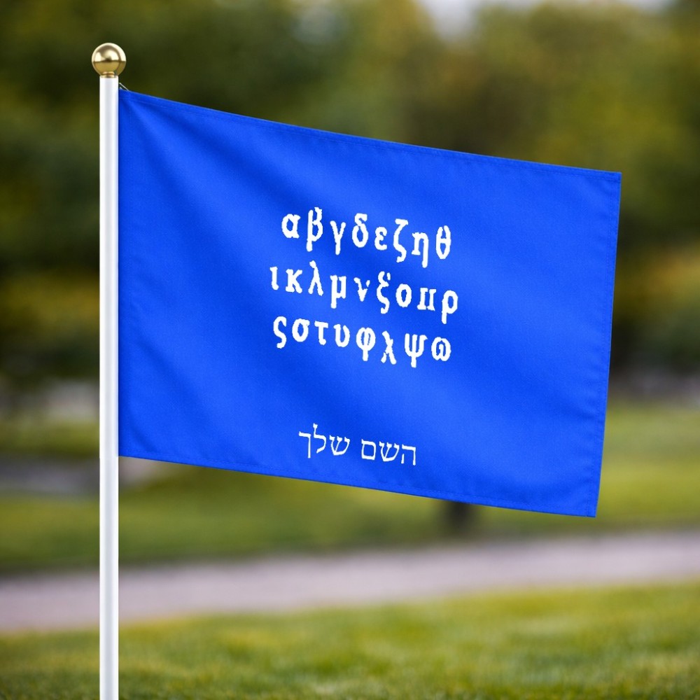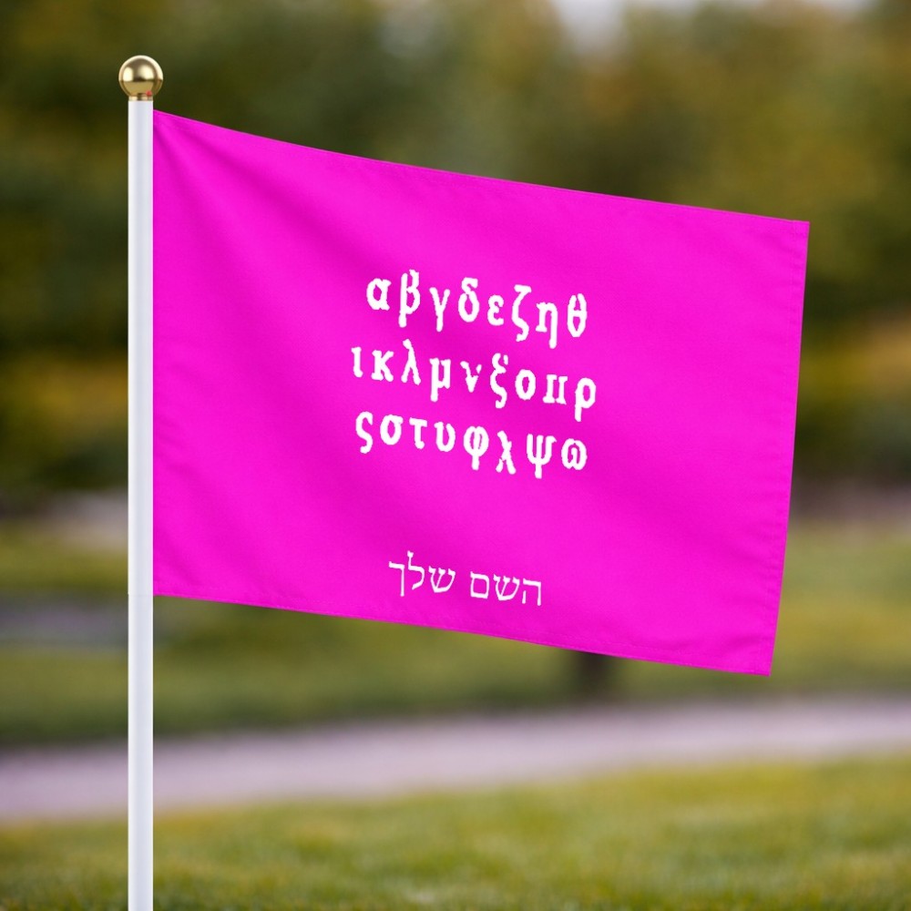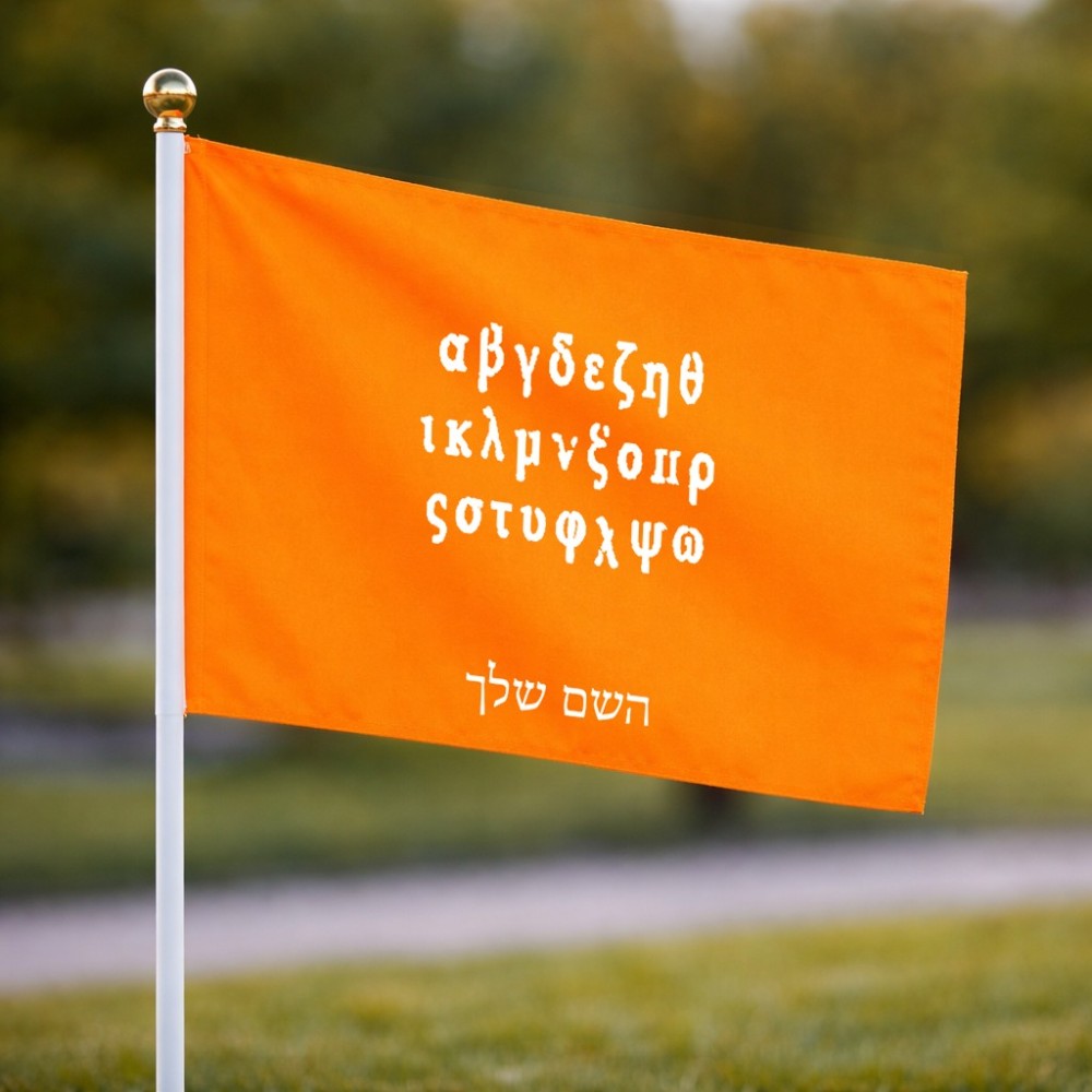דיגלון בעיצוב אישי עם השם שלך בעיצוב האלפבית היווני גודל הדיגלון 20.5 × 14 ס"מ, ההדפסה מתבצעת בשני צידי הדגל, את השם המבוקש ניתן לציין בהזמנה, אם לא צויין אנחנו ניצור קשר לבירור.
