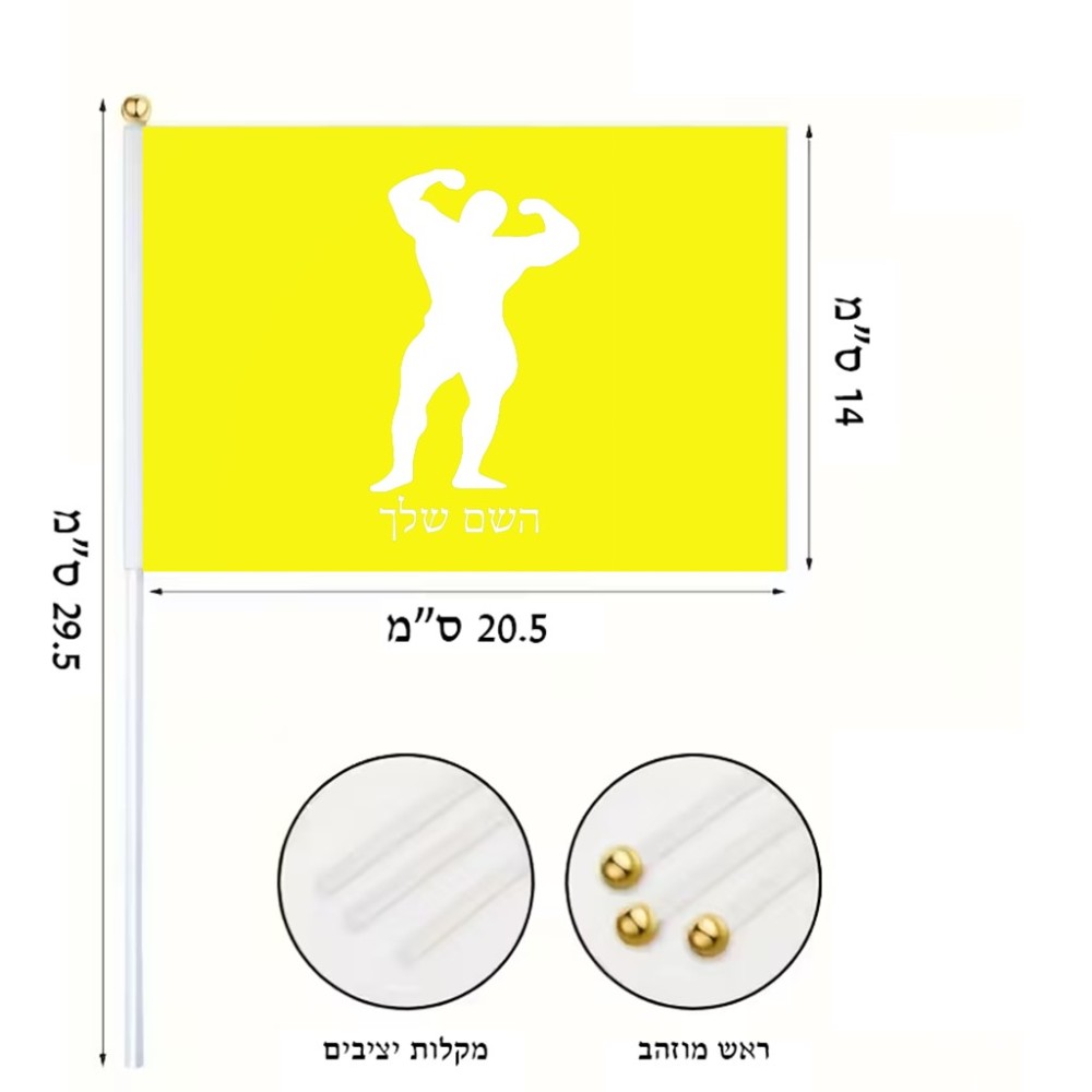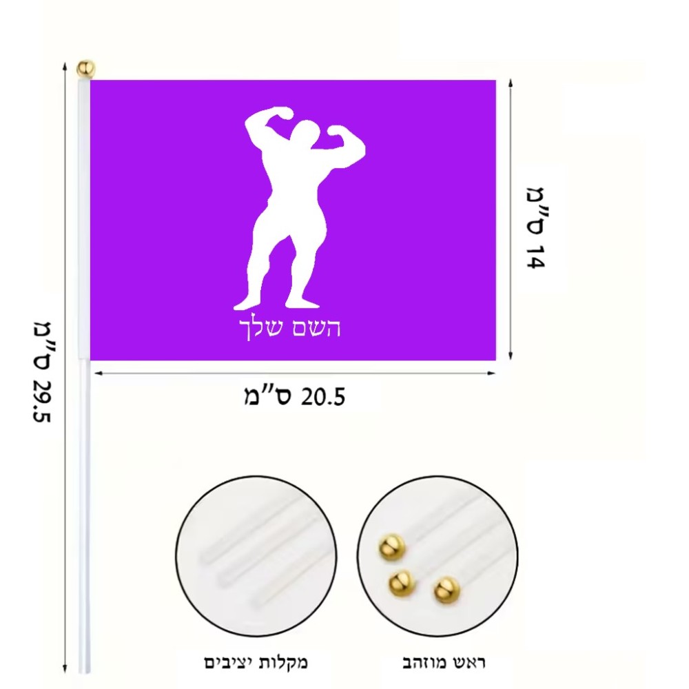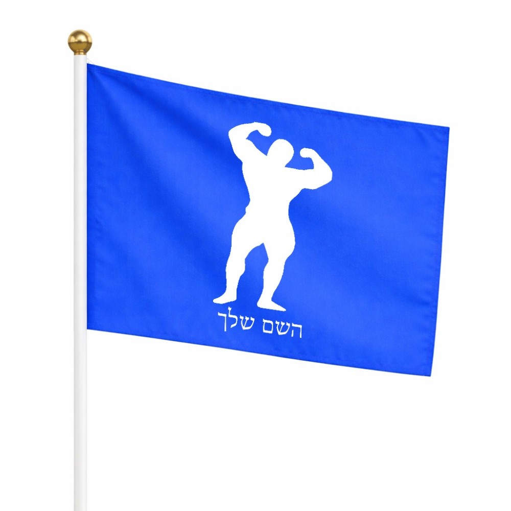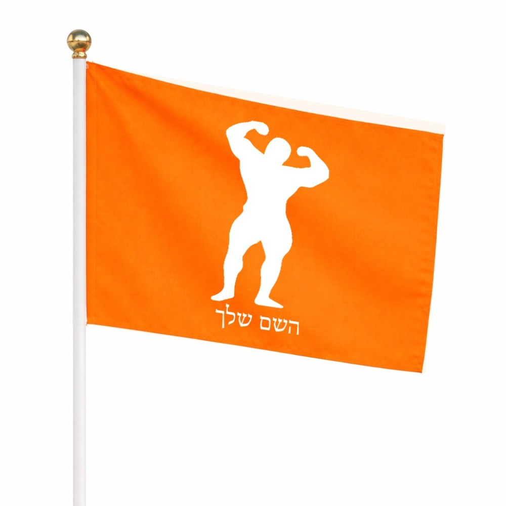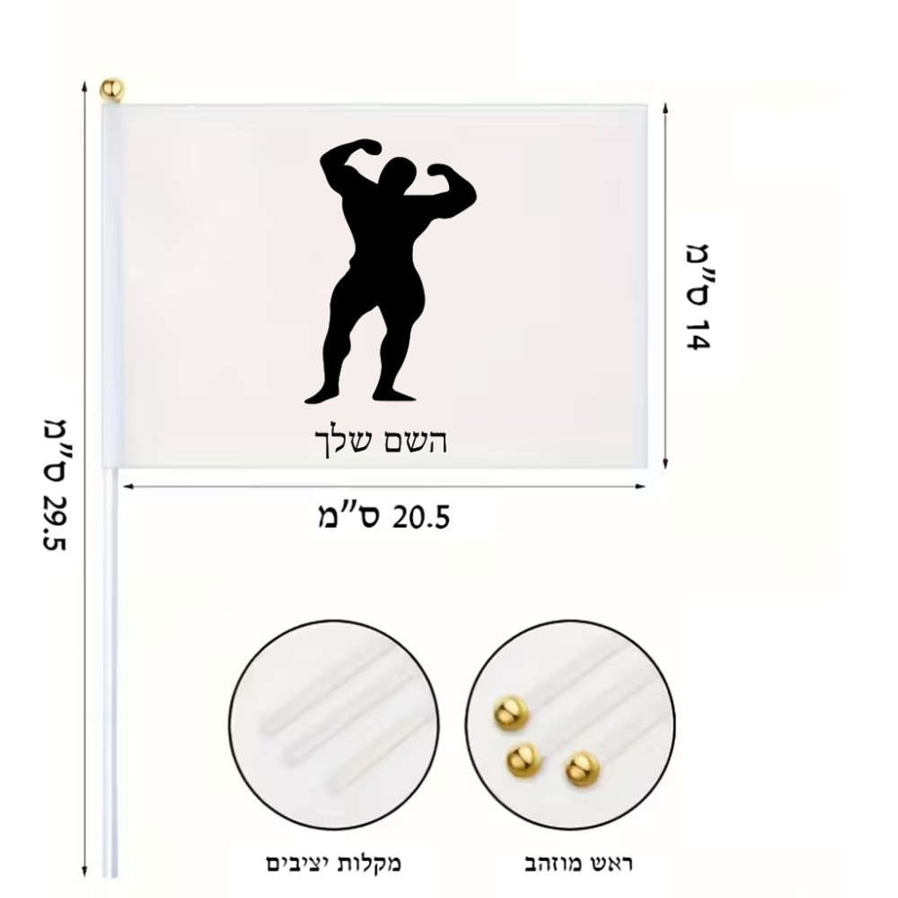 דיגלון בעיצוב אישי עם השם שלך בעיצוב פיתוח גוף גודל הדיגלון 20.5 × 14 ס"מ, ההדפסה מתבצעת בשני צידי הדגל, את השם המבוקש ניתן לציין בהזמנה, אם לא צויין אנחנו ניצור קשר לבירור.