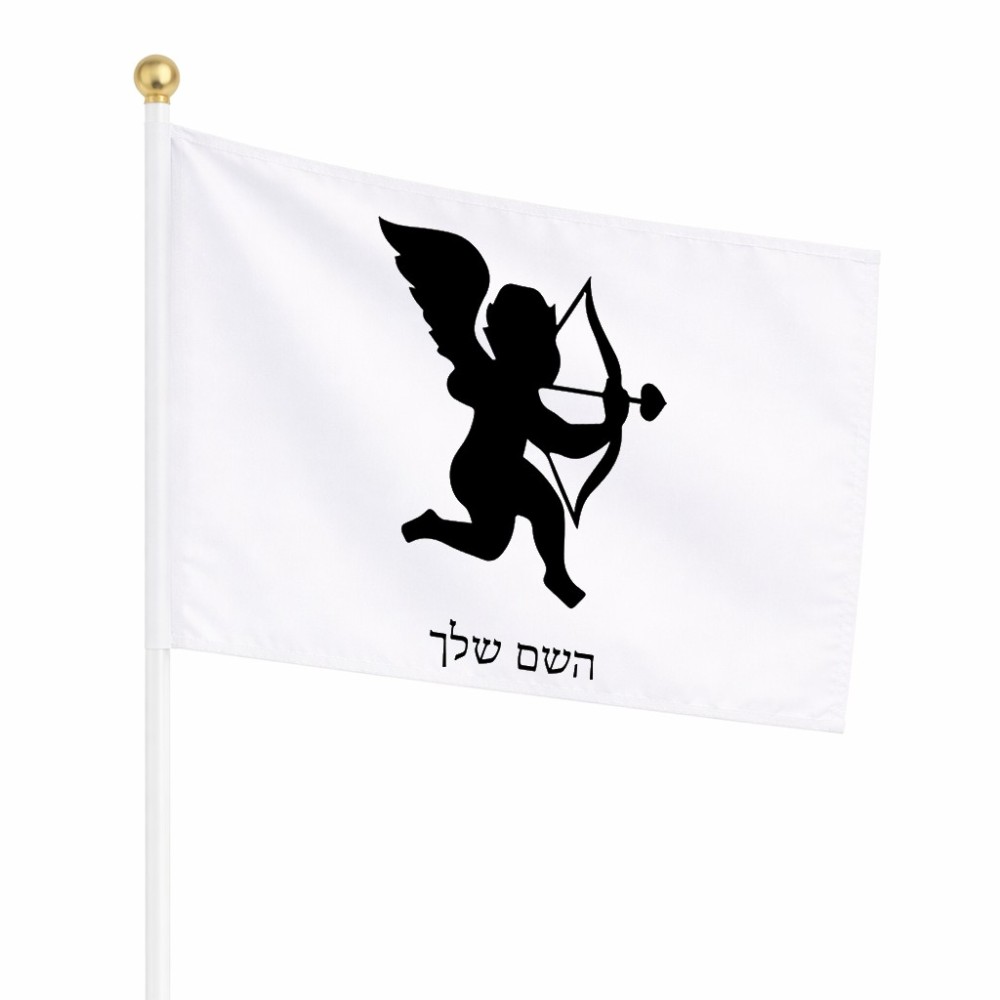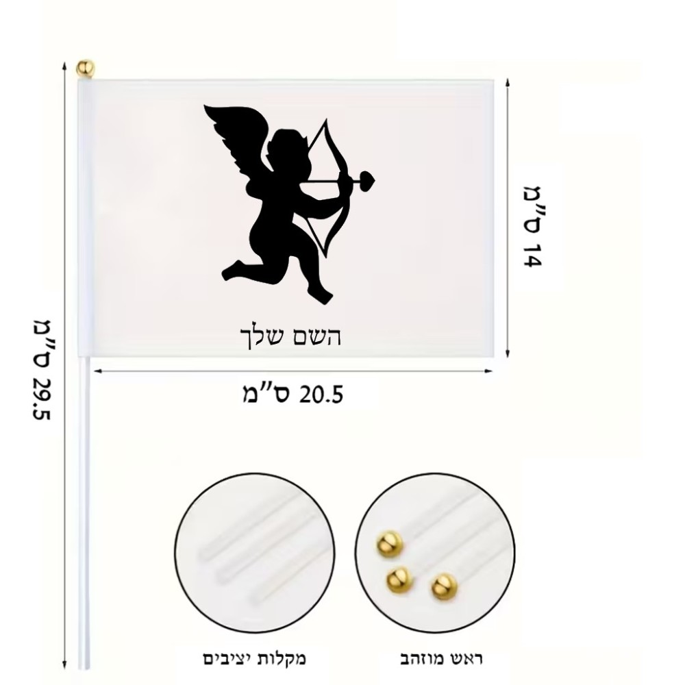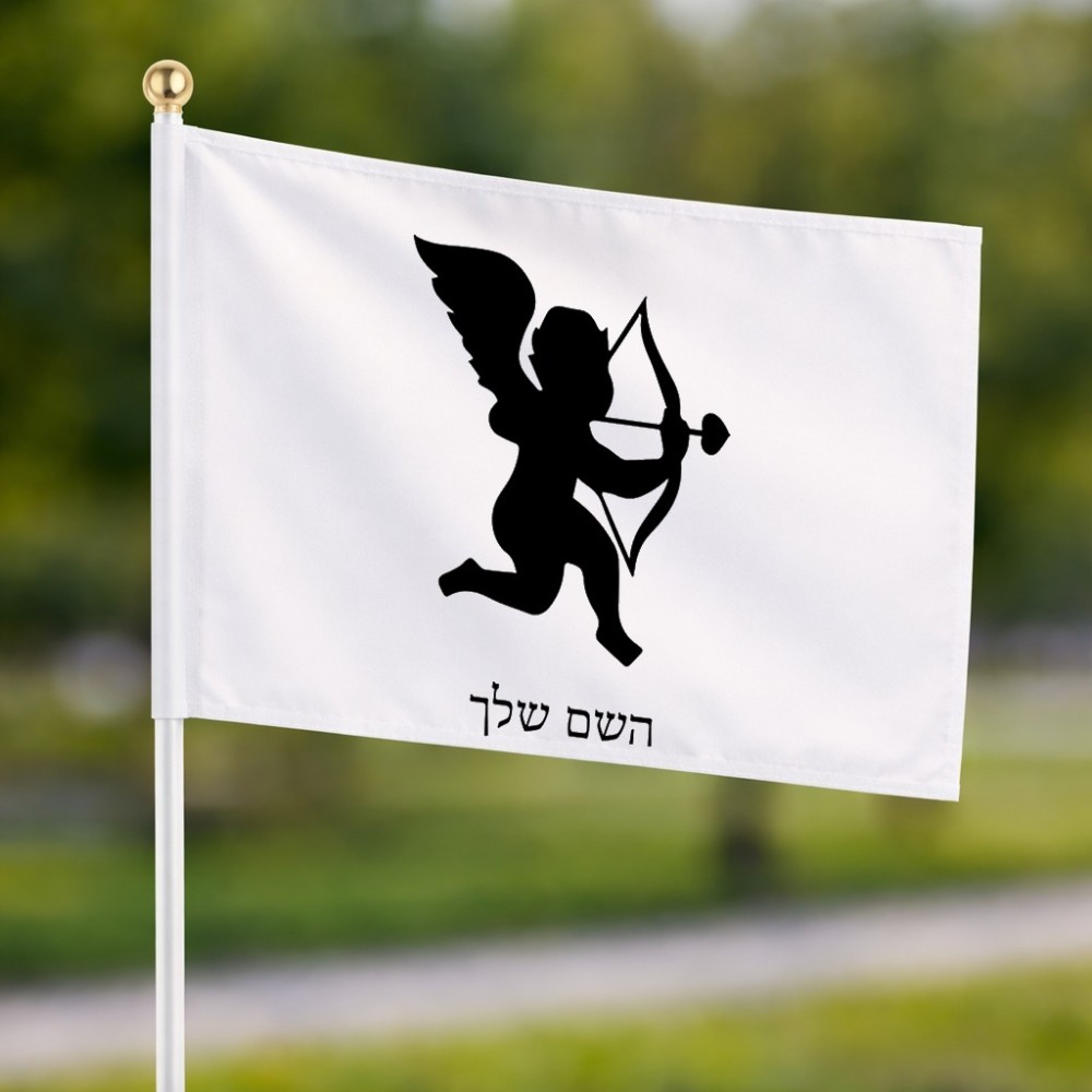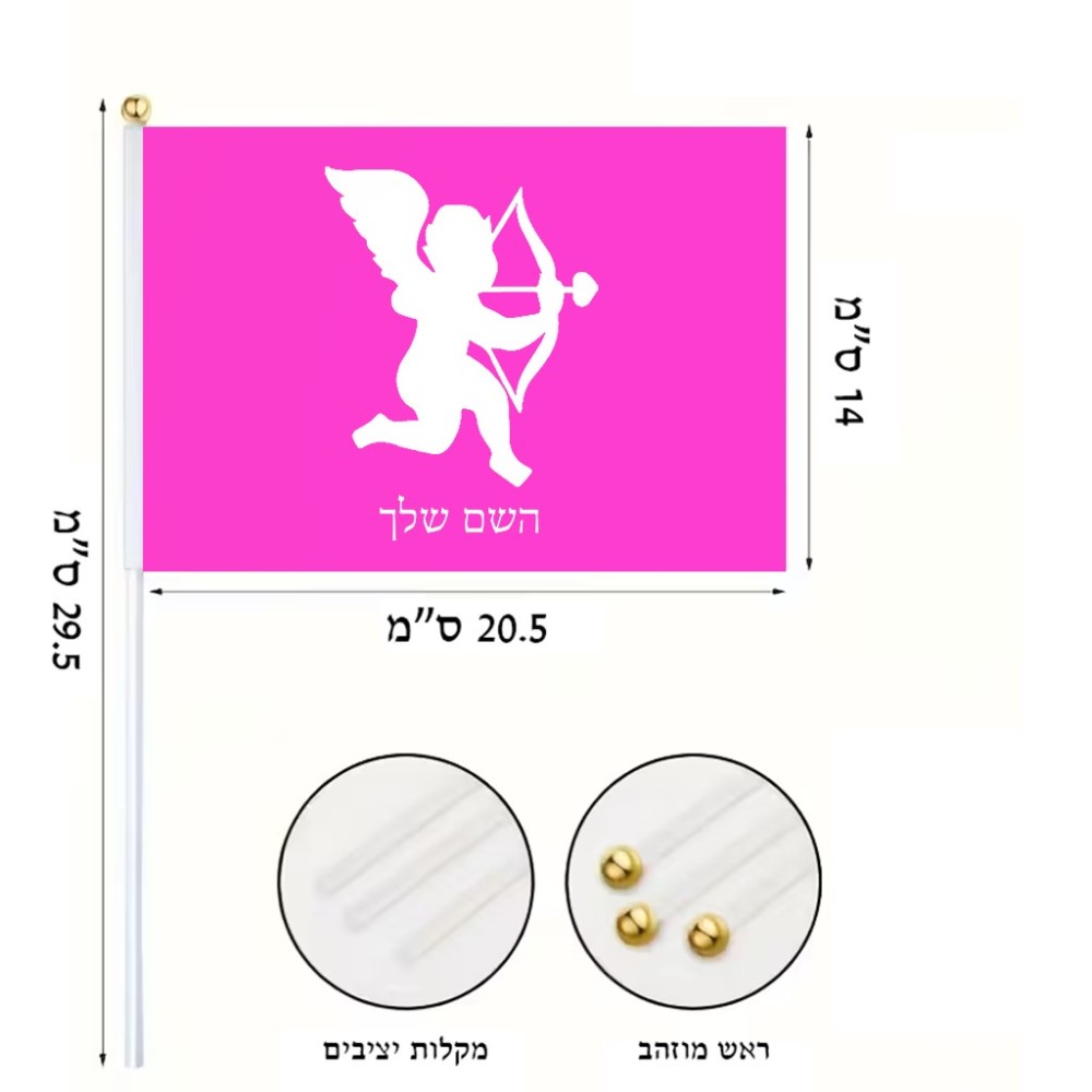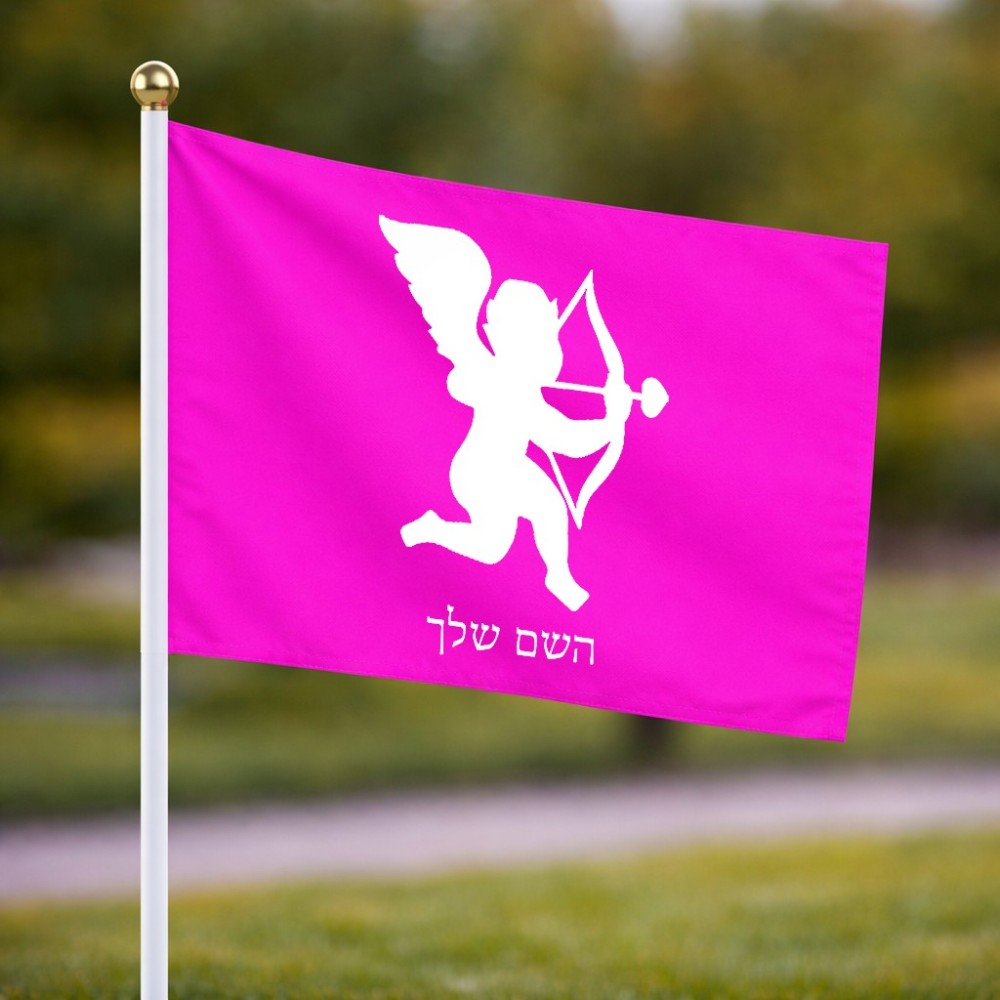 דיגלון בעיצוב אישי עם השם שלך בעיצוב קופידון גודל הדיגלון 20.5 × 14 ס"מ, ההדפסה מתבצעת בשני צידי הדגל, את השם המבוקש ניתן לציין בהזמנה, אם לא צויין אנחנו ניצור קשר לבירור.