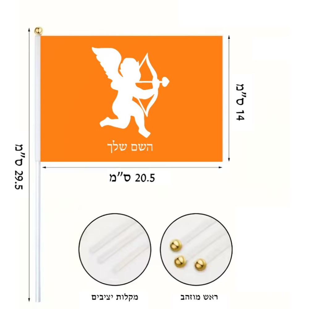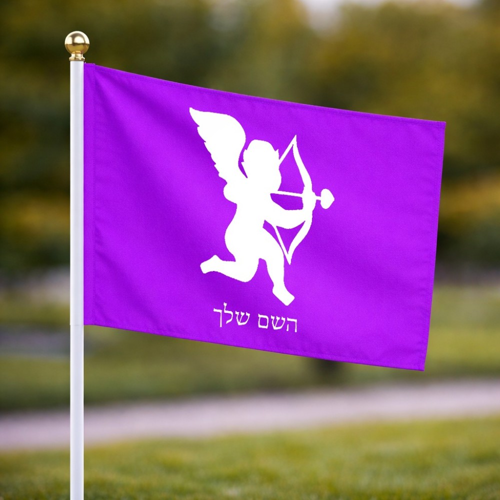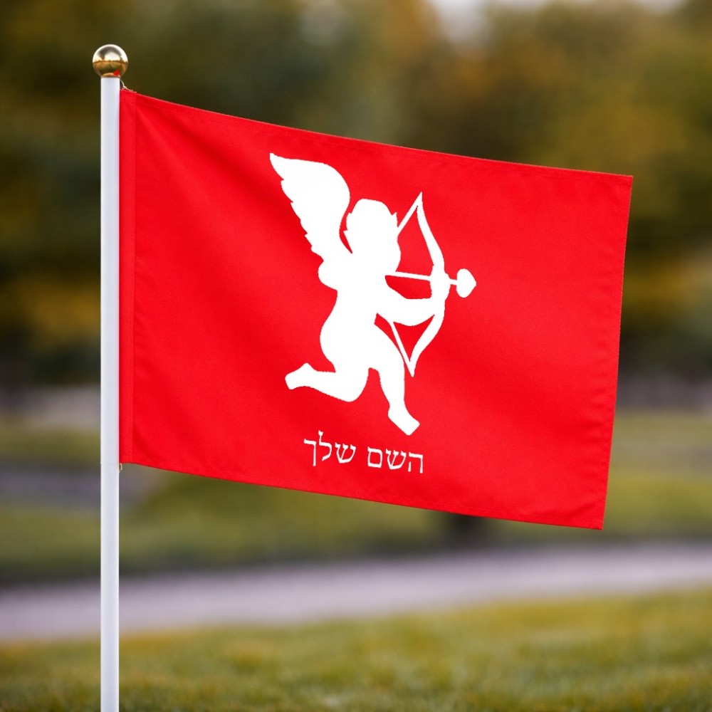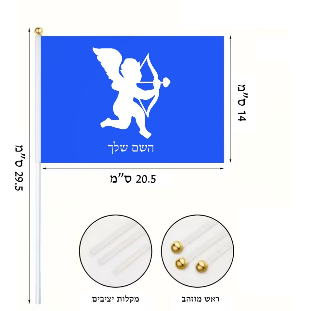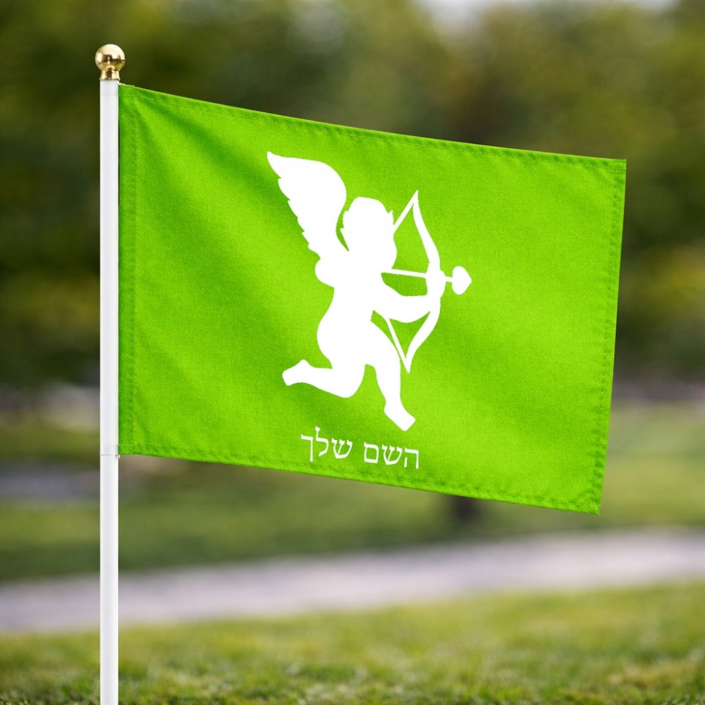 דיגלון בעיצוב אישי עם השם שלך בעיצוב קופידון גודל הדיגלון 20.5 × 14 ס"מ, ההדפסה מתבצעת בשני צידי הדגל, את השם המבוקש ניתן לציין בהזמנה, אם לא צויין אנחנו ניצור קשר לבירור.