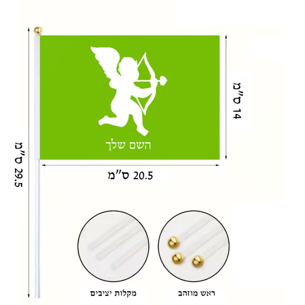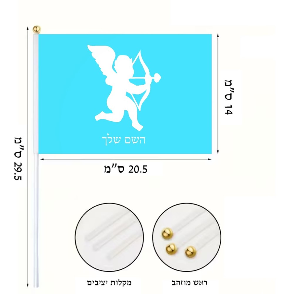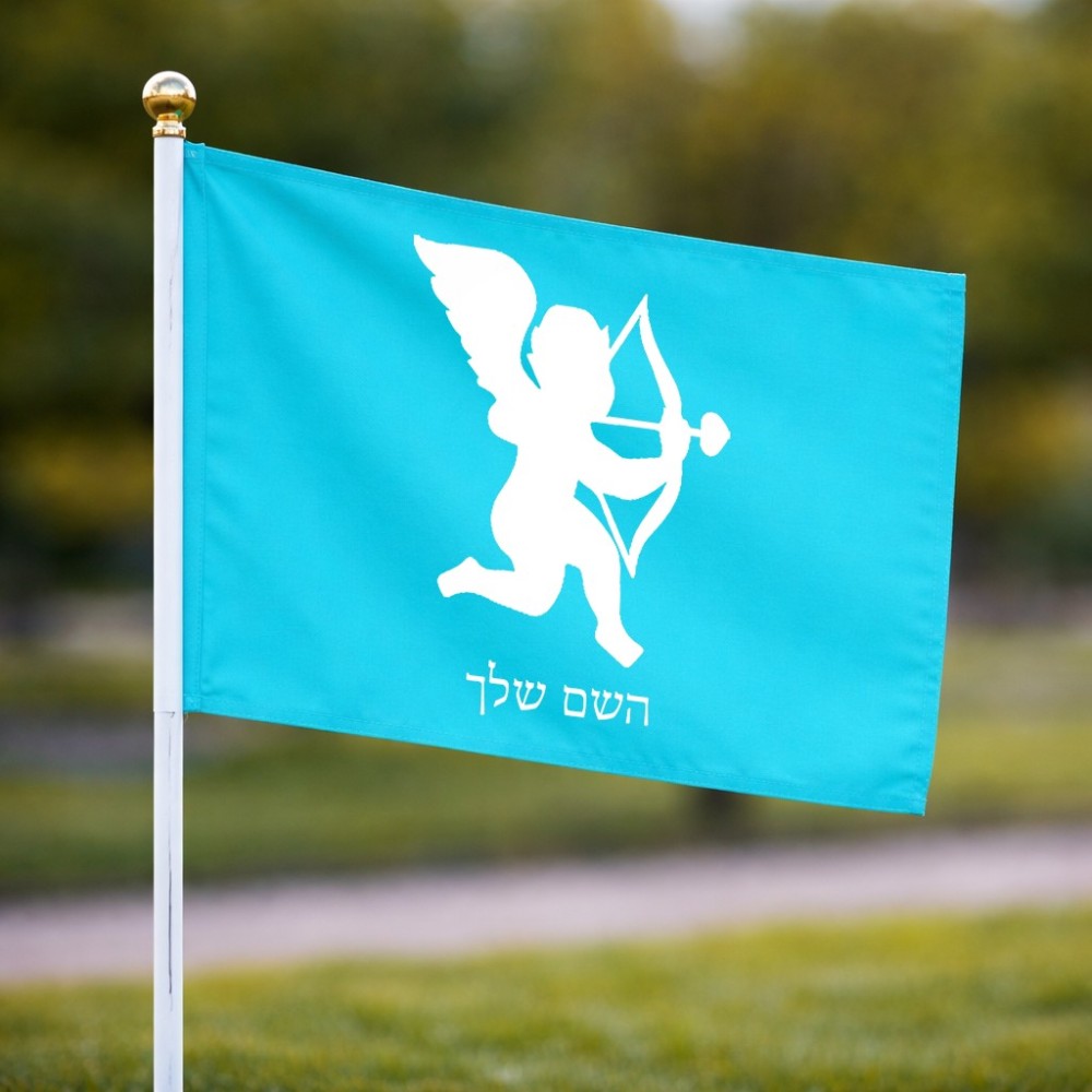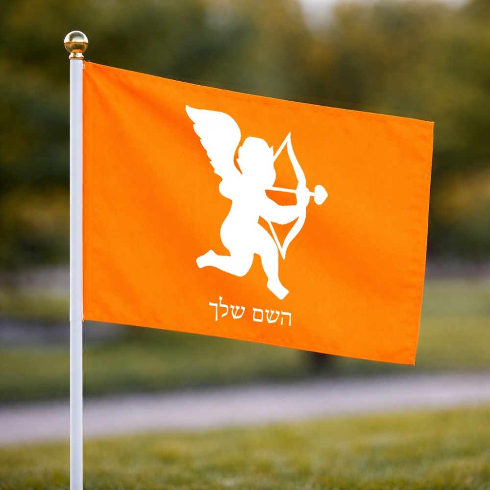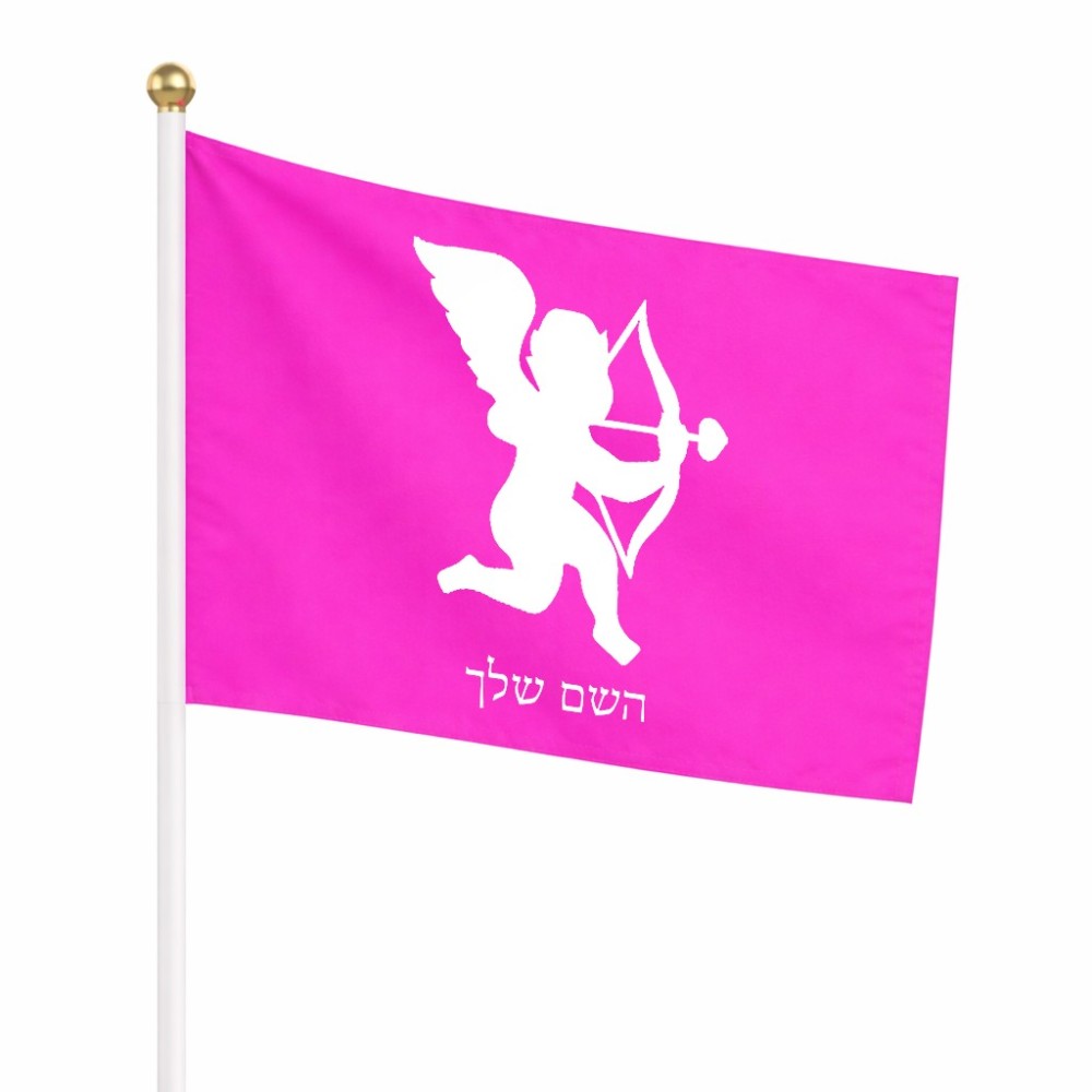 דיגלון בעיצוב אישי עם השם שלך בעיצוב קופידון גודל הדיגלון 20.5 × 14 ס"מ, ההדפסה מתבצעת בשני צידי הדגל, את השם המבוקש ניתן לציין בהזמנה, אם לא צויין אנחנו ניצור קשר לבירור.