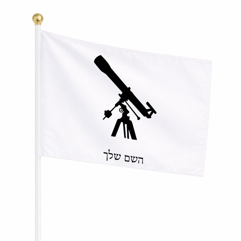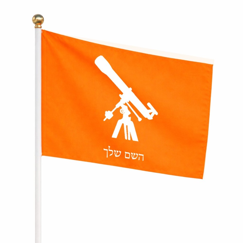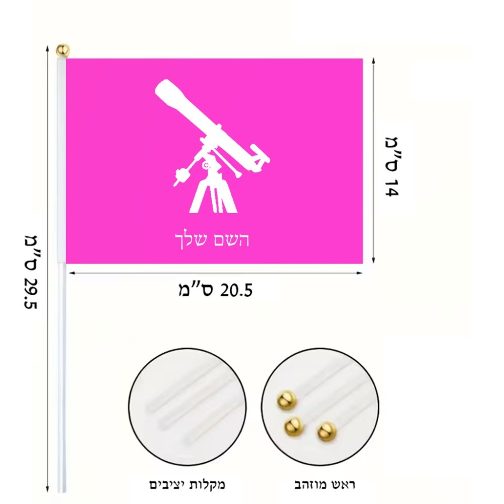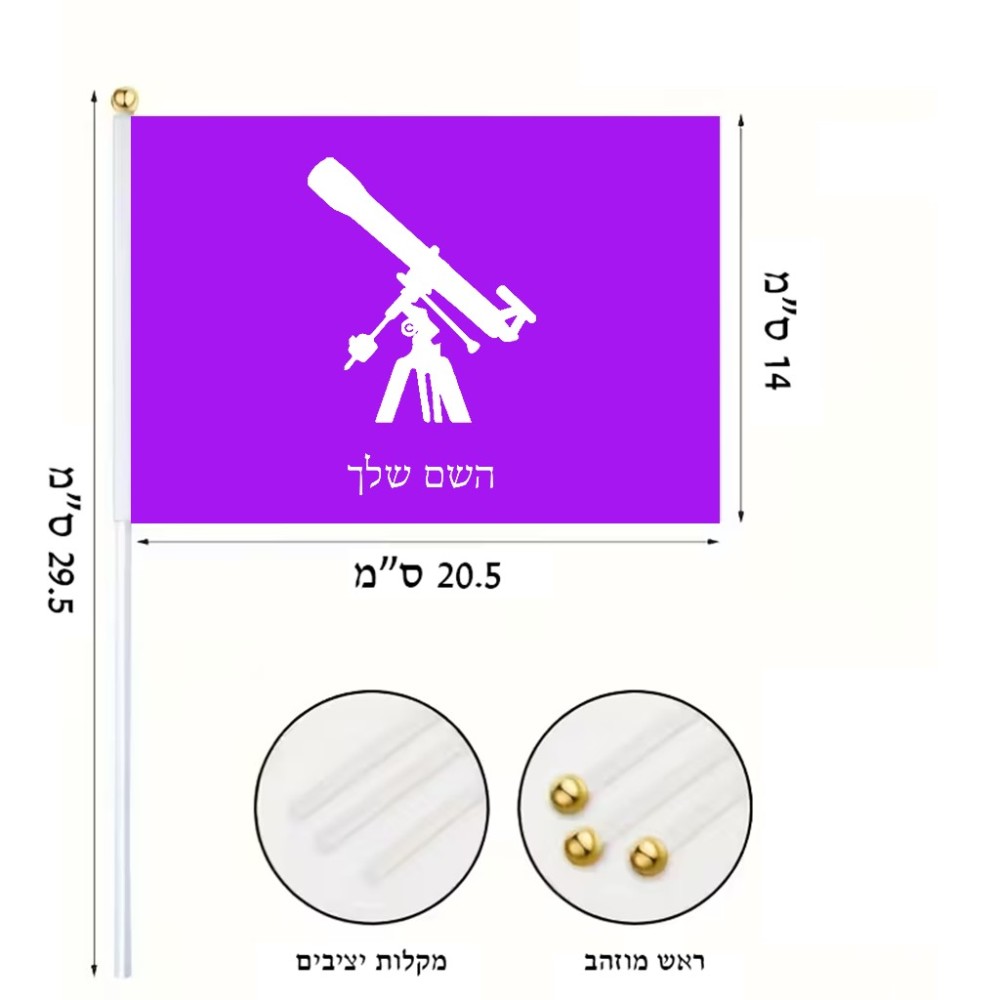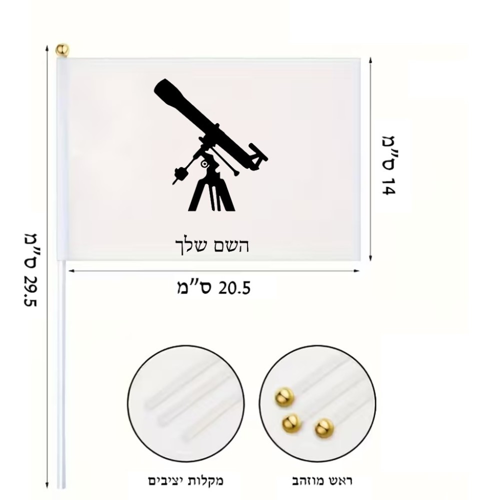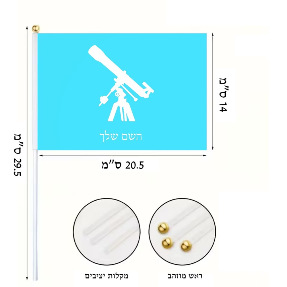 דיגלון בעיצוב אישי עם השם שלך בעיצוב טלסקופ גודל הדיגלון 20.5 × 14 ס"מ, ההדפסה מתבצעת בשני צידי הדגל, את השם המבוקש ניתן לציין בהזמנה, אם לא צויין אנחנו ניצור קשר לבירור.