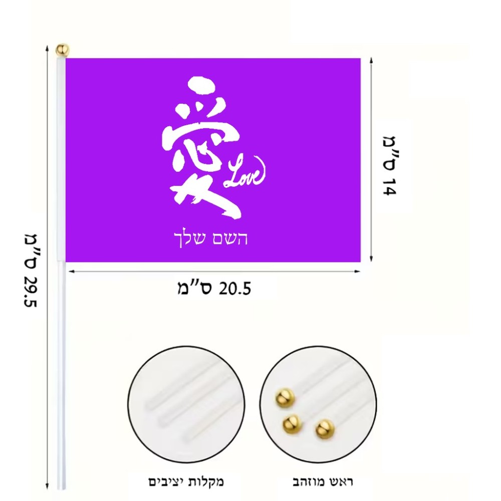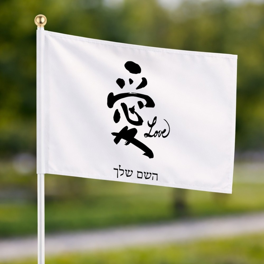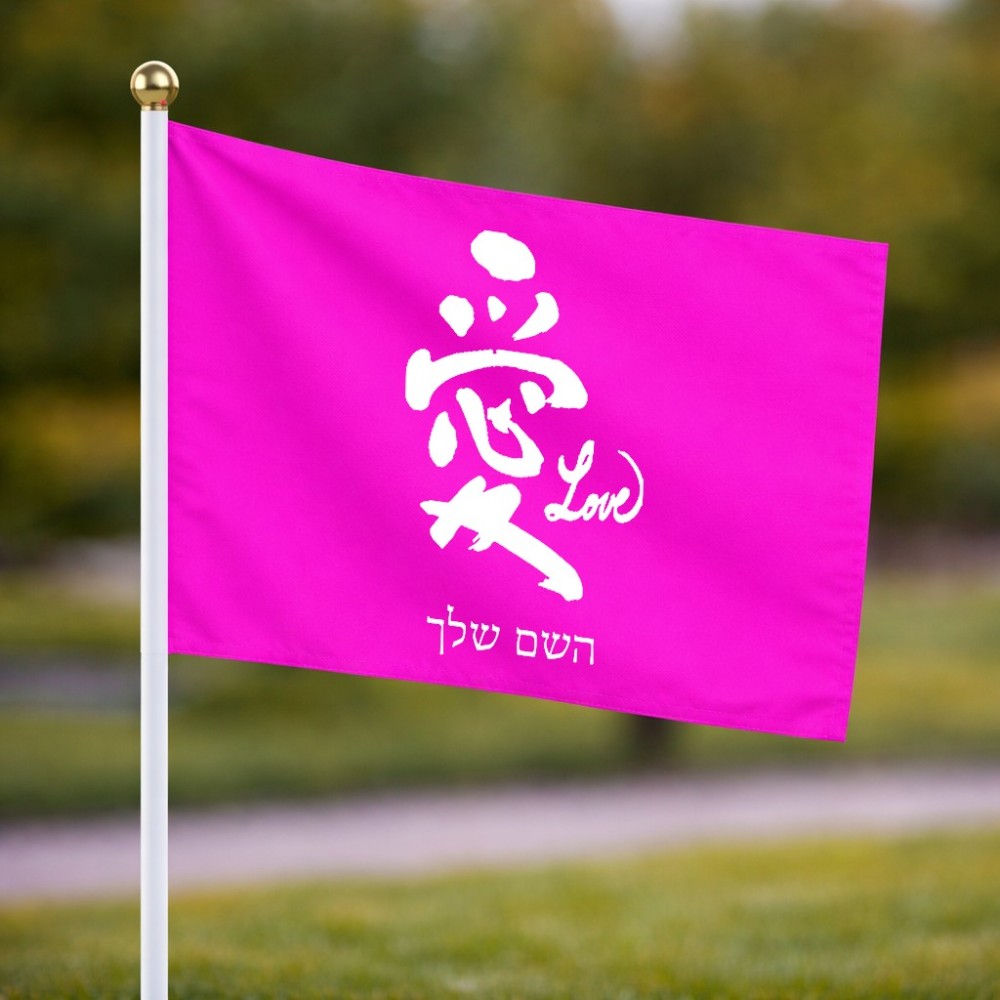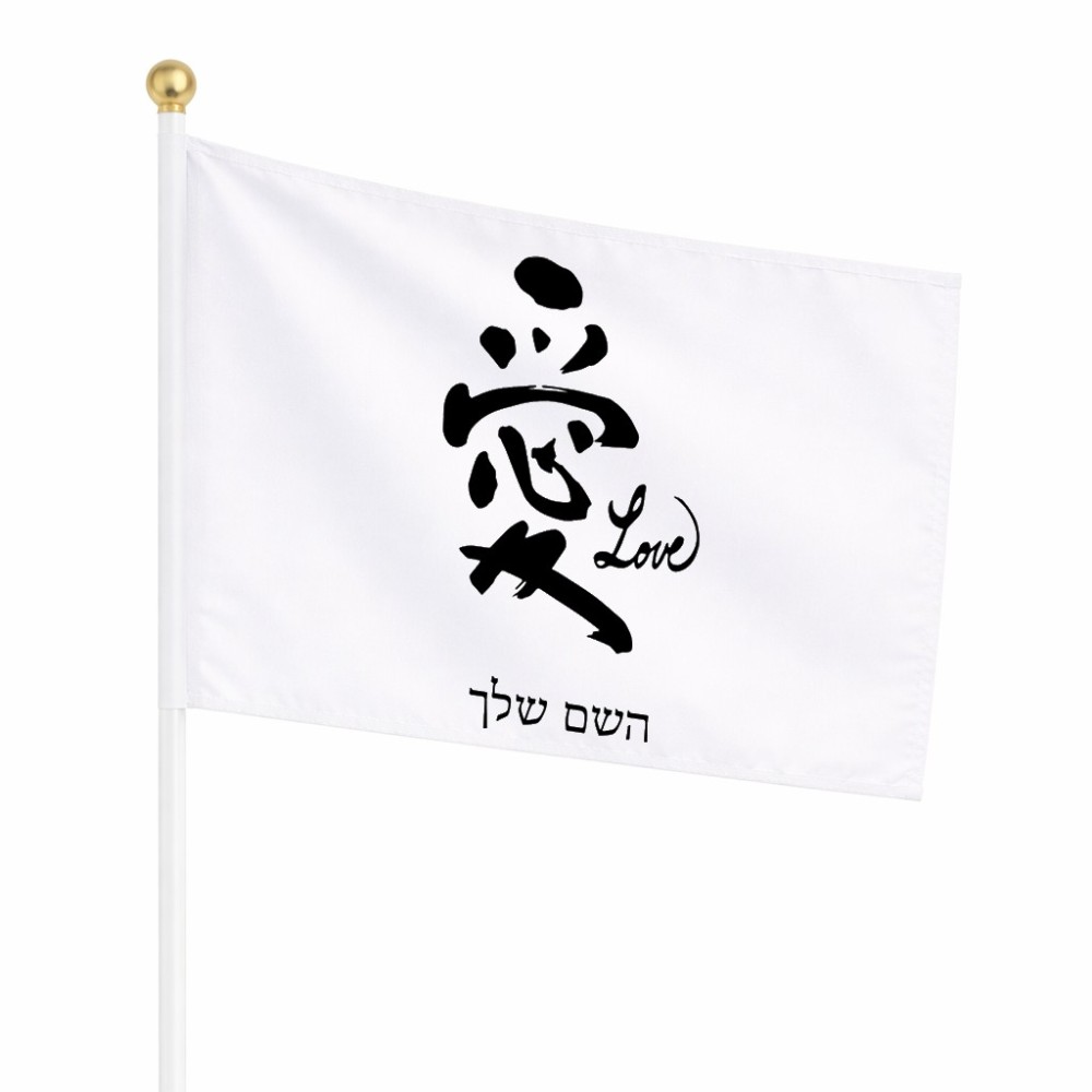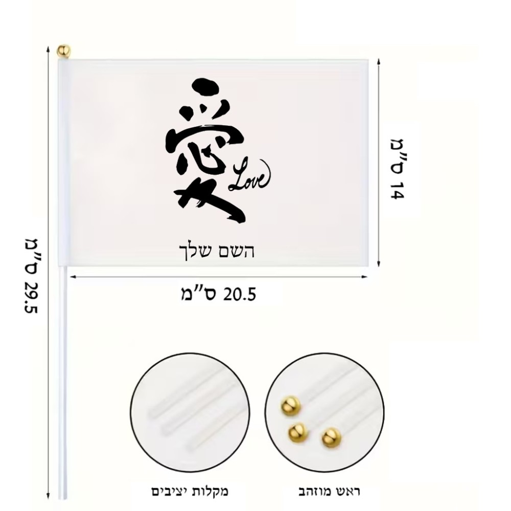 דיגלון בעיצוב אישי עם השם שלך בעיצוב אהבה באותיות יפניות גודל הדיגלון 20.5 × 14 ס"מ, ההדפסה מתבצעת בשני צידי הדגל, את השם המבוקש ניתן לציין בהזמנה, אם לא צויין אנחנו ניצור קשר לבירור.