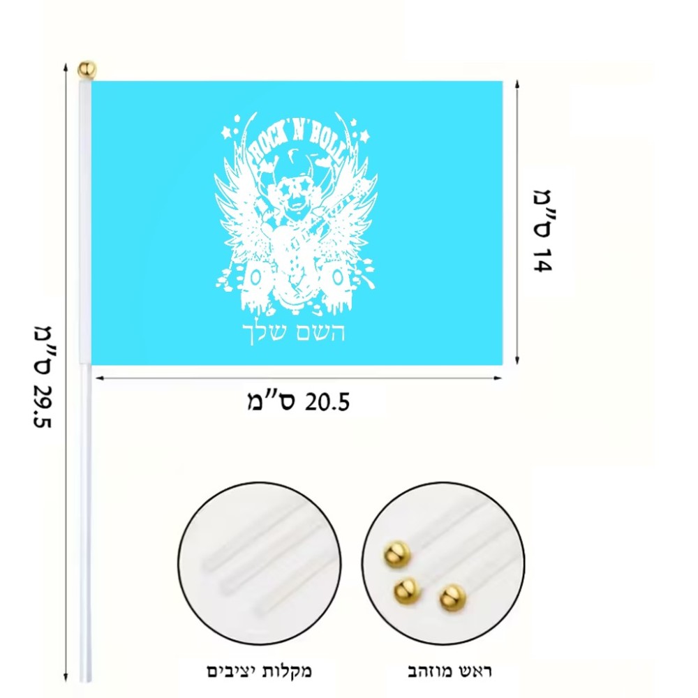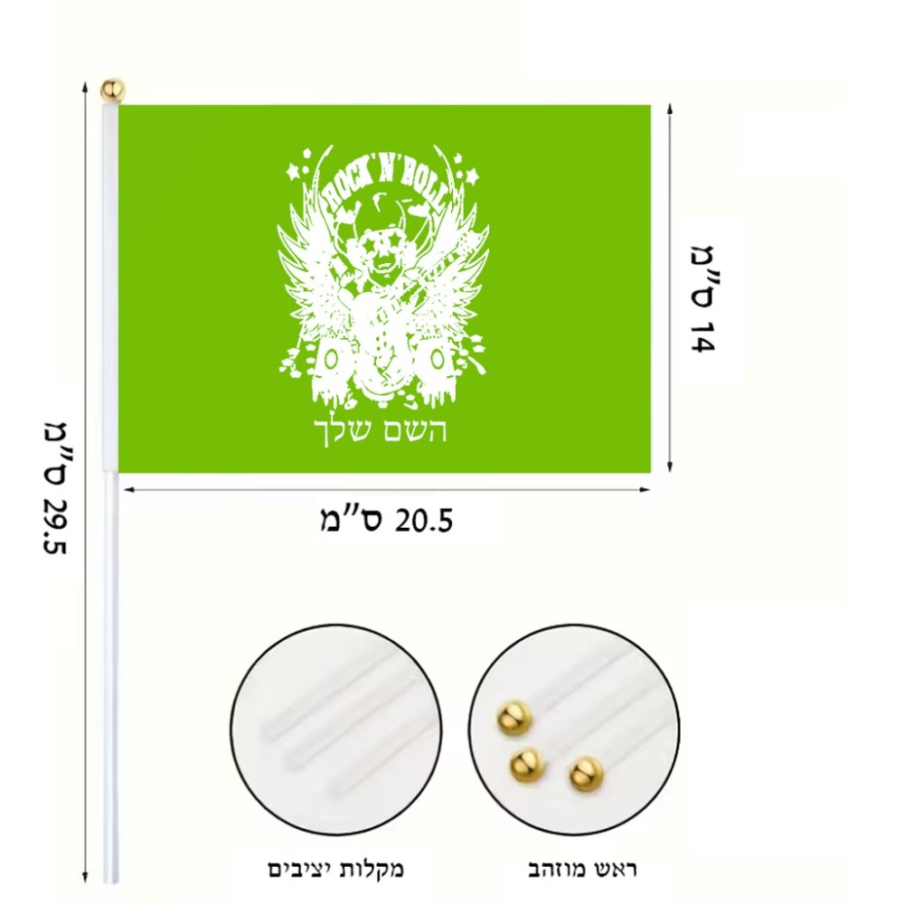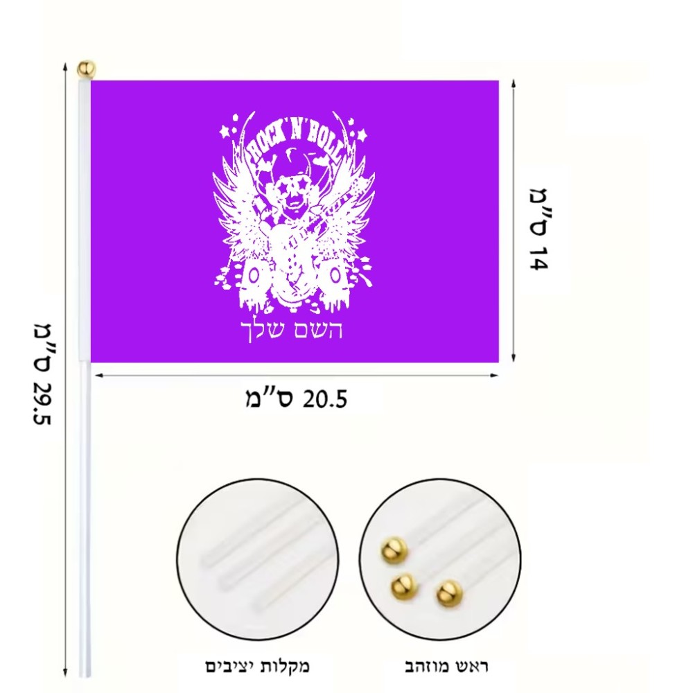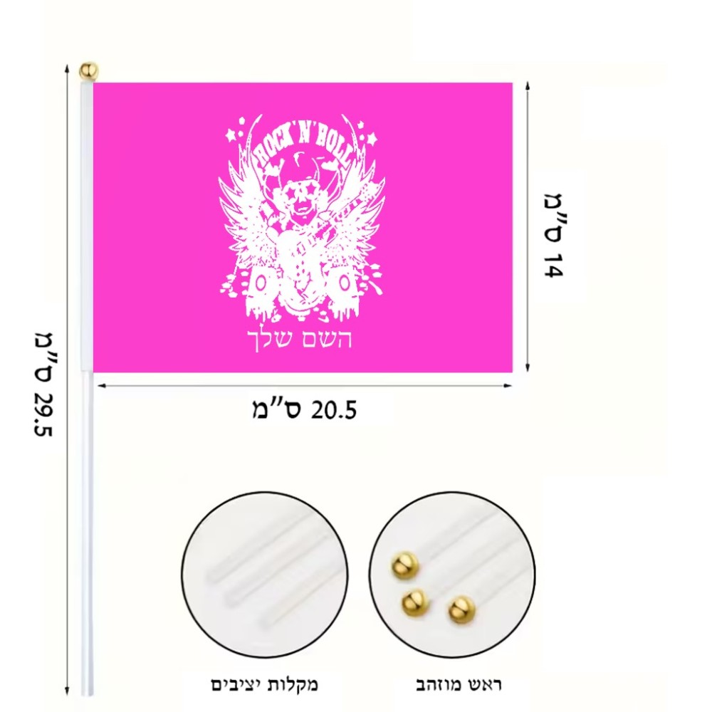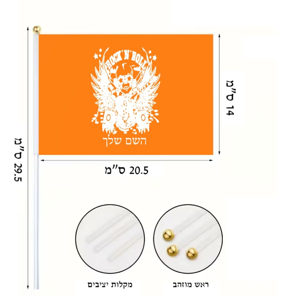 דיגלון בעיצוב אישי עם השם שלך בעיצוב רוקנרול גודל הדיגלון 20.5 × 14 ס"מ, ההדפסה מתבצעת בשני צידי הדגל, את השם המבוקש ניתן לציין בהזמנה, אם לא צויין אנחנו ניצור קשר לבירור.
