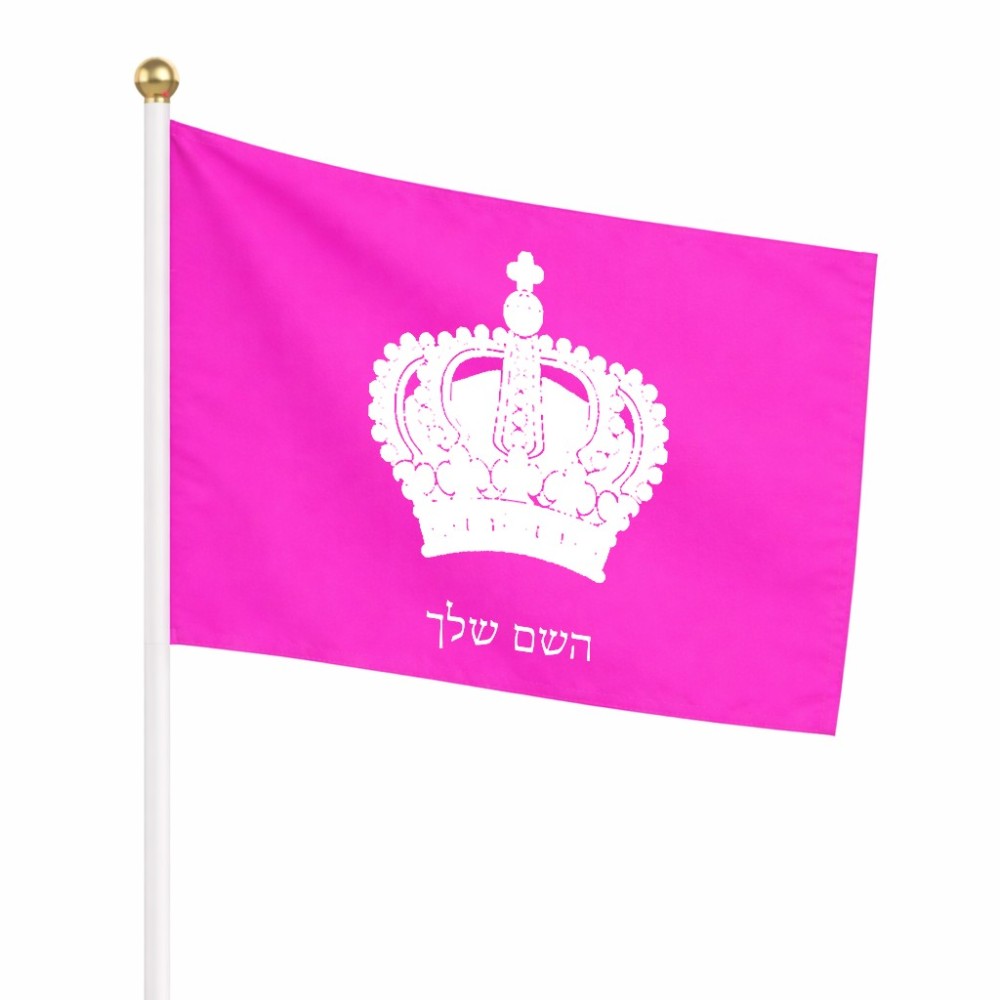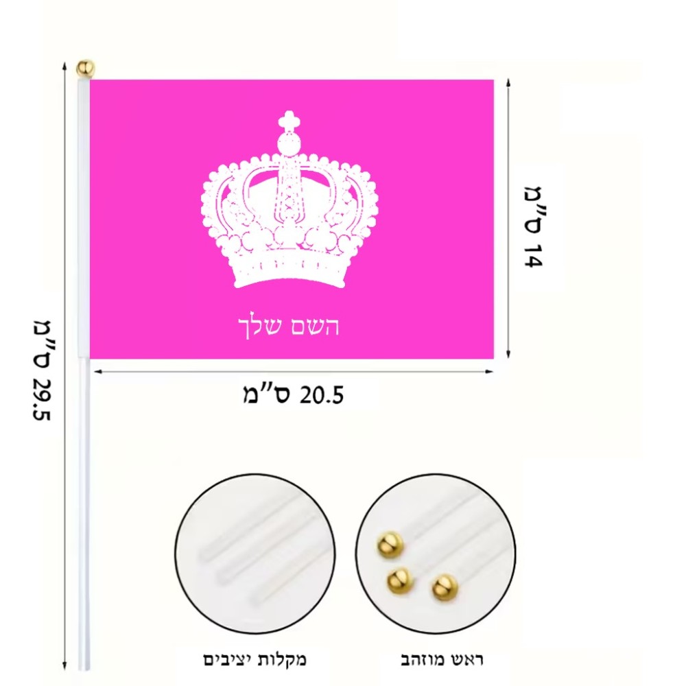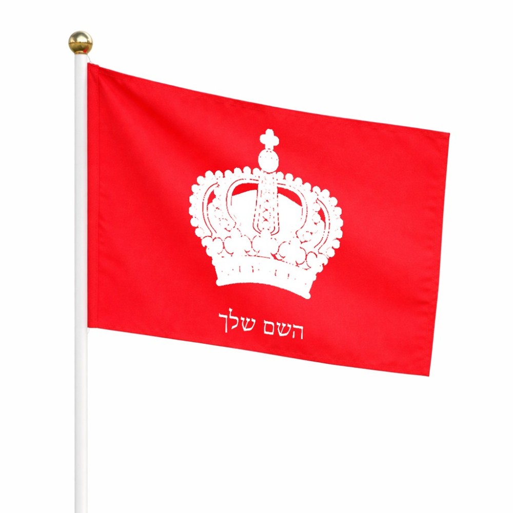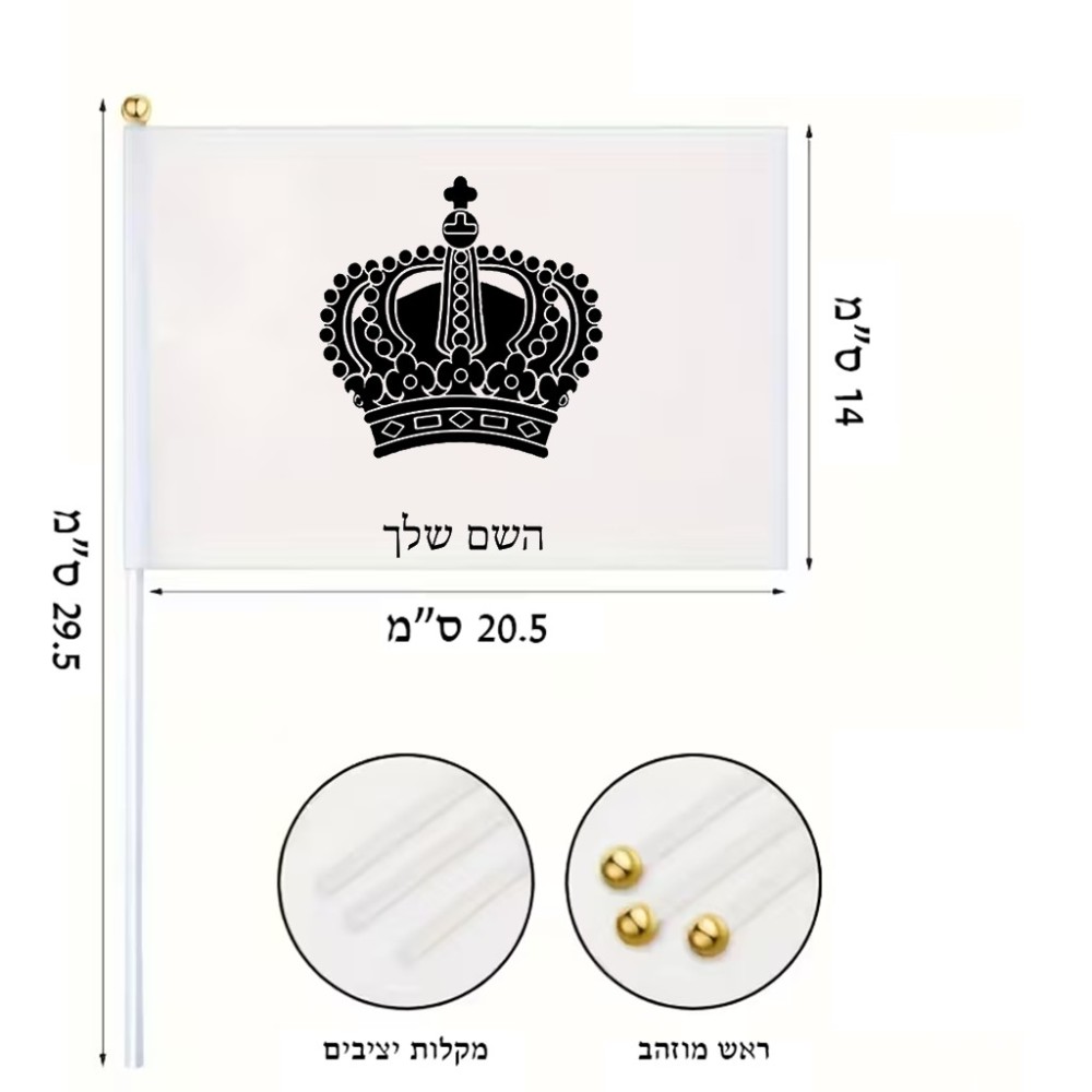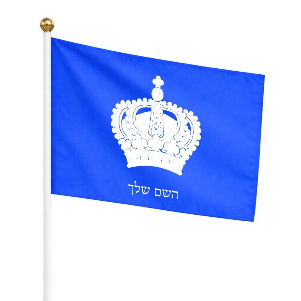 דיגלון בעיצוב אישי עם השם שלך בעיצוב כתר מלכותי גודל הדיגלון 20.5 × 14 ס"מ, ההדפסה מתבצעת בשני צידי הדגל, את השם המבוקש ניתן לציין בהזמנה, אם לא צויין אנחנו ניצור קשר לבירור.