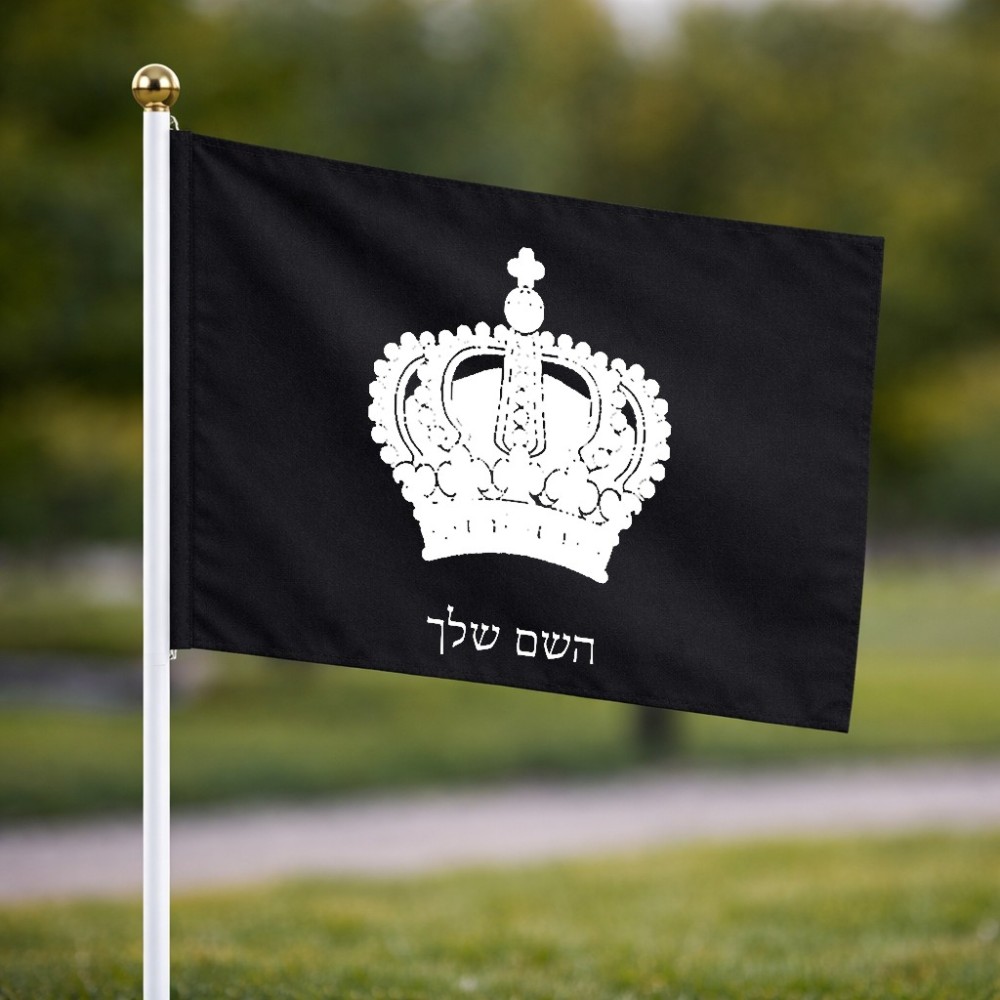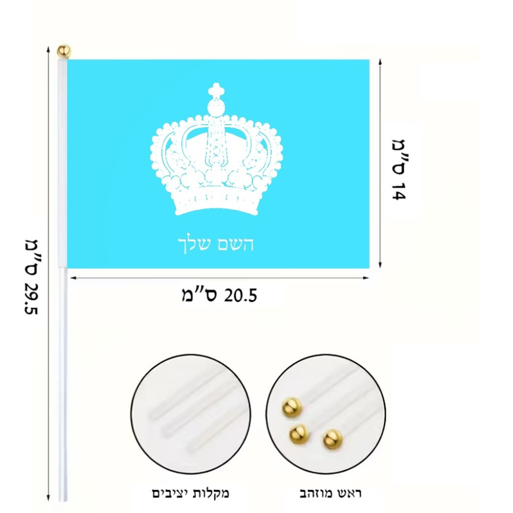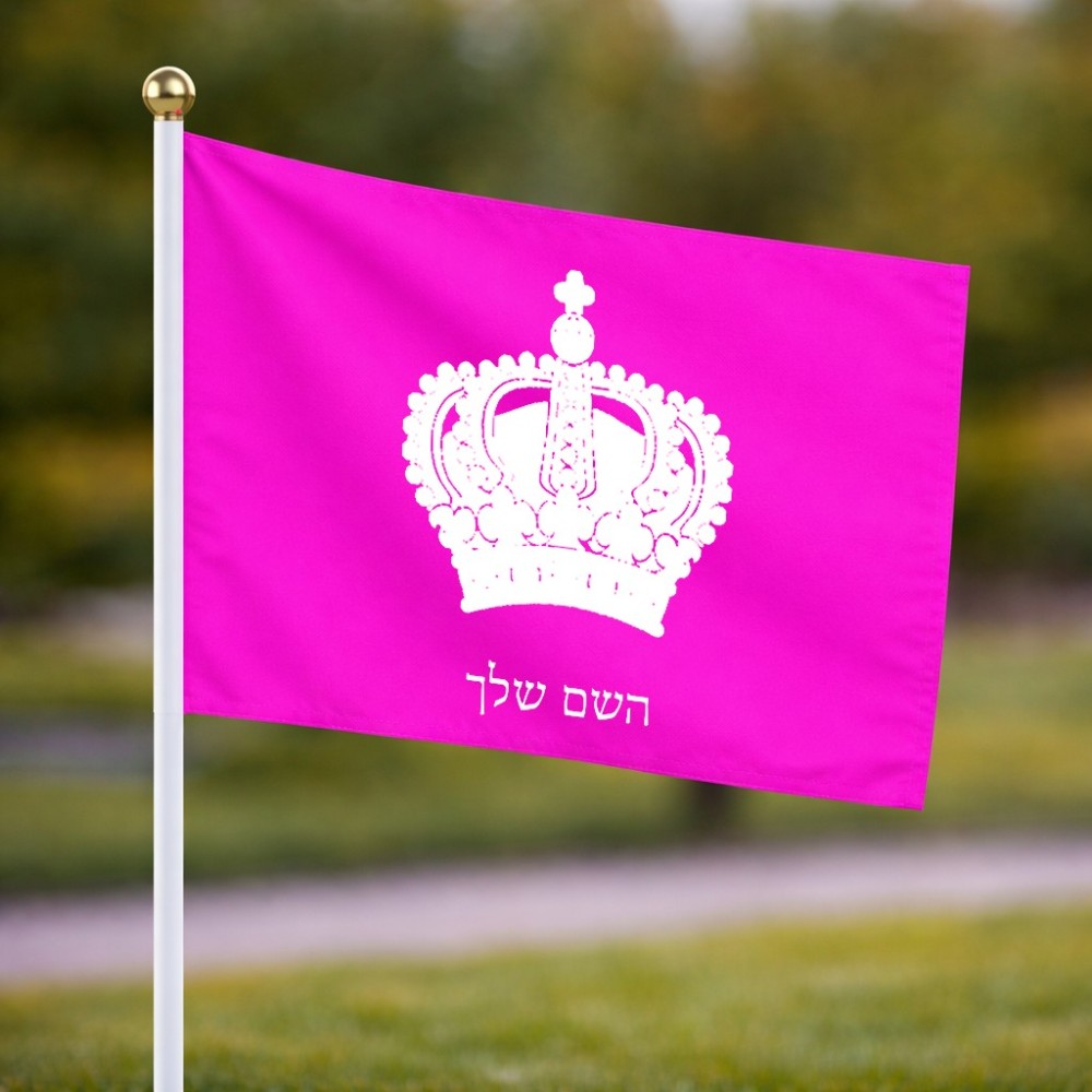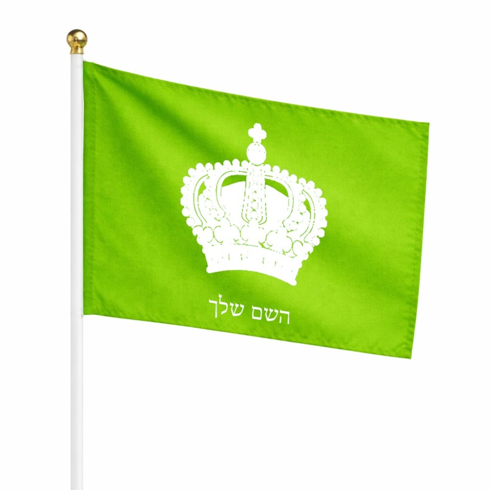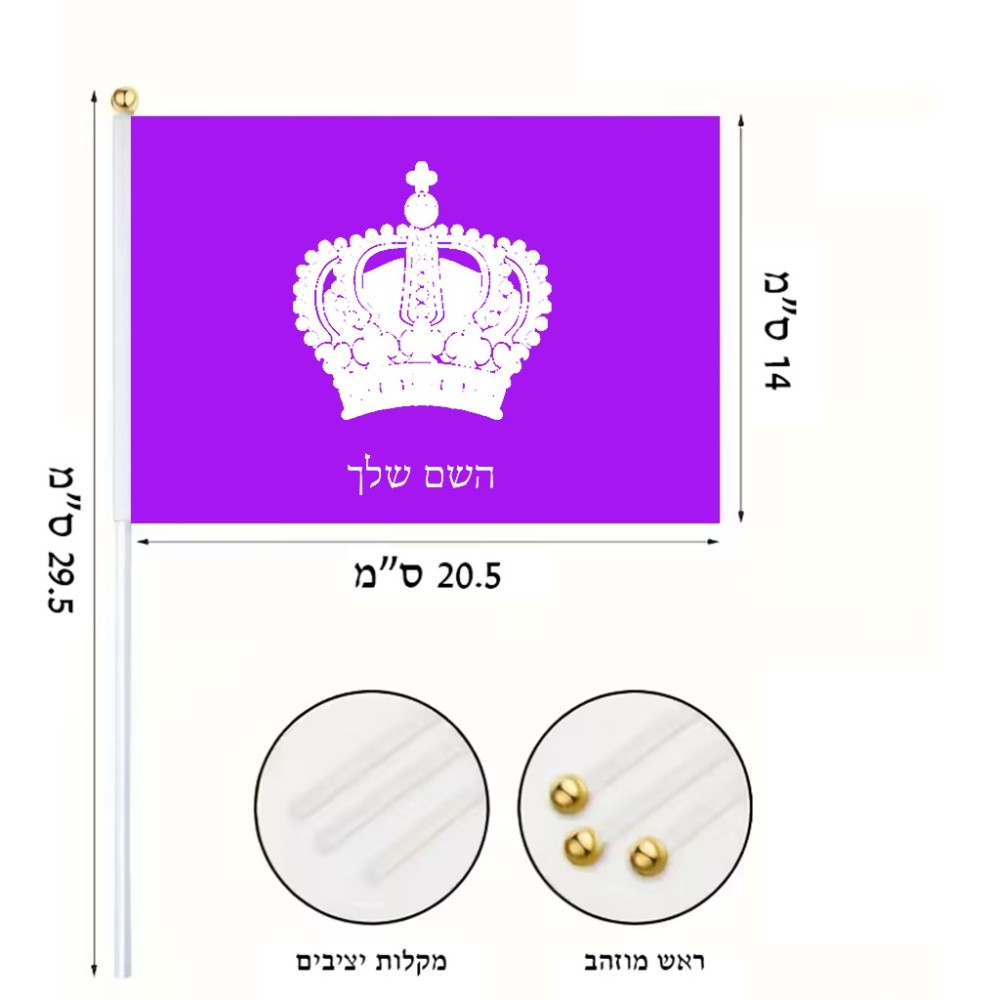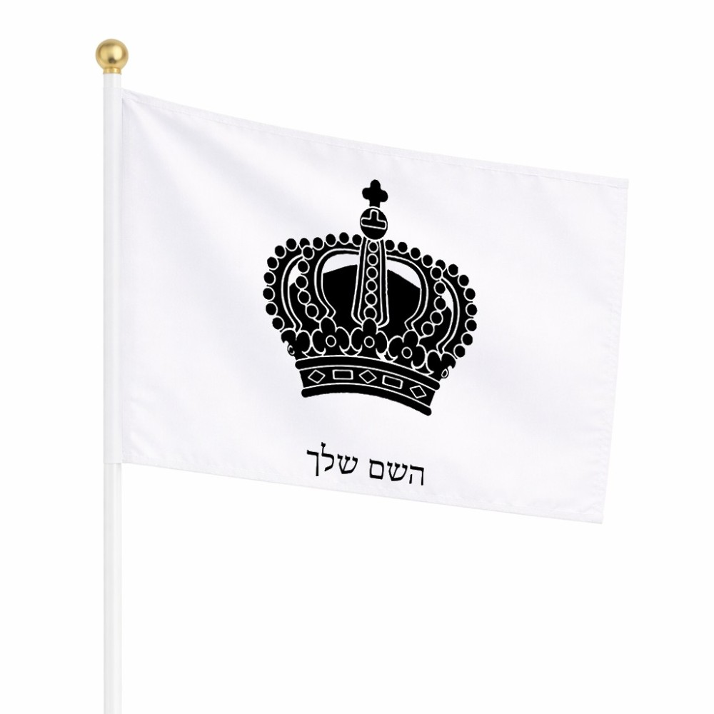 דיגלון בעיצוב אישי עם השם שלך בעיצוב כתר מלכותי גודל הדיגלון 20.5 × 14 ס"מ, ההדפסה מתבצעת בשני צידי הדגל, את השם המבוקש ניתן לציין בהזמנה, אם לא צויין אנחנו ניצור קשר לבירור.
