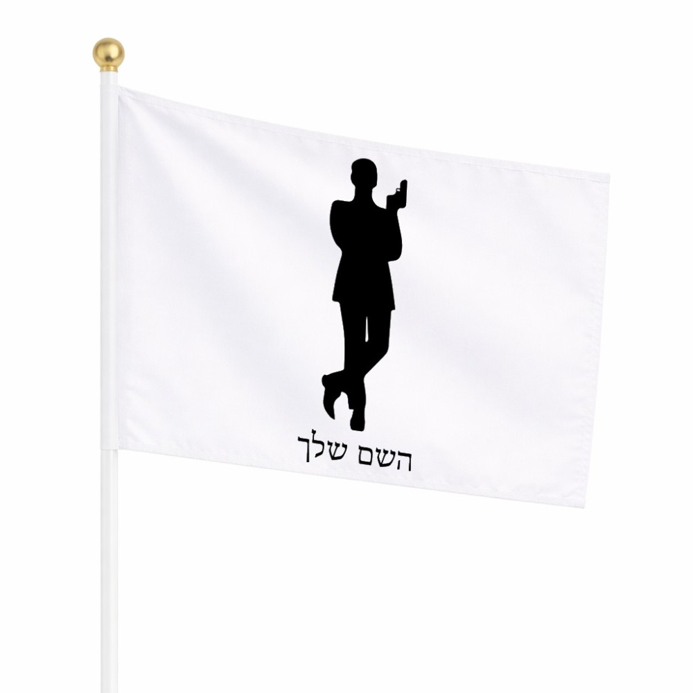 דיגלון בעיצוב אישי עם השם שלך בעיצוב ג'יימס בונד גודל הדיגלון 20.5 × 14 ס"מ, ההדפסה מתבצעת בשני צידי הדגל, את השם המבוקש ניתן לציין בהזמנה, אם לא צויין אנחנו ניצור קשר לבירור.