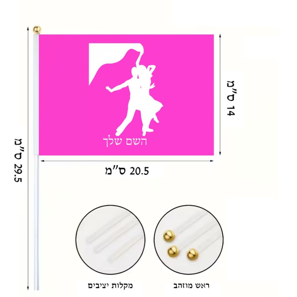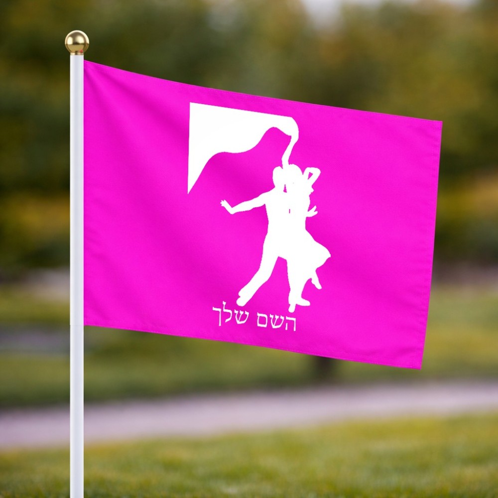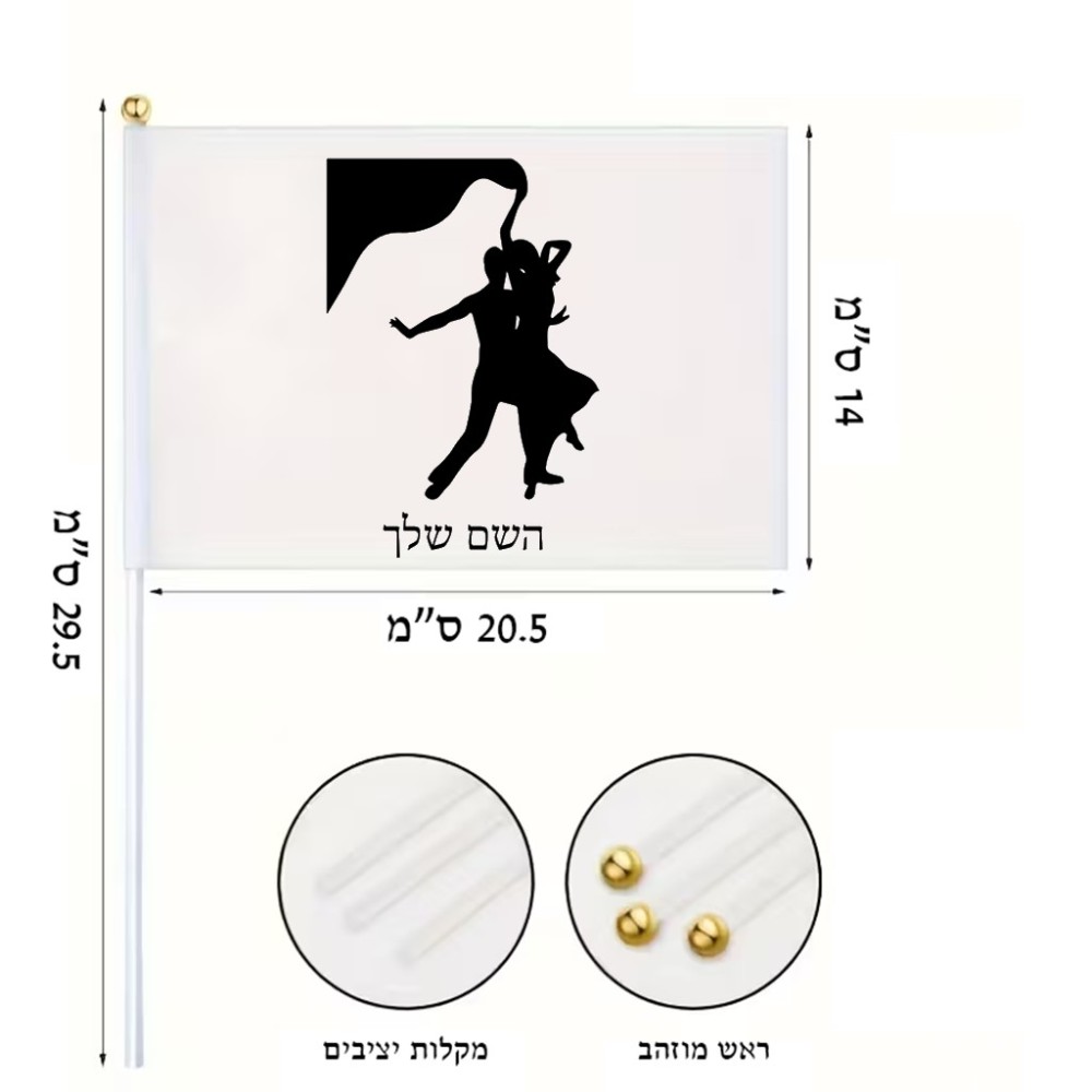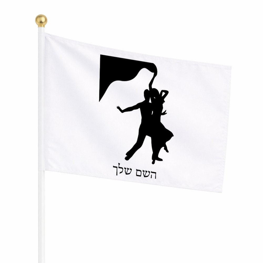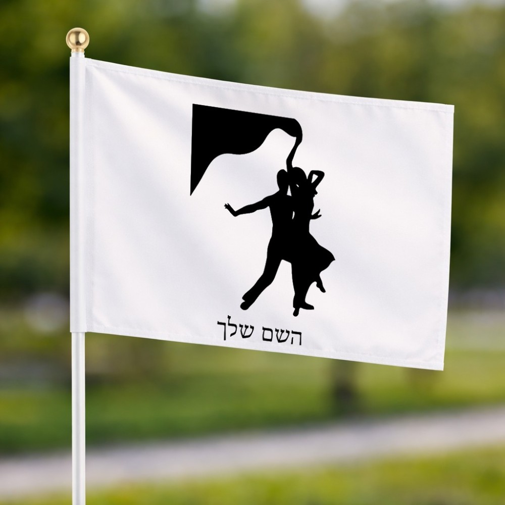 דיגלון בעיצוב אישי עם השם שלך בעיצוב אישה רוקדת עם גבר גודל הדיגלון 20.5 × 14 ס"מ, ההדפסה מתבצעת בשני צידי הדגל, את השם המבוקש ניתן לציין בהזמנה, אם לא צויין אנחנו ניצור קשר לבירור.