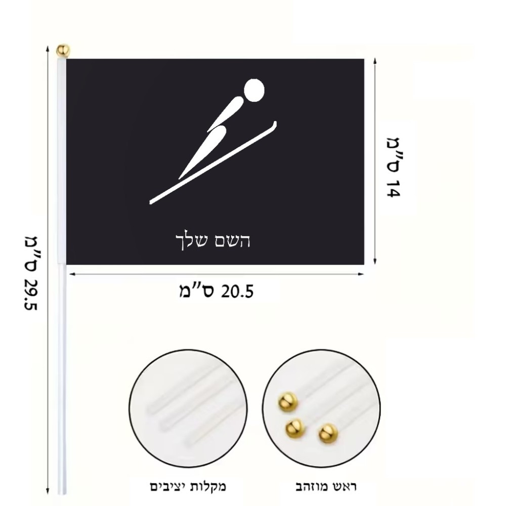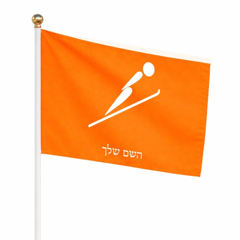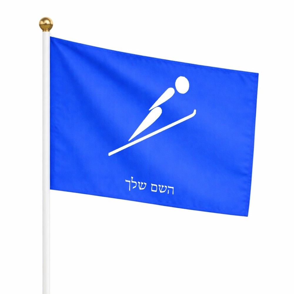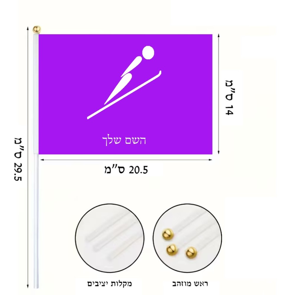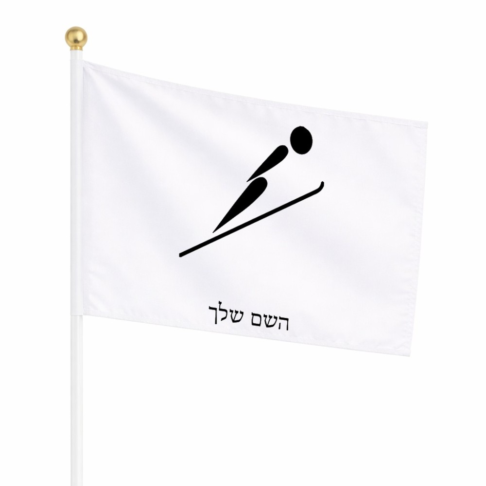 דיגלון בעיצוב אישי עם השם שלך בעיצוב קפיצת סקי אולימפית גודל הדיגלון 20.5 × 14 ס"מ, ההדפסה מתבצעת בשני צידי הדגל, את השם המבוקש ניתן לציין בהזמנה, אם לא צויין אנחנו ניצור קשר לבירור.
