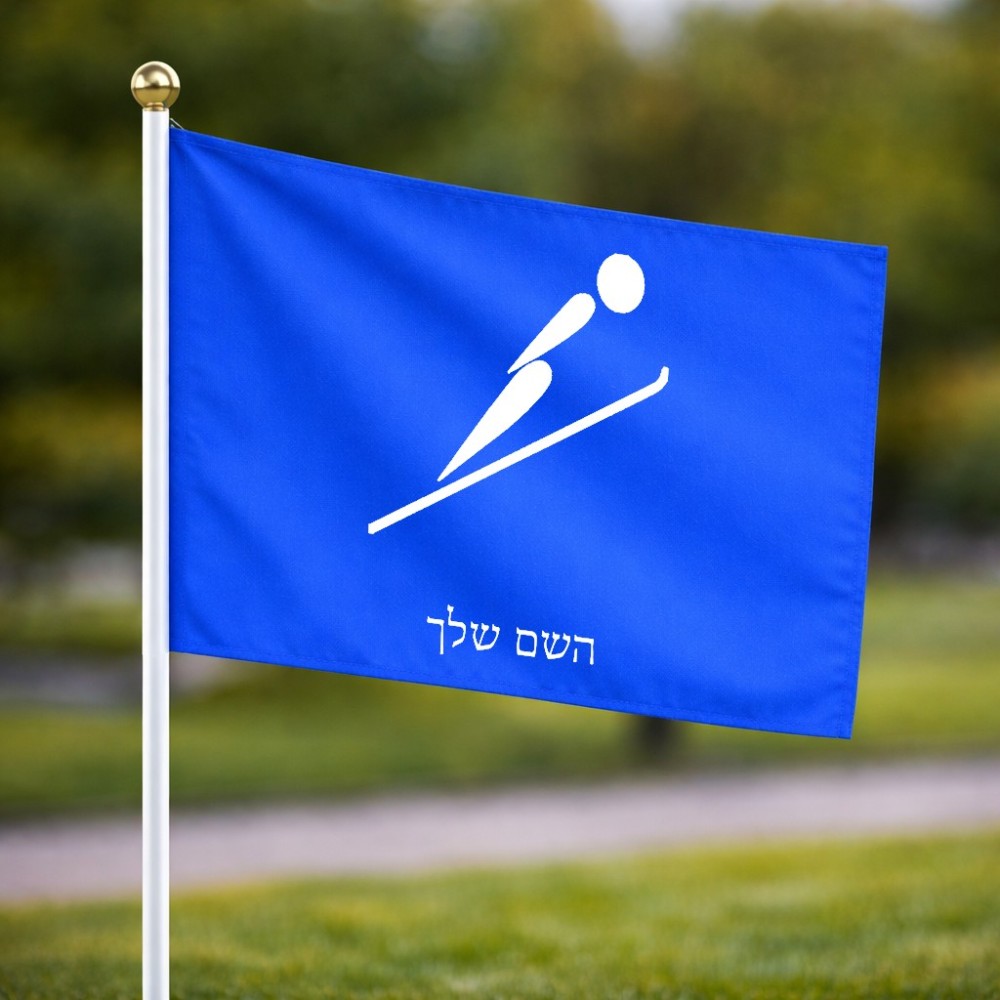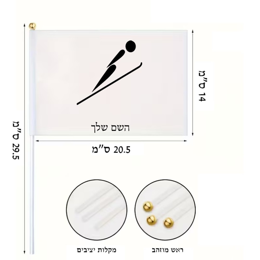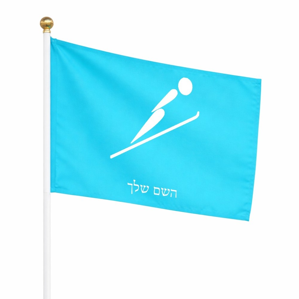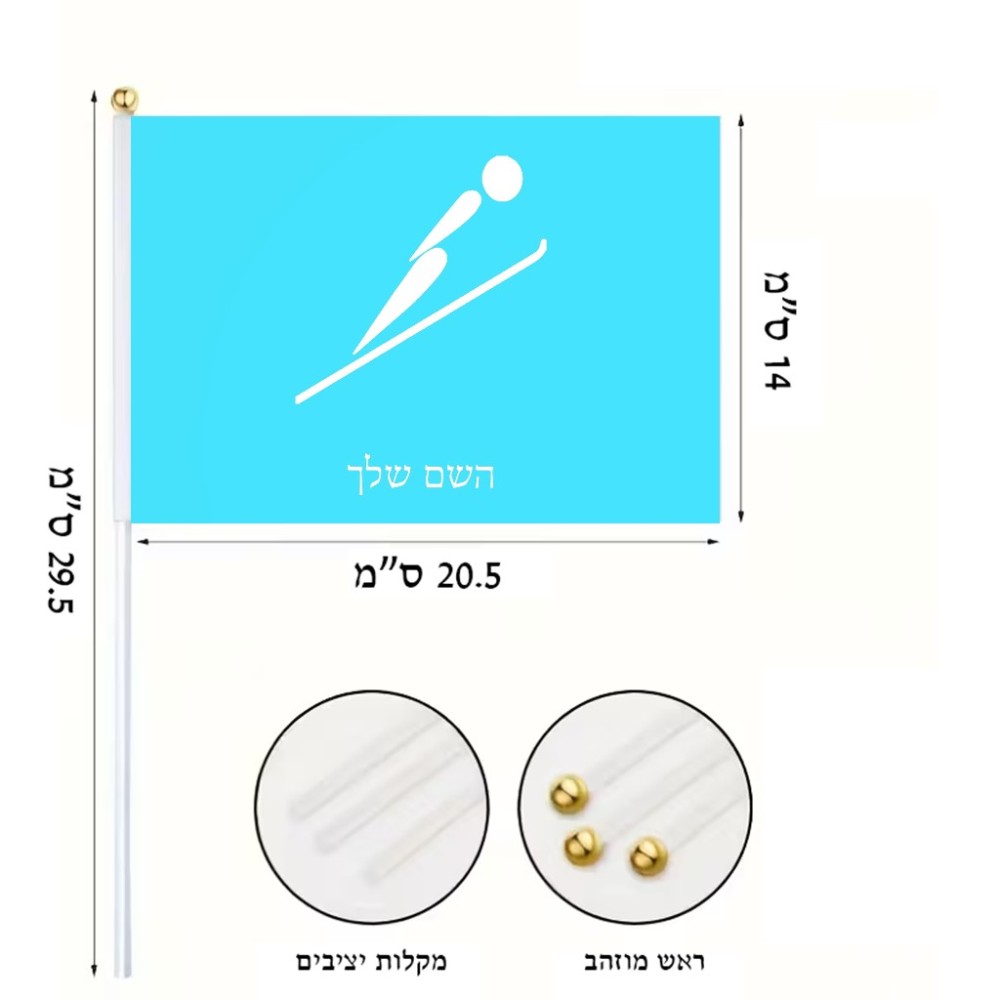 דיגלון בעיצוב אישי עם השם שלך בעיצוב קפיצת סקי אולימפית גודל הדיגלון 20.5 × 14 ס"מ, ההדפסה מתבצעת בשני צידי הדגל, את השם המבוקש ניתן לציין בהזמנה, אם לא צויין אנחנו ניצור קשר לבירור.