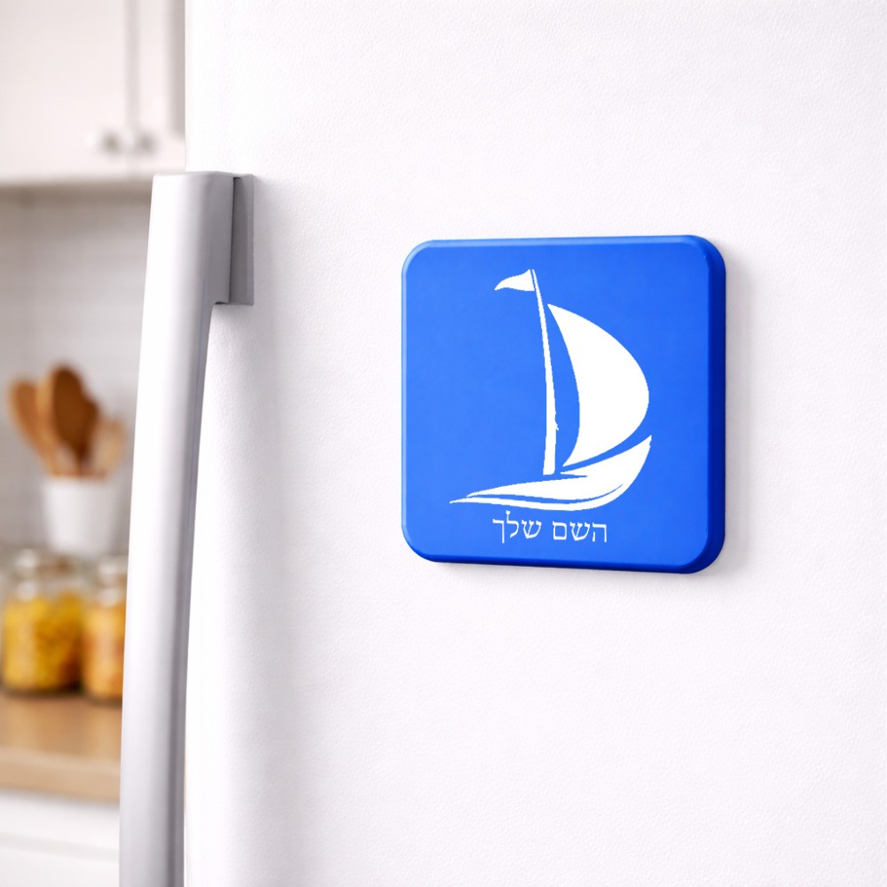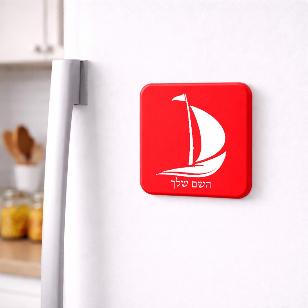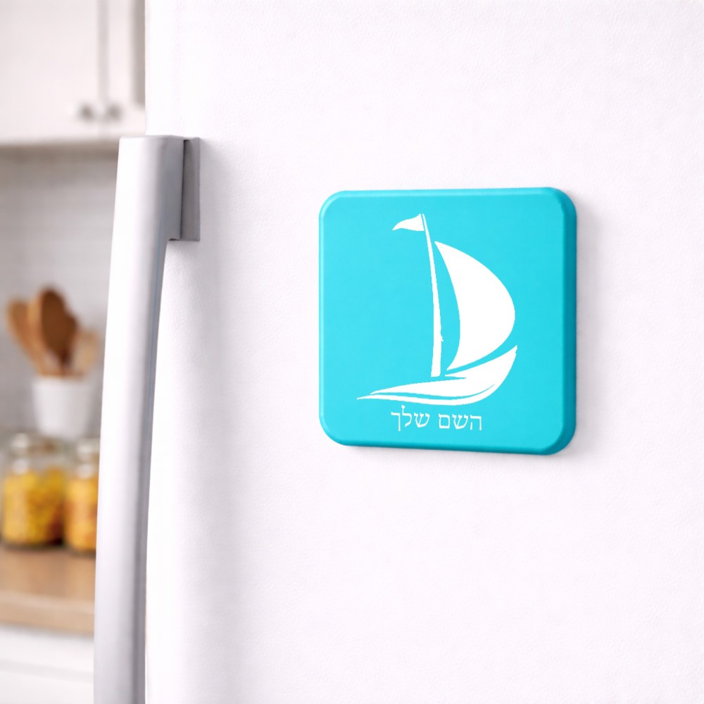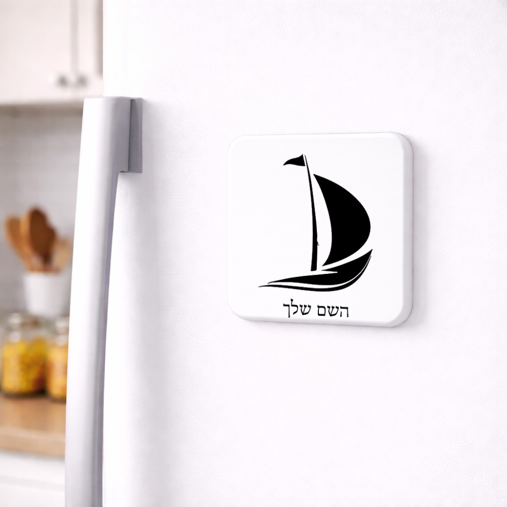 מגנט למקרר בעיצוב אישי עם השם שלך בעיצוב סירה גודל המגנט 6.5 × 6.5 ס"מ. את השם המבוקש ניתן לציין בהזמנה, אם לא צויין אנחנו ניצור קשר לבירור.