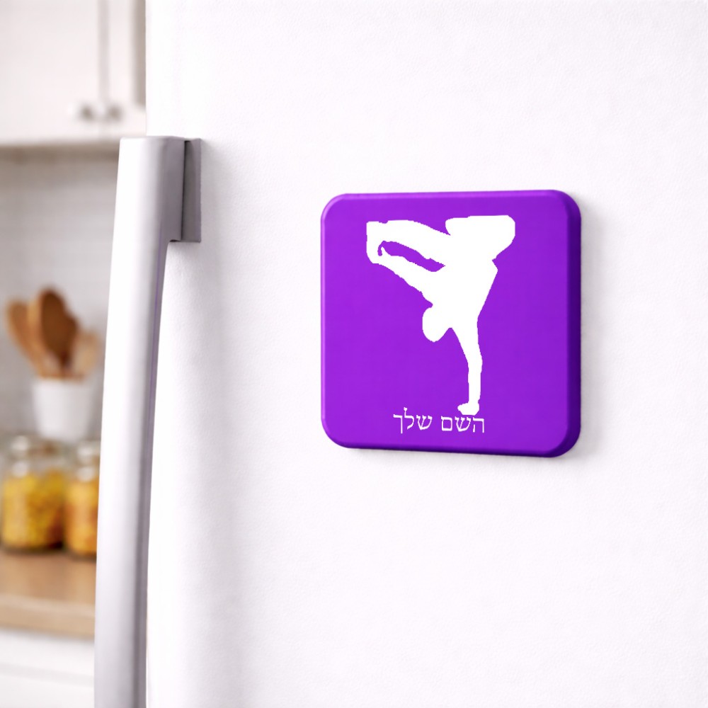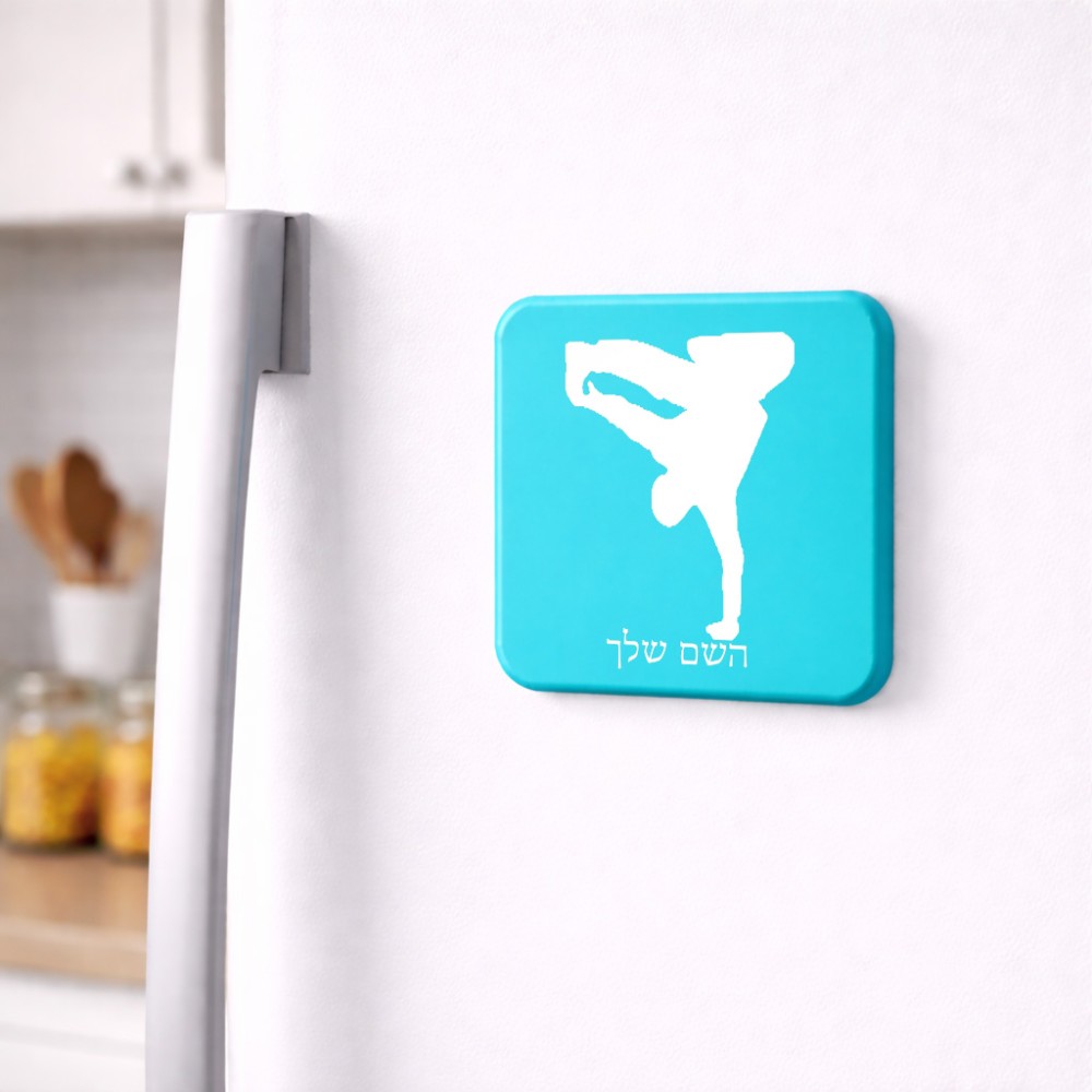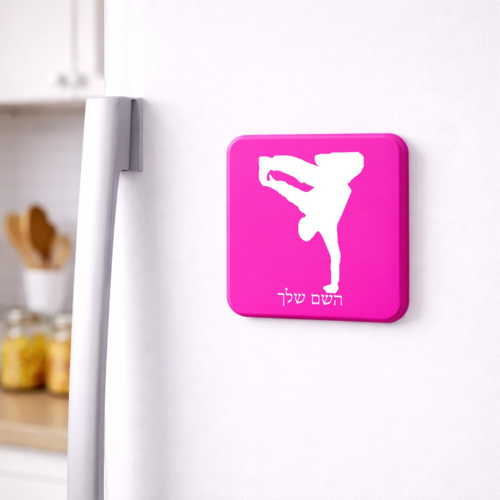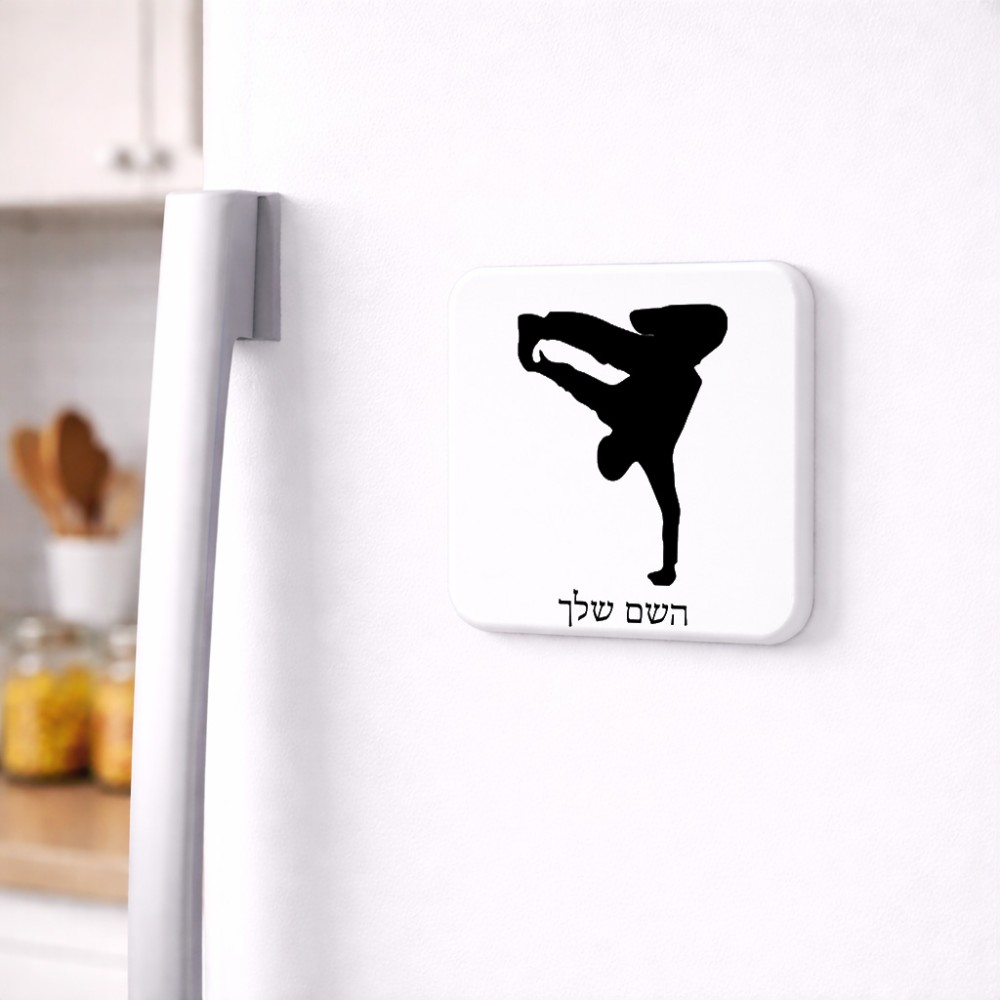 מגנט למקרר בעיצוב אישי עם השם שלך בעיצוב ברייקדאנס גודל המגנט 6.5 × 6.5 ס"מ. את השם המבוקש ניתן לציין בהזמנה, אם לא צויין אנחנו ניצור קשר לבירור.
