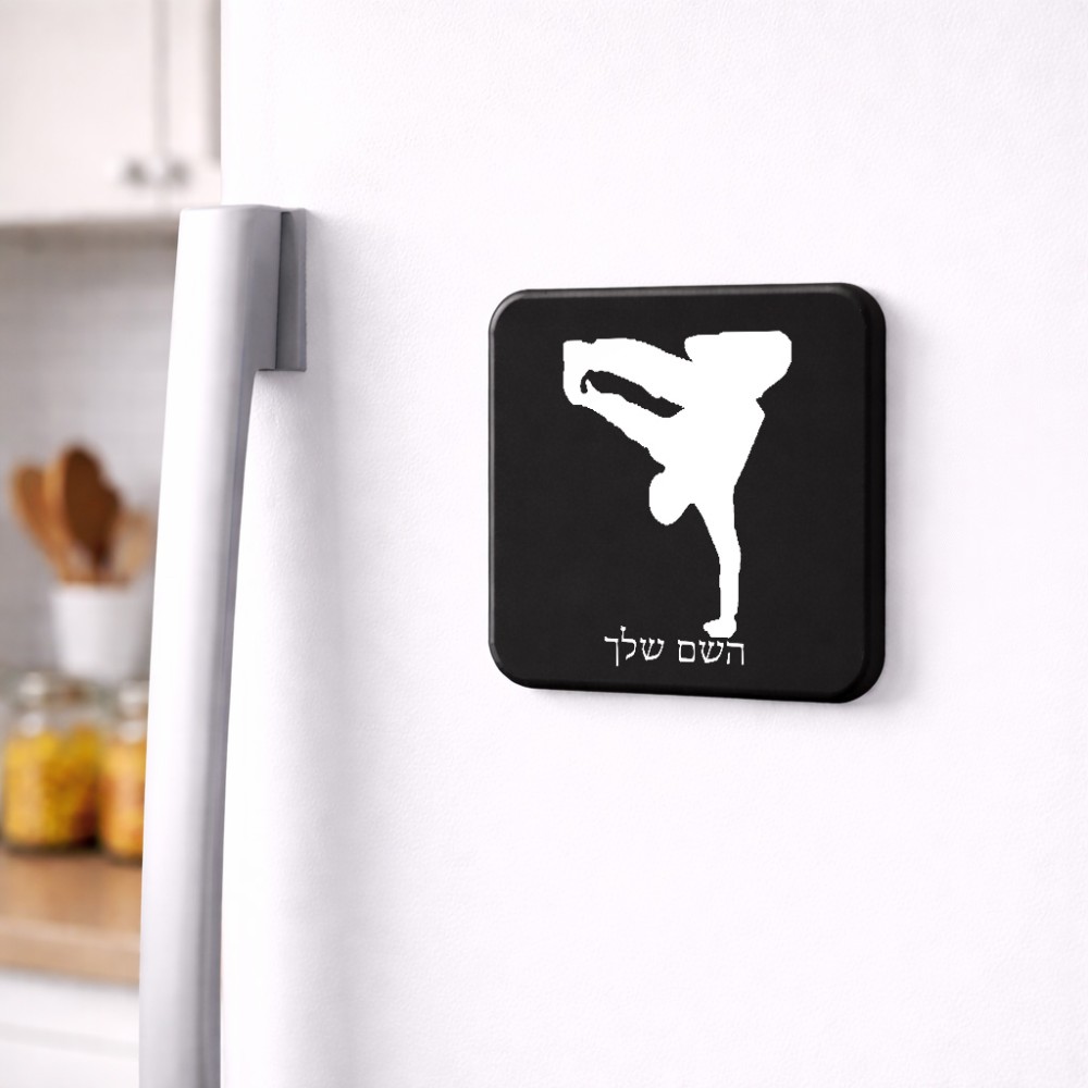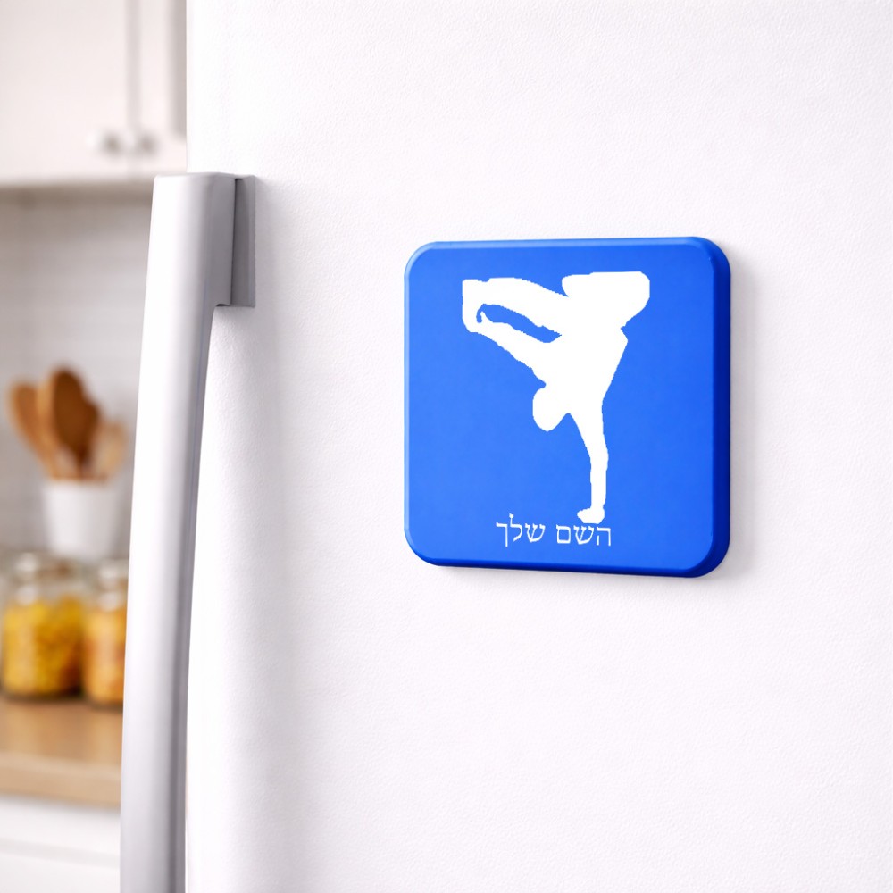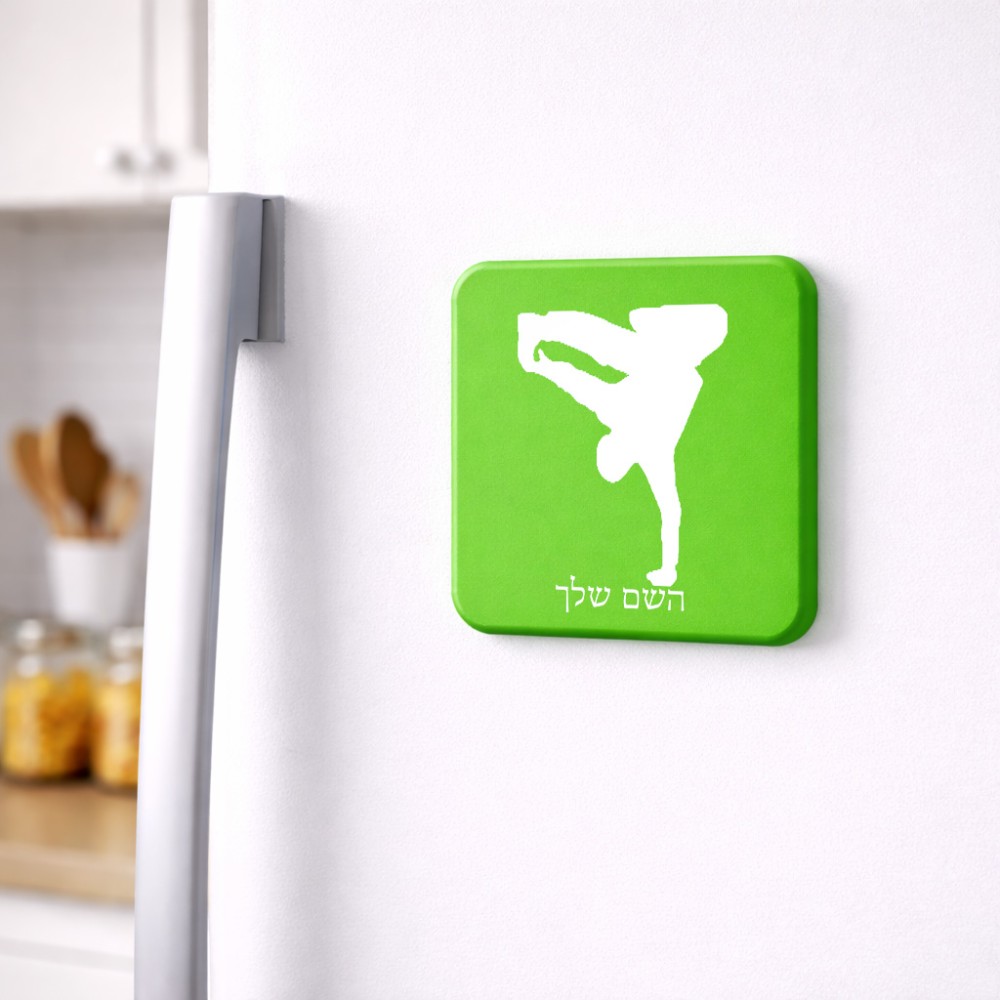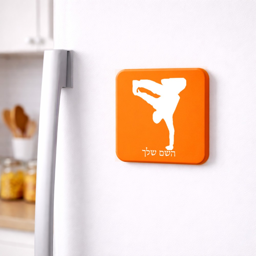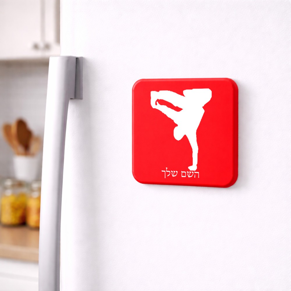 מגנט למקרר בעיצוב אישי עם השם שלך בעיצוב ברייקדאנס גודל המגנט 6.5 × 6.5 ס"מ. את השם המבוקש ניתן לציין בהזמנה, אם לא צויין אנחנו ניצור קשר לבירור.