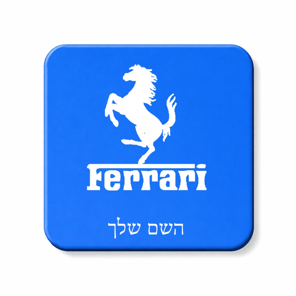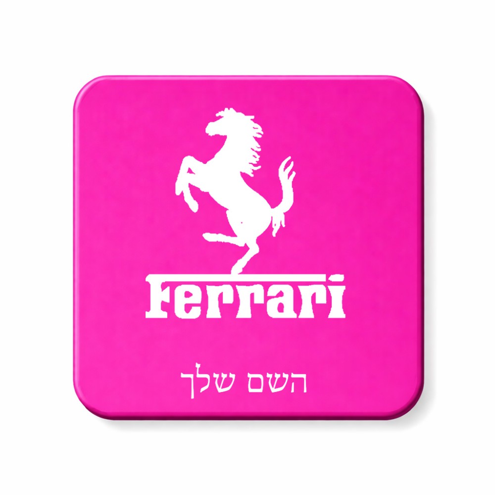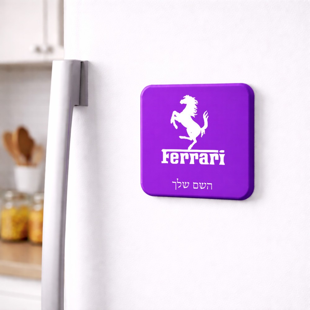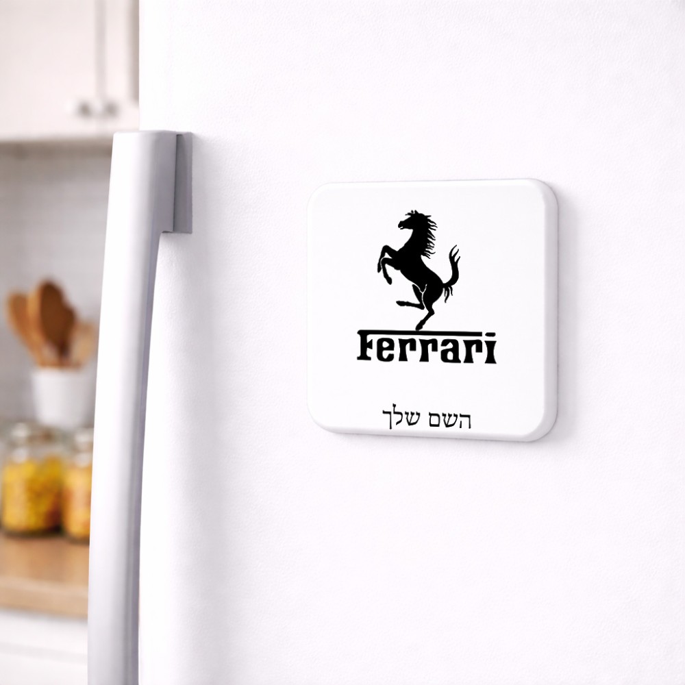 מגנט למקרר בעיצוב אישי עם השם שלך בעיצוב פרארי גודל המגנט 6.5 × 6.5 ס"מ. את השם המבוקש ניתן לציין בהזמנה, אם לא צויין אנחנו ניצור קשר לבירור.