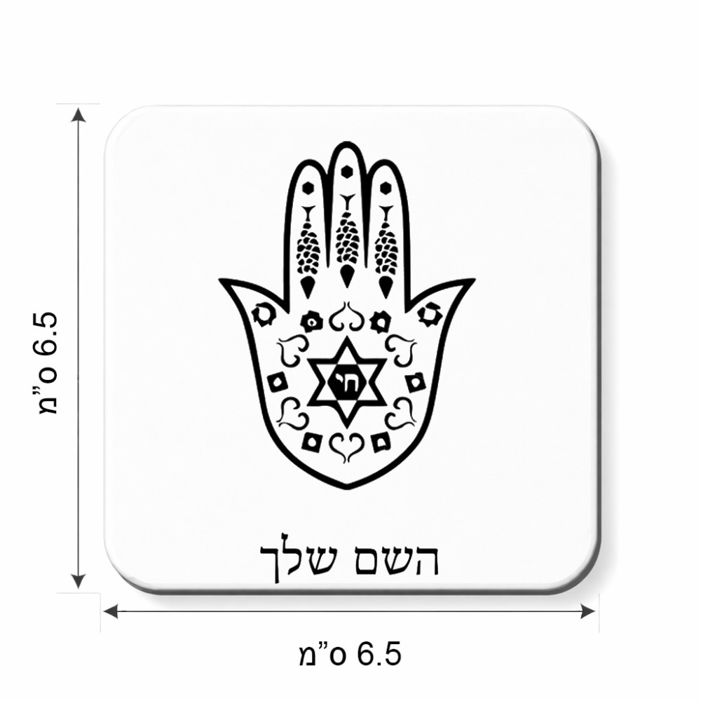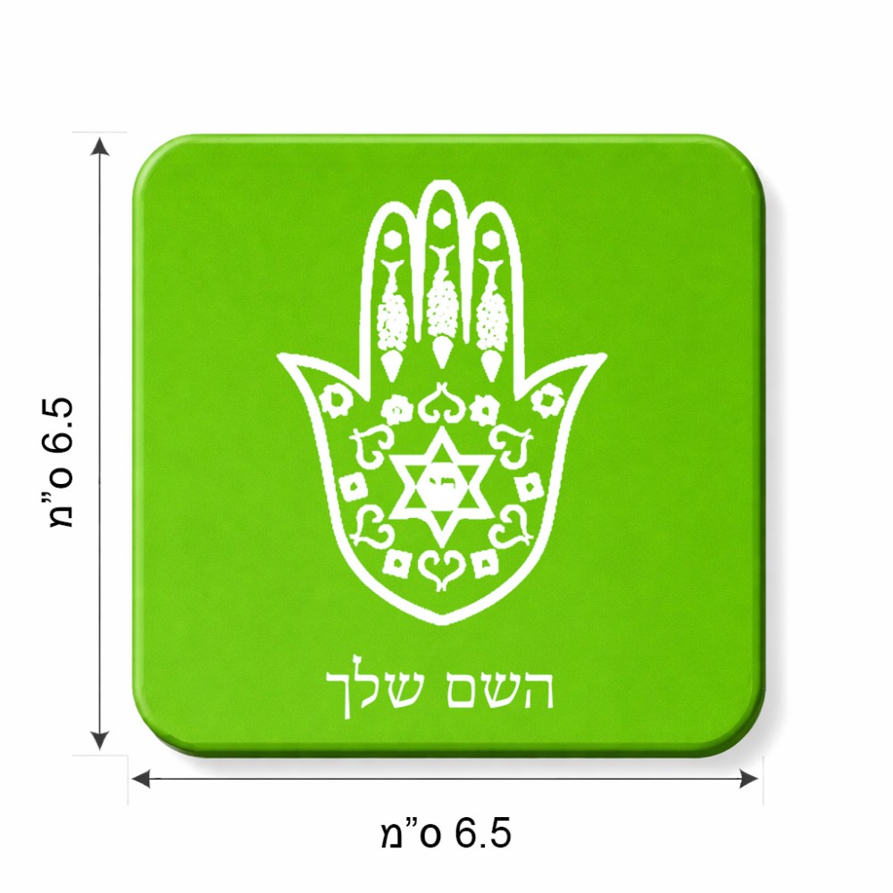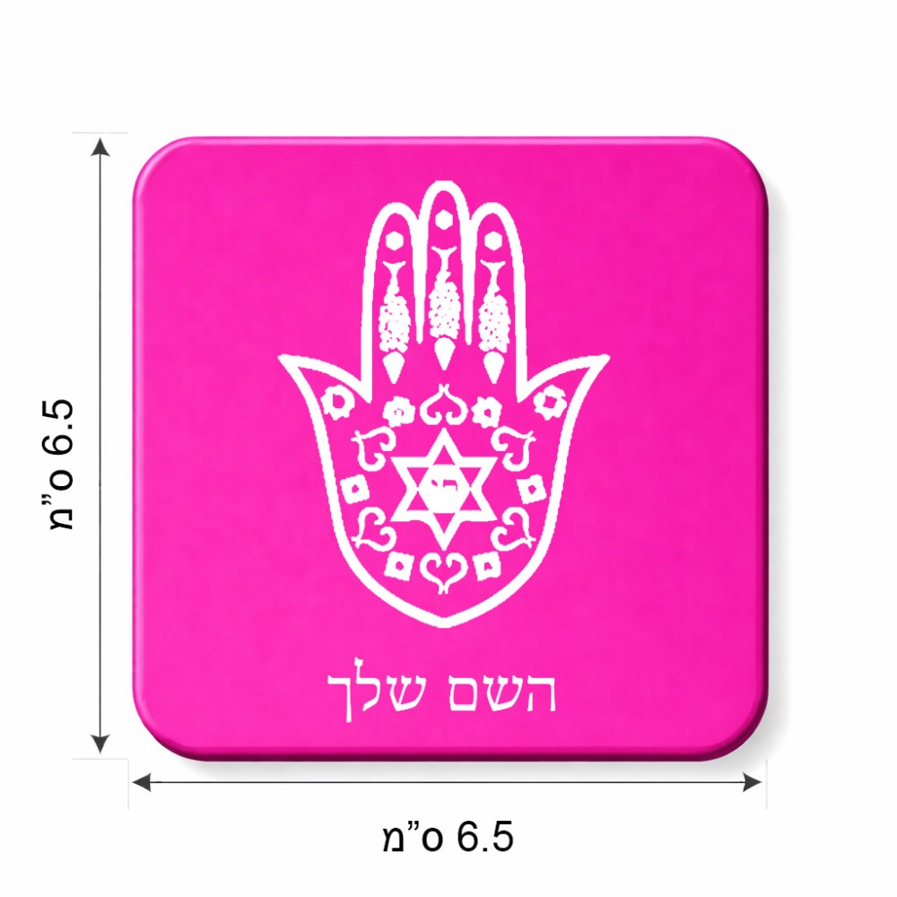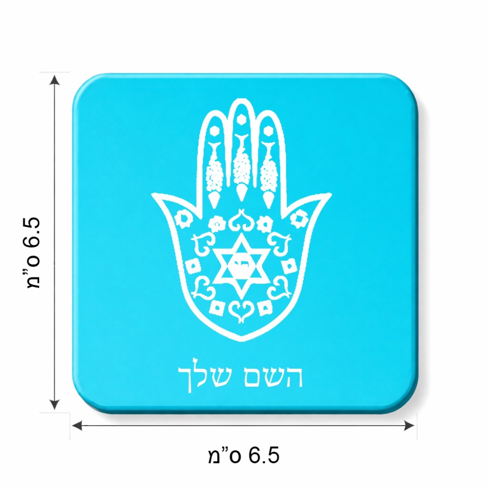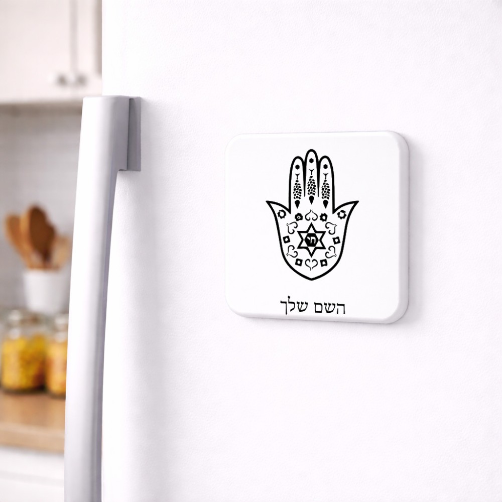 מגנט למקרר בעיצוב אישי עם השם שלך בעיצוב חמסה - קבלה גודל המגנט 6.5 × 6.5 ס"מ. את השם המבוקש ניתן לציין בהזמנה, אם לא צויין אנחנו ניצור קשר לבירור.
