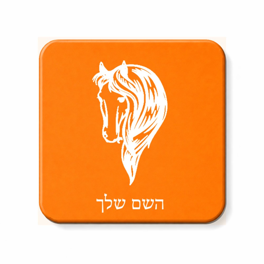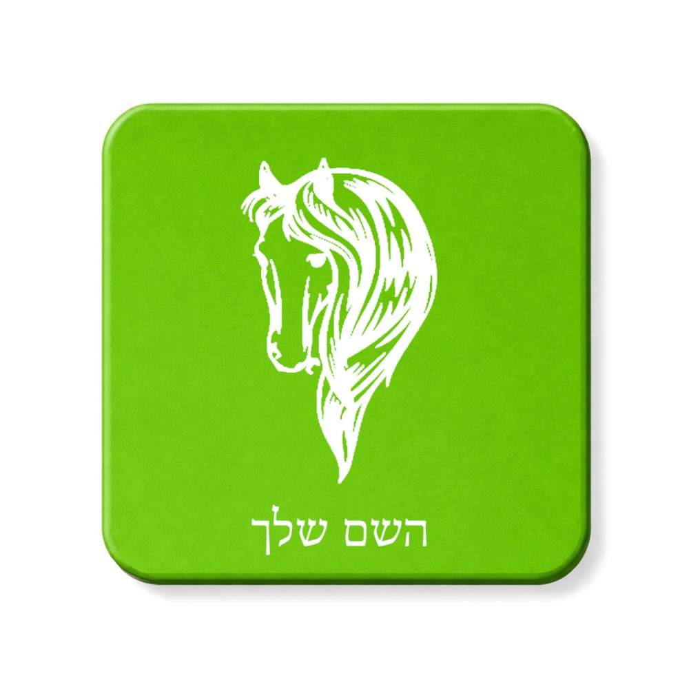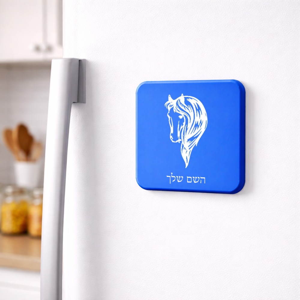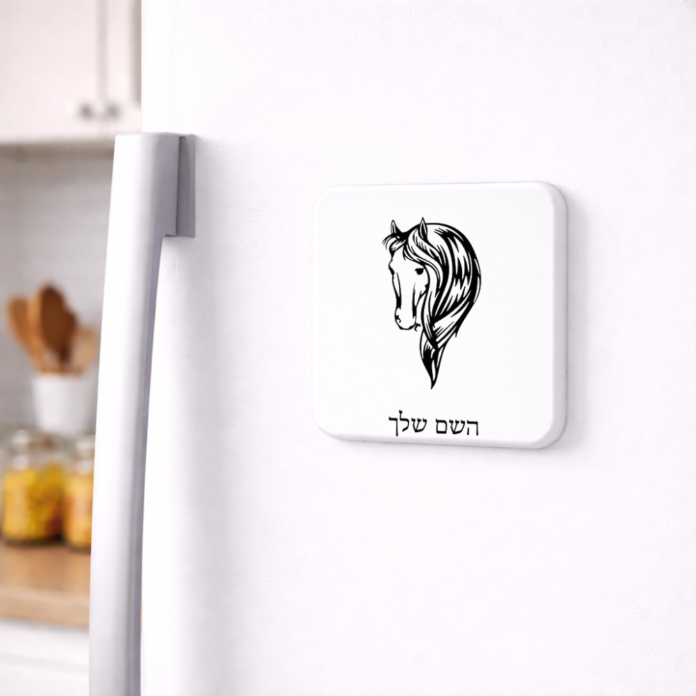 מגנט למקרר בעיצוב אישי עם השם שלך בעיצוב ראש סוס גודל המגנט 6.5 × 6.5 ס"מ. את השם המבוקש ניתן לציין בהזמנה, אם לא צויין אנחנו ניצור קשר לבירור.