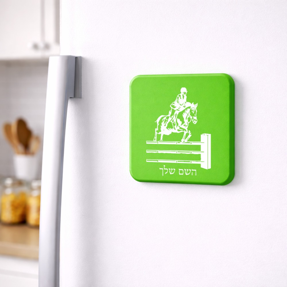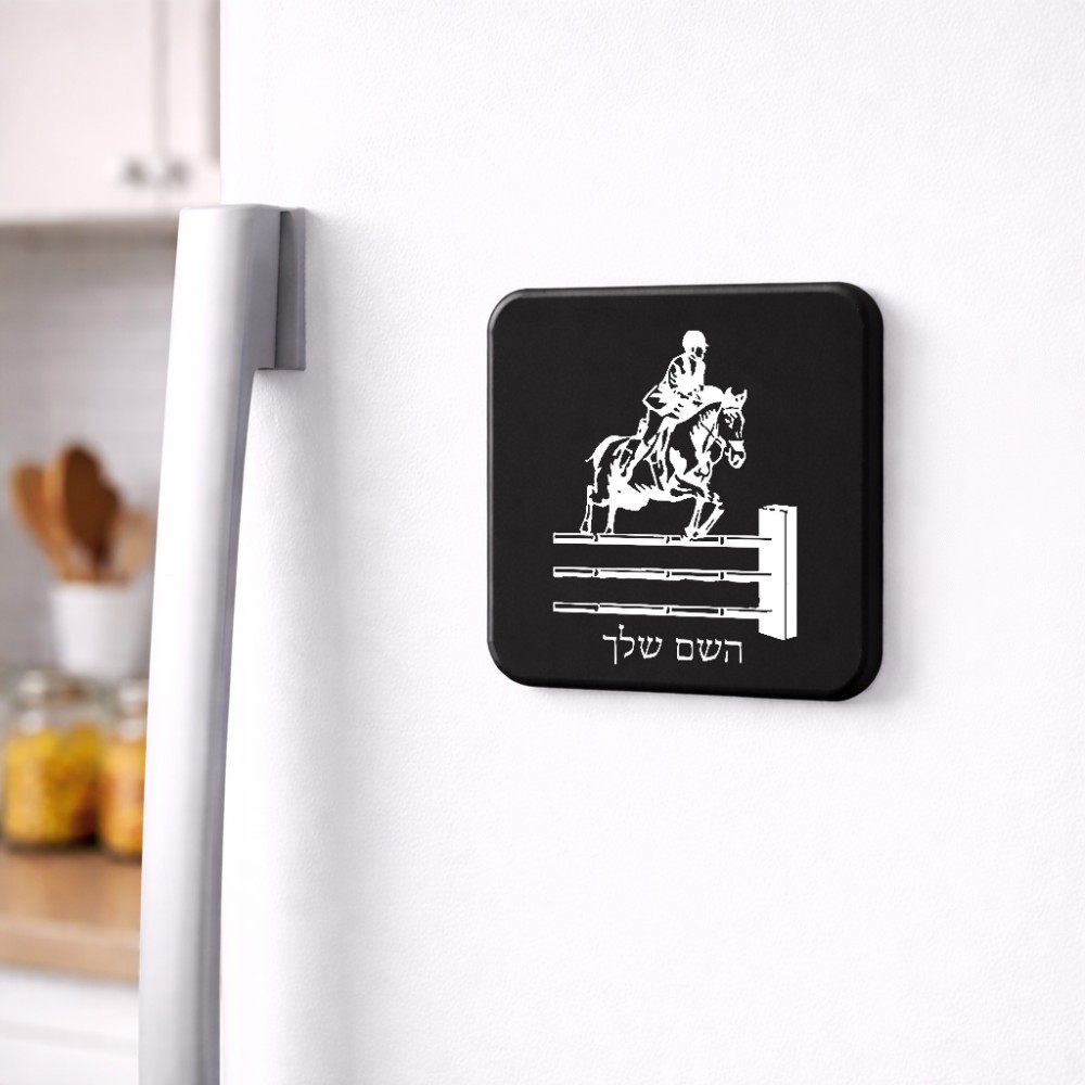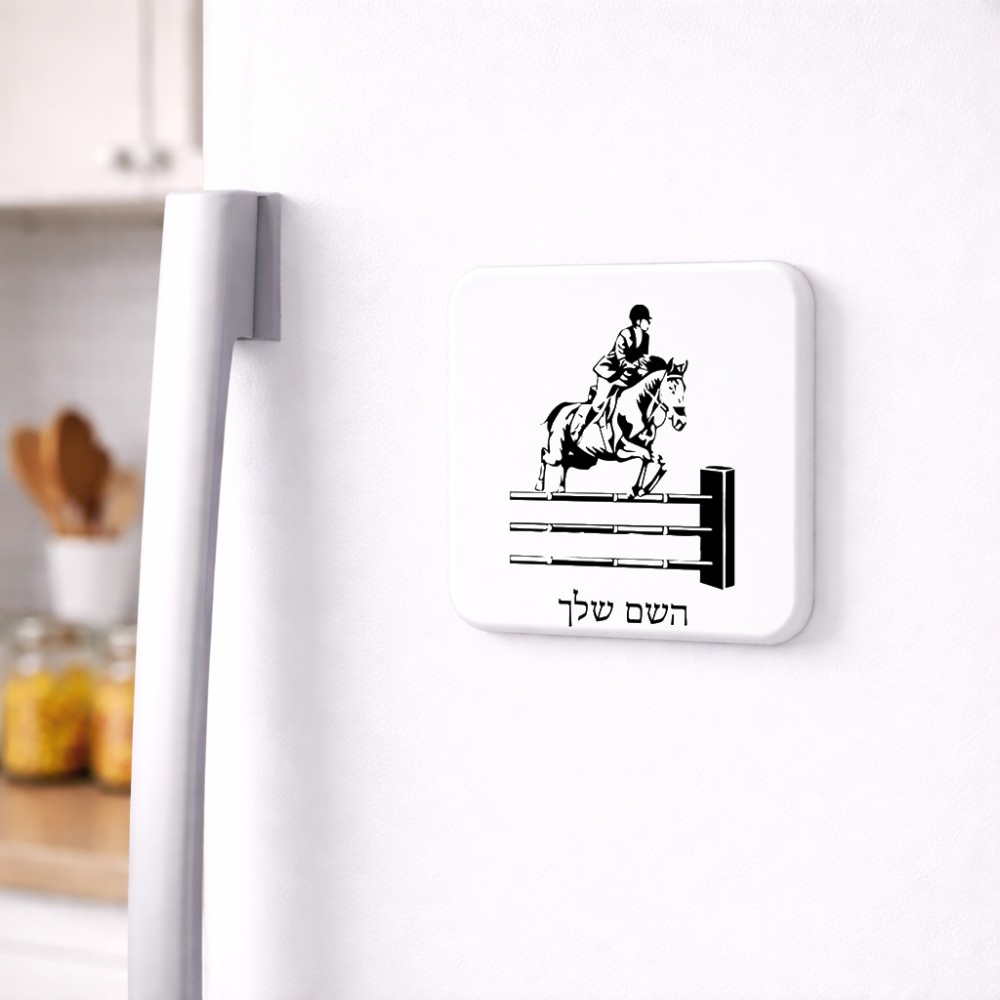 מגנט למקרר בעיצוב אישי עם השם שלך בעיצוב רוכב סוסים גודל המגנט 6.5 × 6.5 ס"מ