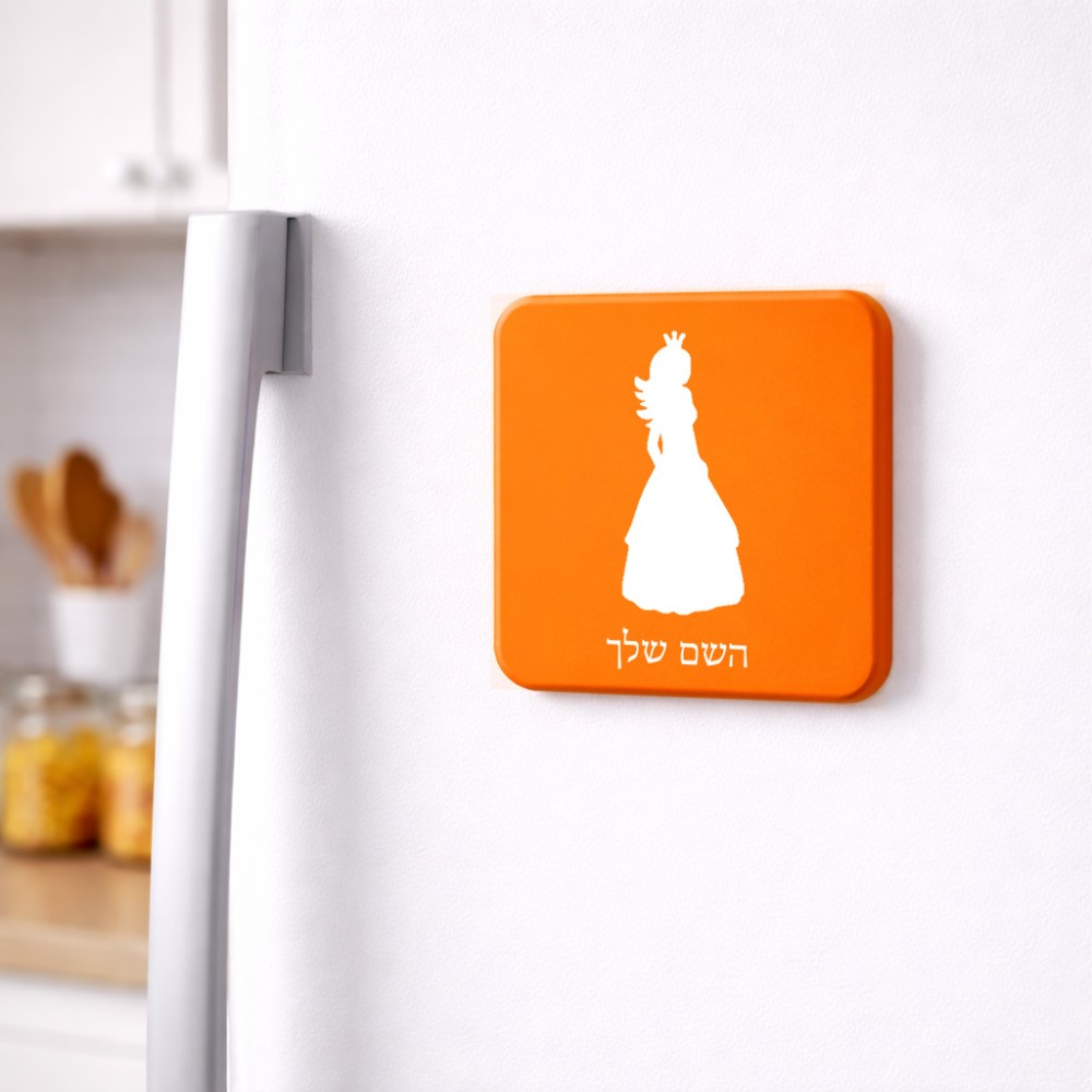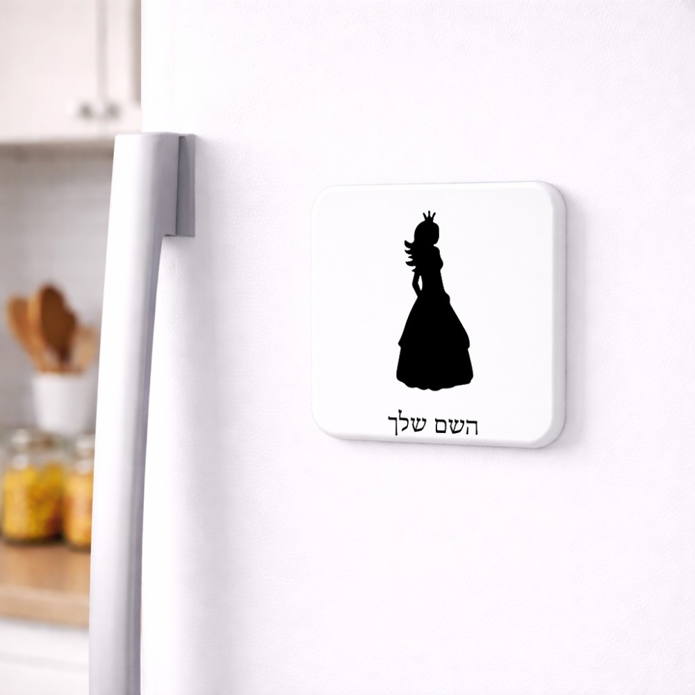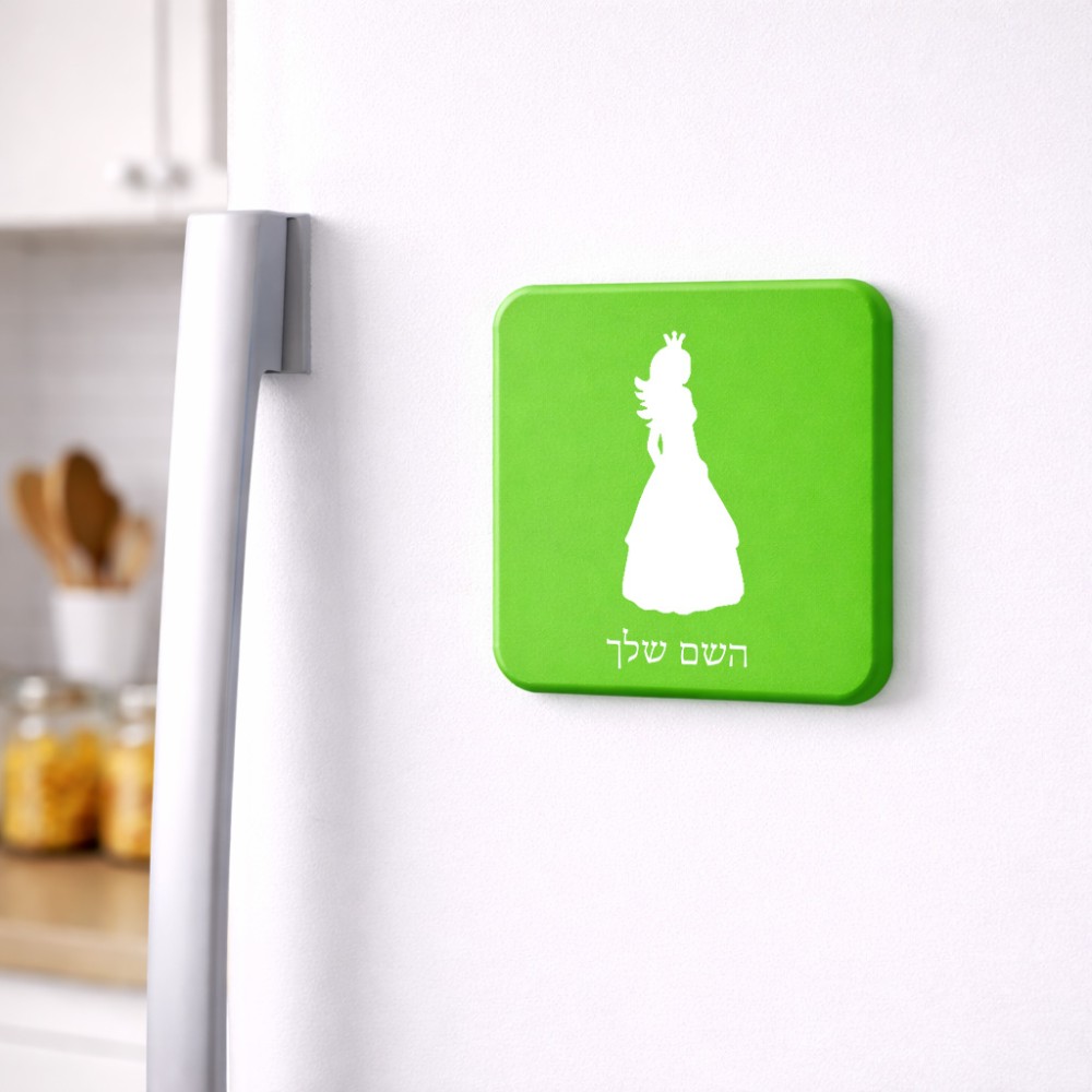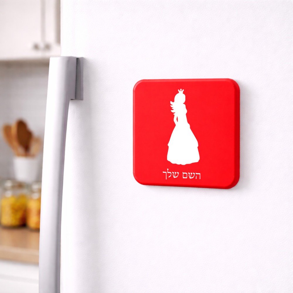 מגנט למקרר בעיצוב אישי עם השם שלך בעיצוב נסיכה גודל המגנט 6.5 × 6.5 ס"מ. את השם המבוקש ניתן לציין בהזמנה, אם לא צויין אנחנו ניצור קשר לבירור.