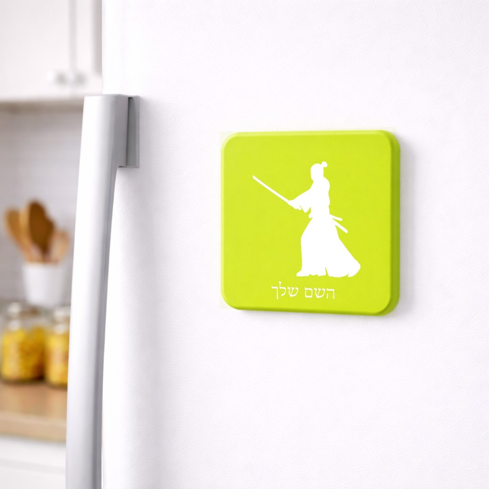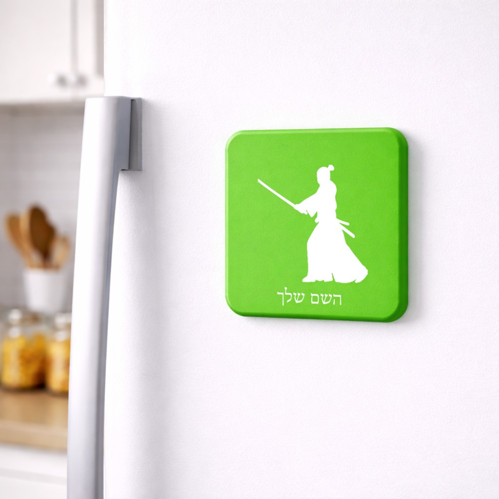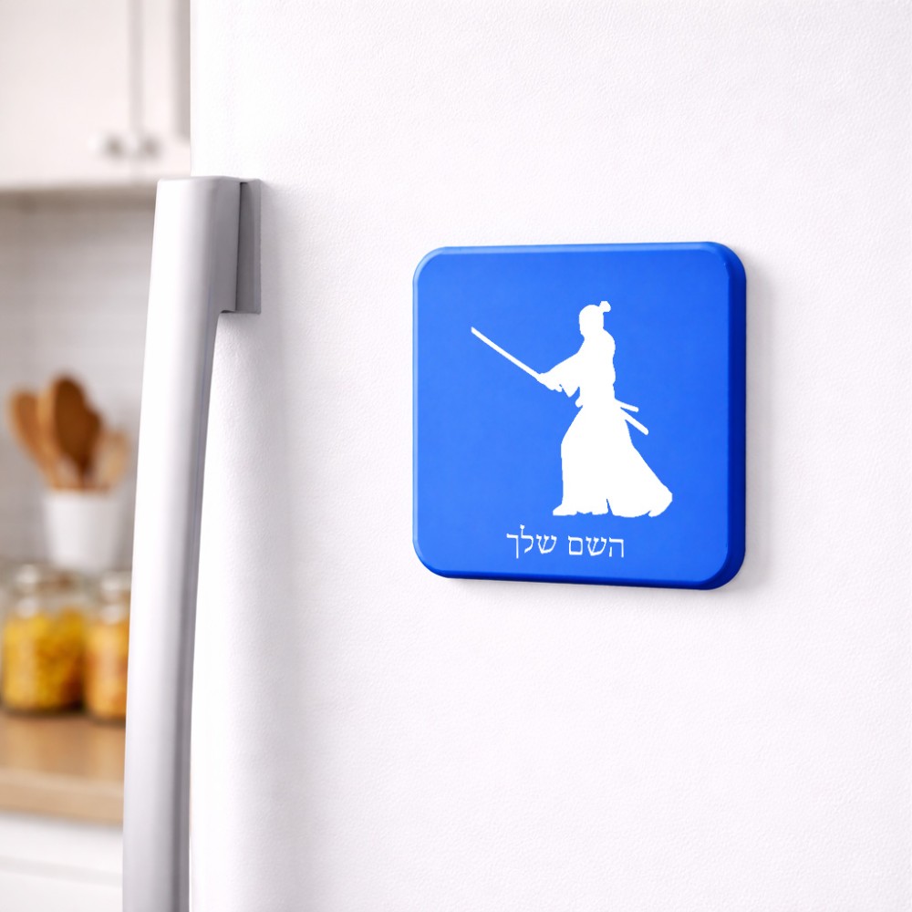 מגנט למקרר בעיצוב אישי עם השם שלך בעיצוב סמוראי גודל המגנט 6.5 × 6.5 ס"מ. את השם המבוקש ניתן לציין בהזמנה, אם לא צויין אנחנו ניצור קשר לבירור.