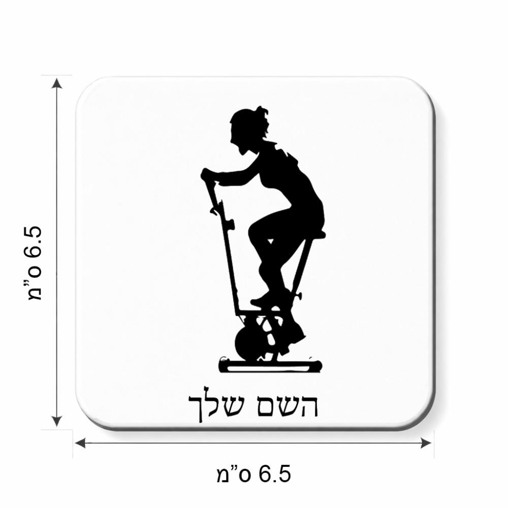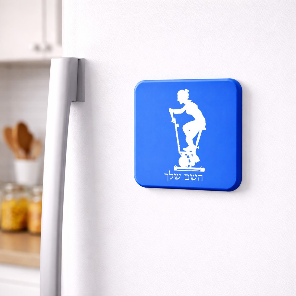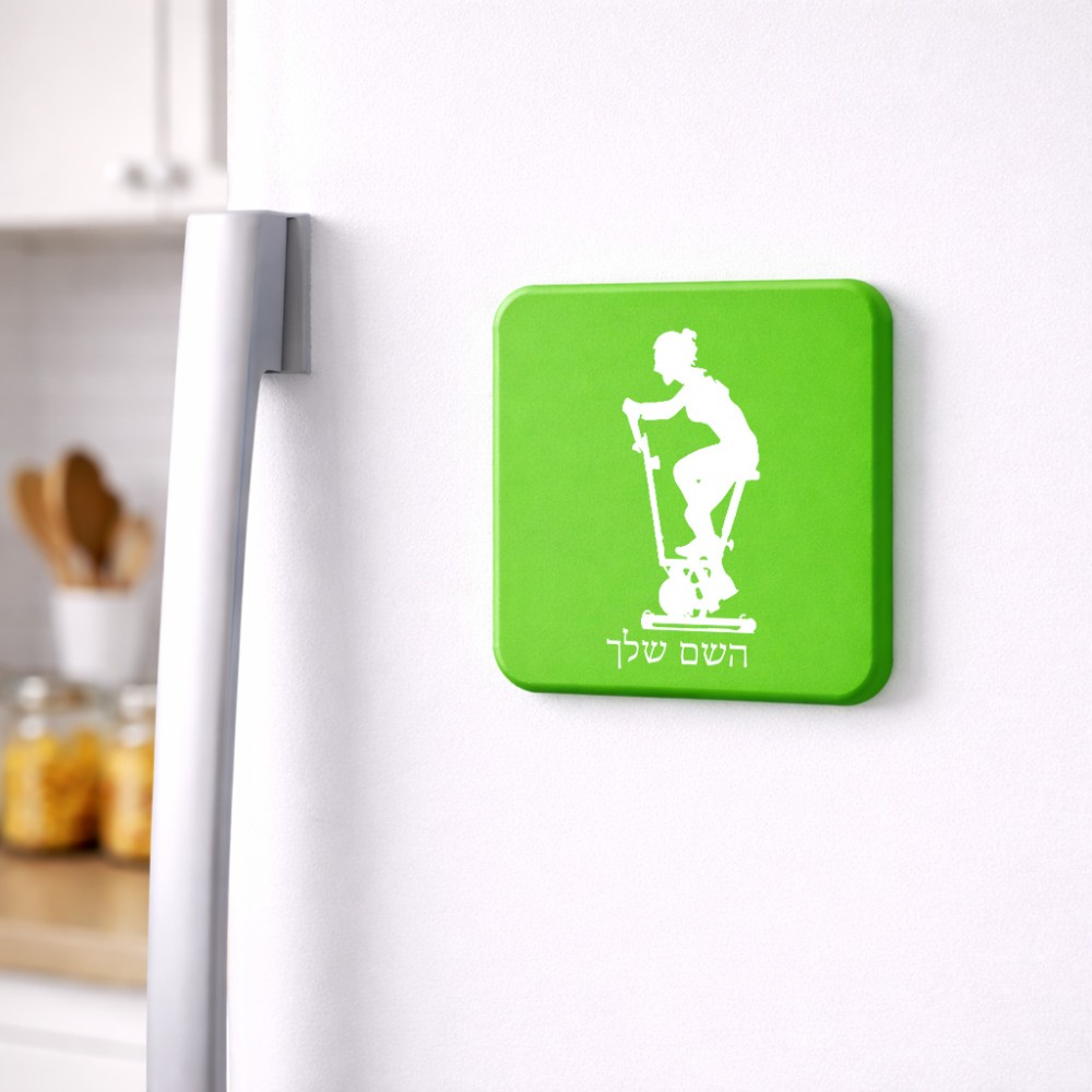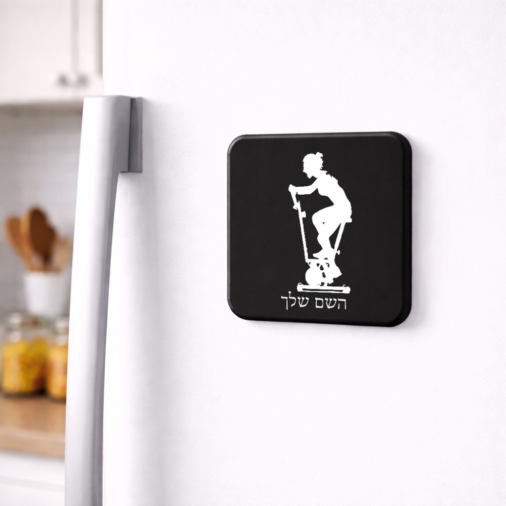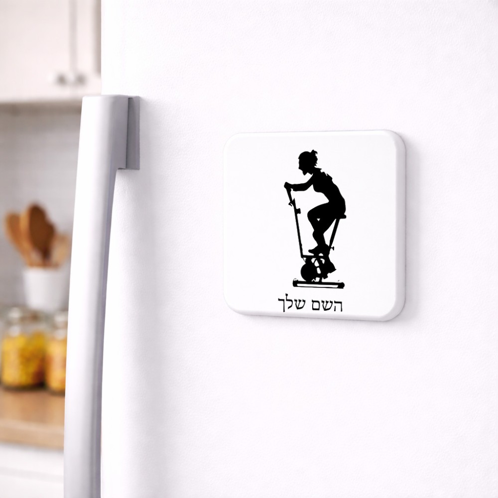 מגנט למקרר בעיצוב אישי עם השם שלך בעיצוב אימון ספינינג - אישה גודל המגנט 6.5 × 6.5 ס"מ