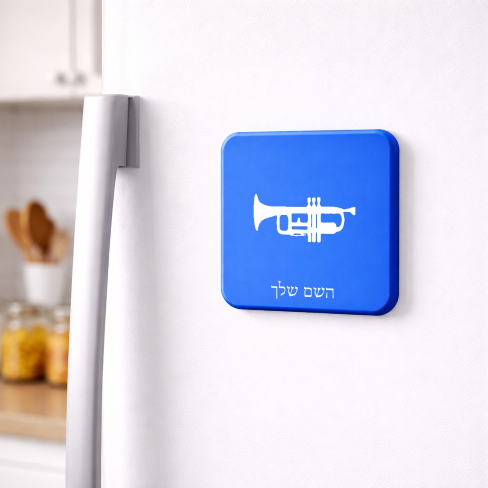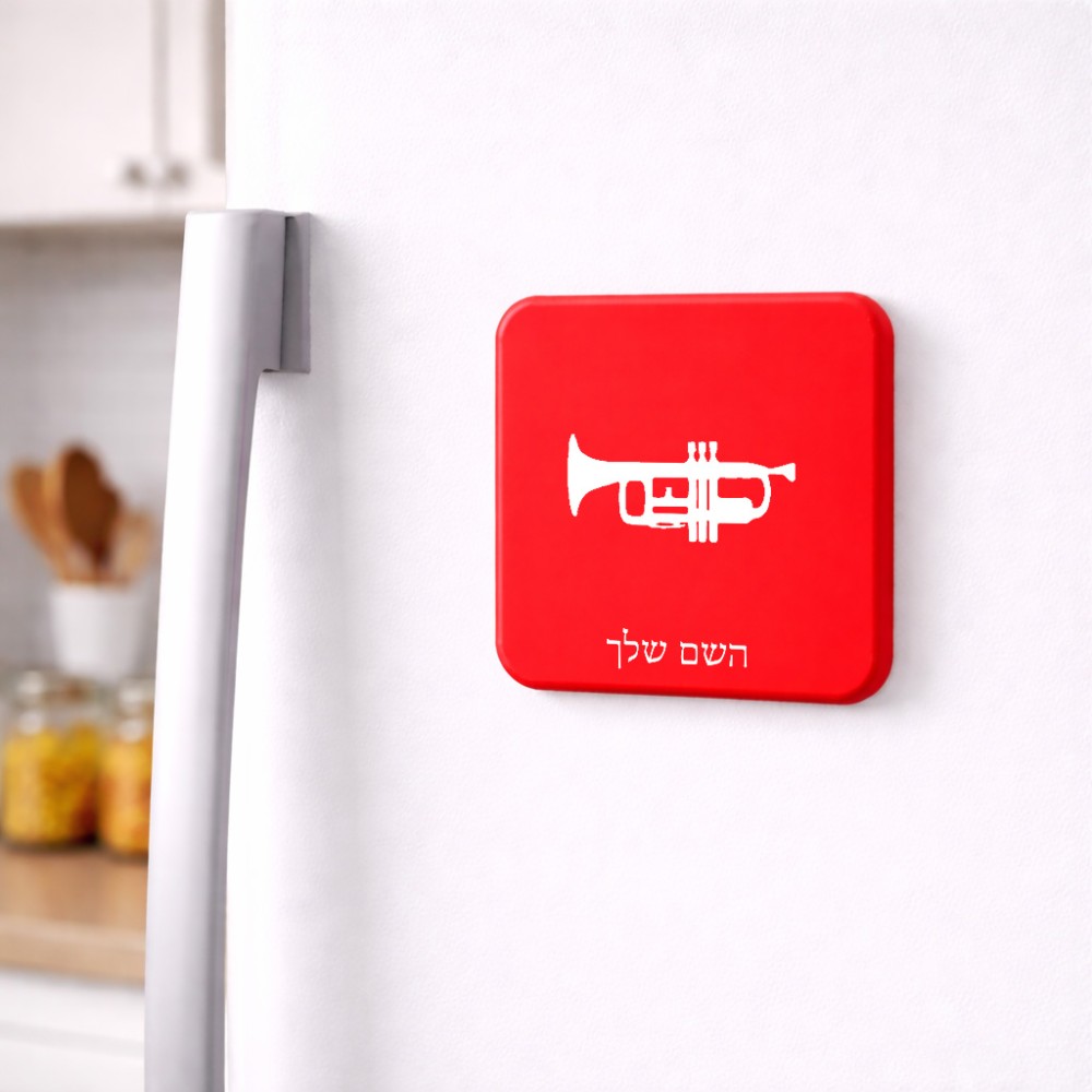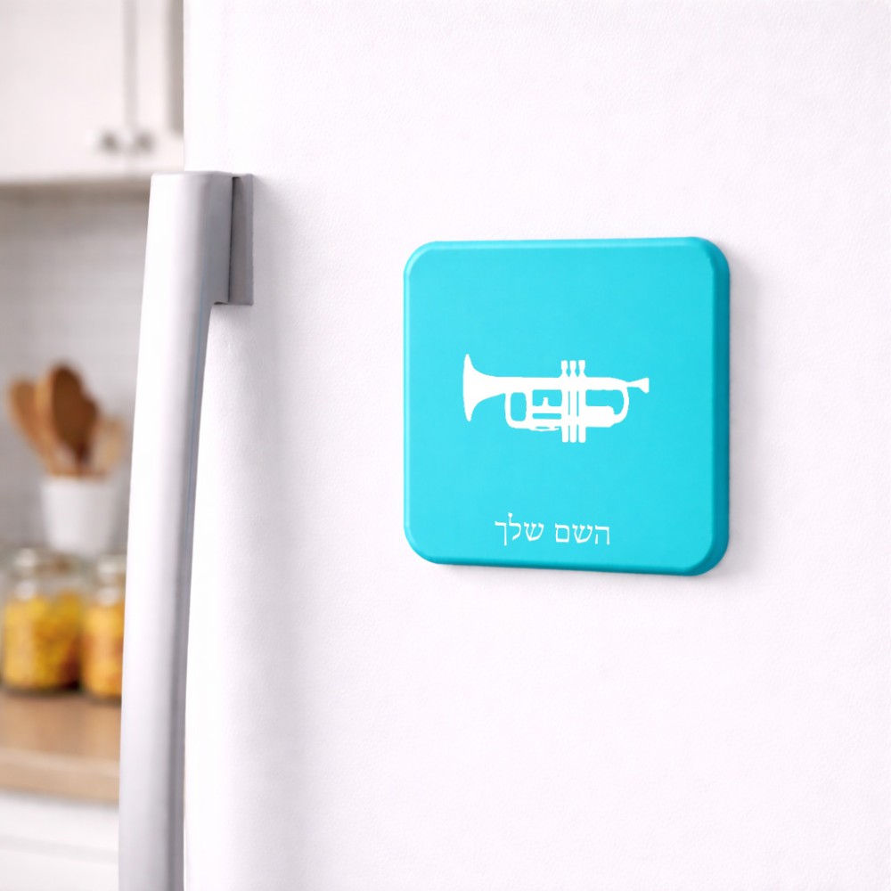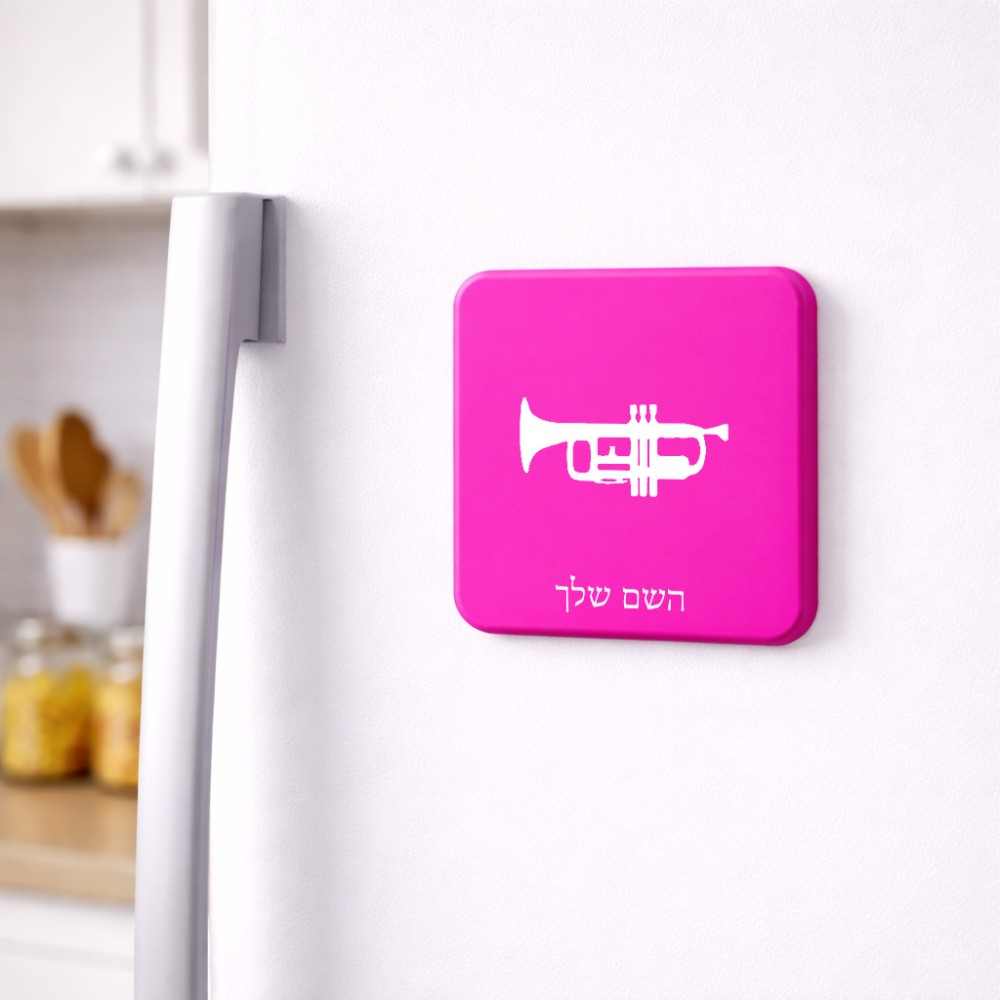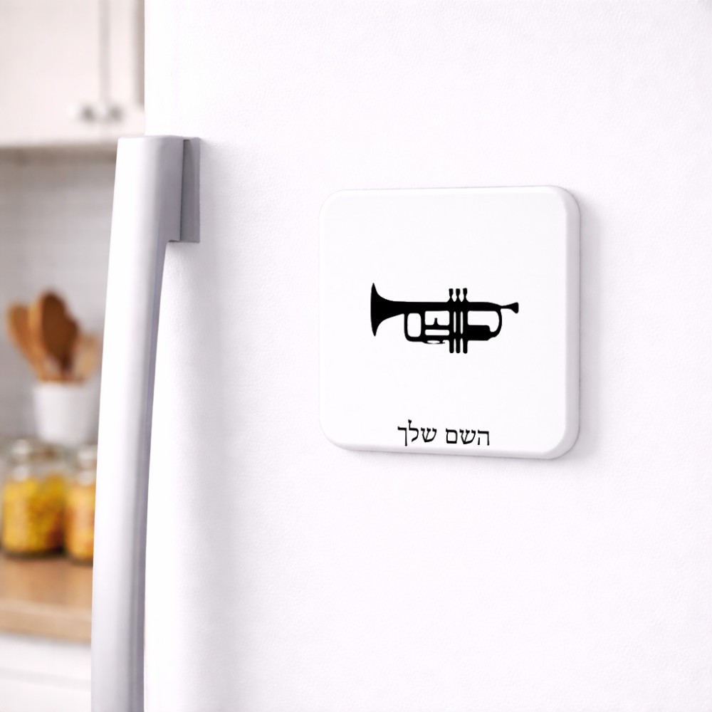 מגנט למקרר בעיצוב אישי עם השם שלך בעיצוב חצוצרה גודל המגנט 6.5 × 6.5 ס"מ. את השם המבוקש ניתן לציין בהזמנה, אם לא צויין אנחנו ניצור קשר לבירור.