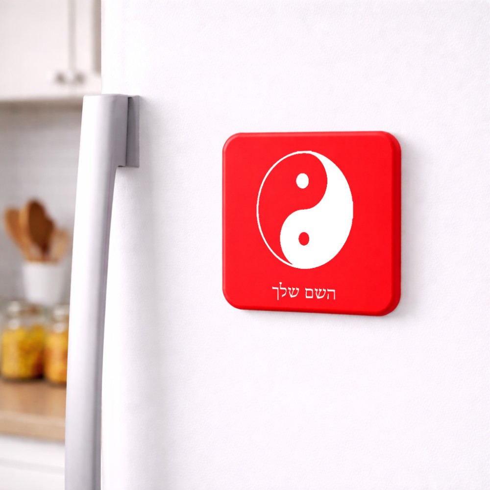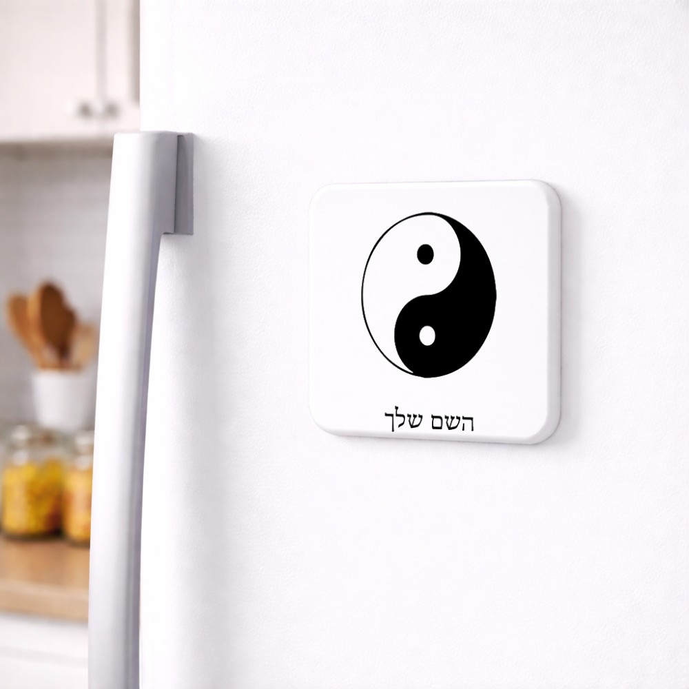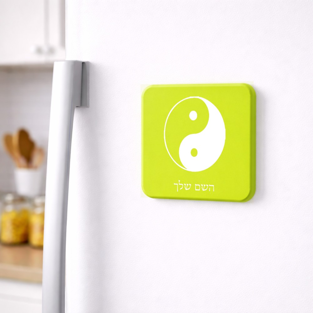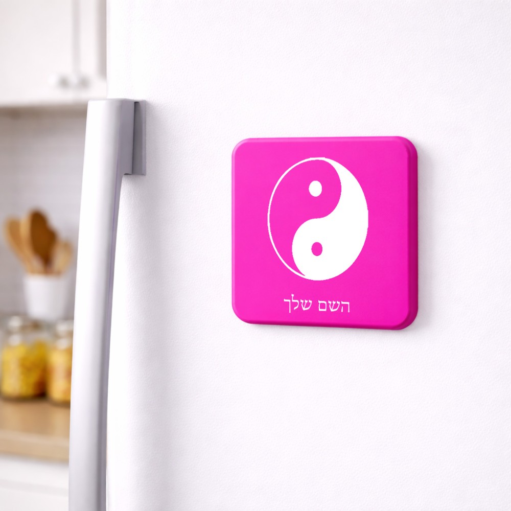 מגנט למקרר בעיצוב אישי עם השם שלך בעיצוב סמל יינג יאנג גודל המגנט 6.5 × 6.5 ס"מ. את השם המבוקש ניתן לציין בהזמנה, אם לא צויין אנחנו ניצור קשר לבירור.