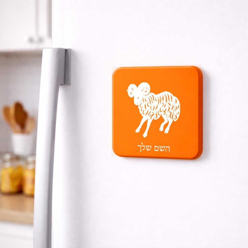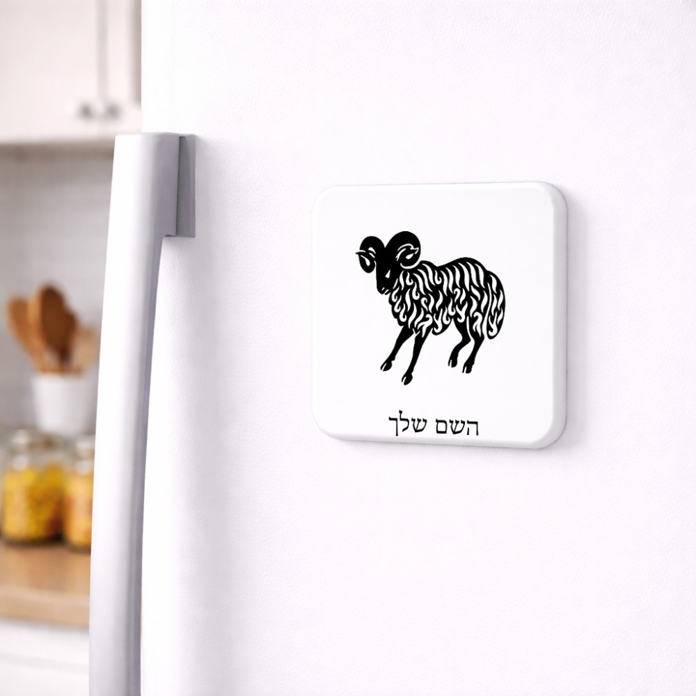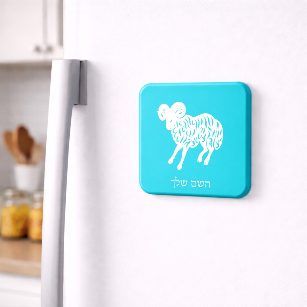 מגנט למקרר בעיצוב אישי עם השם שלך בעיצוב מזלות - טלה גודל המגנט 6.5 × 6.5 ס"מ