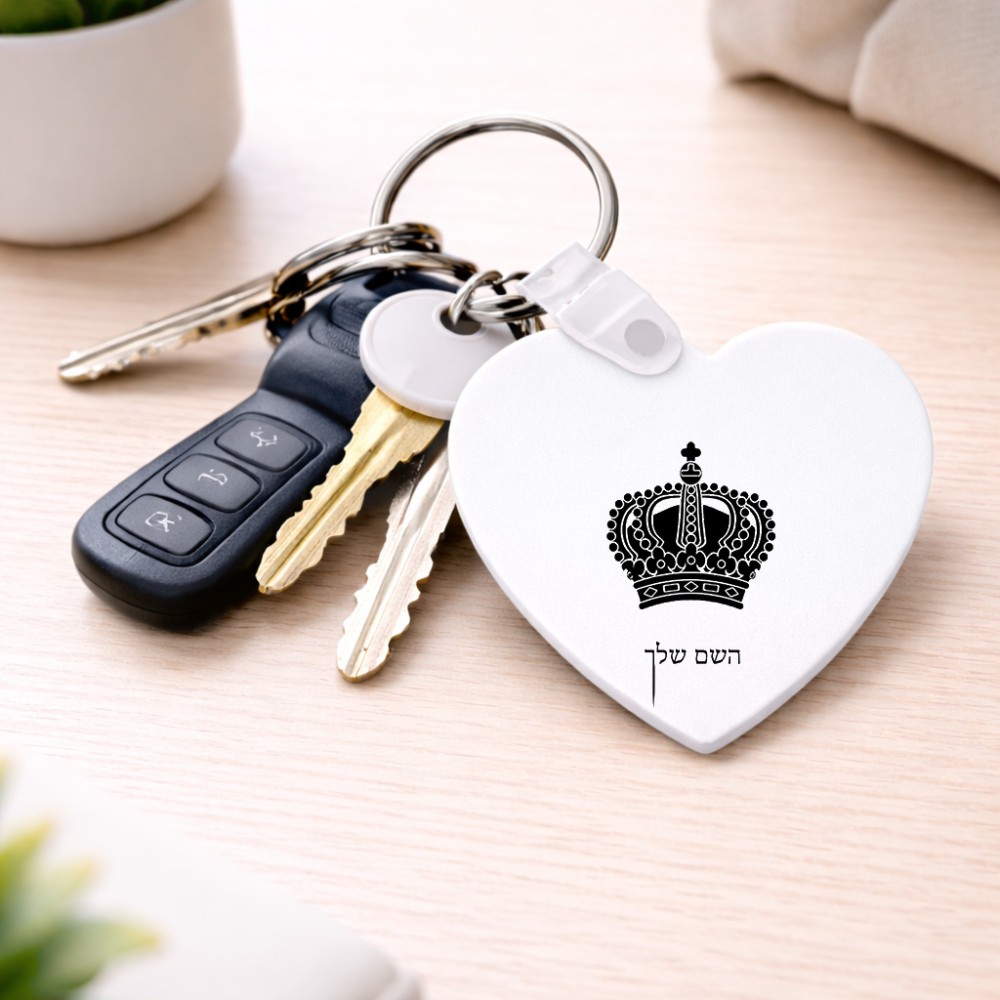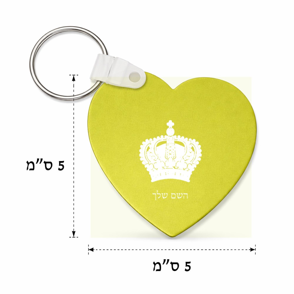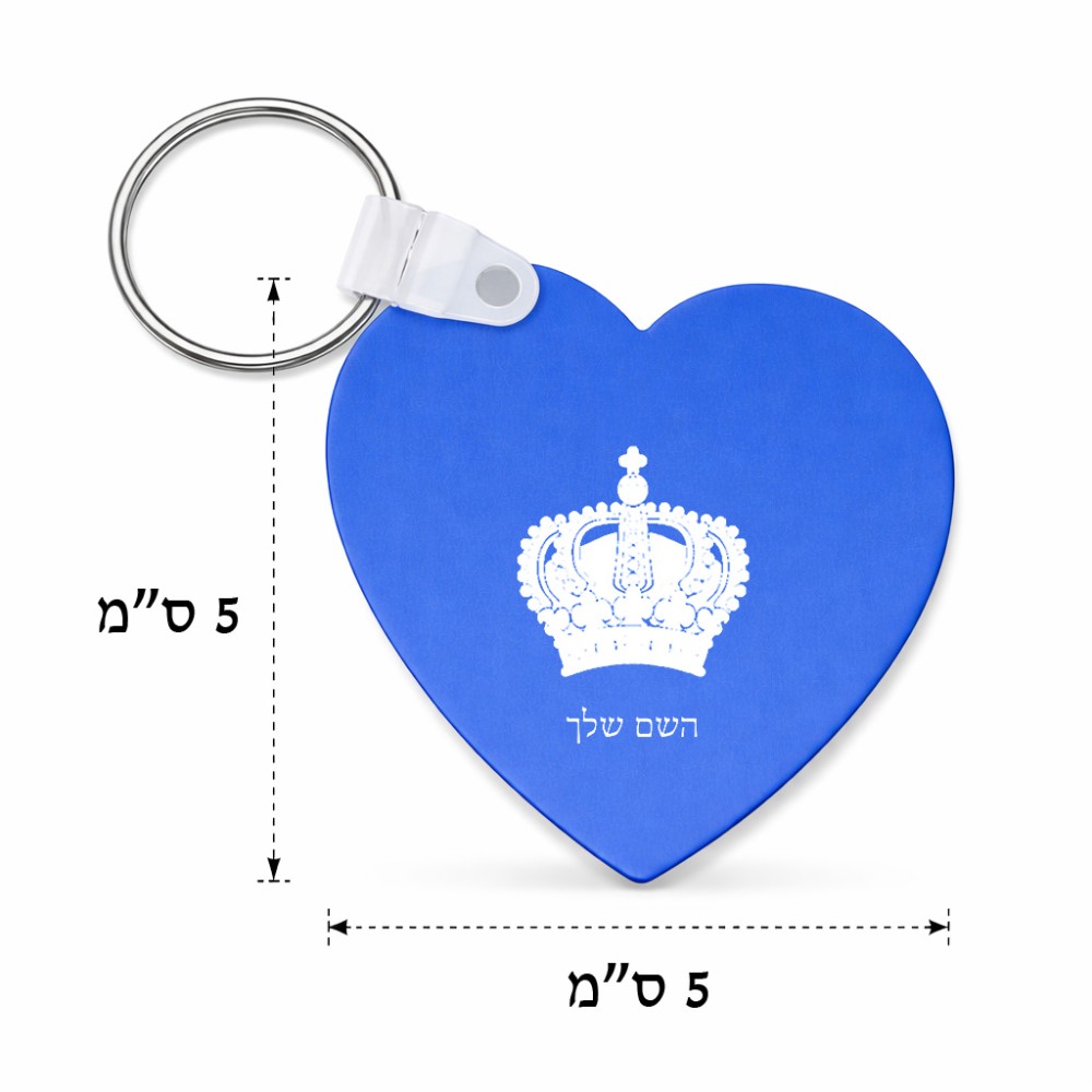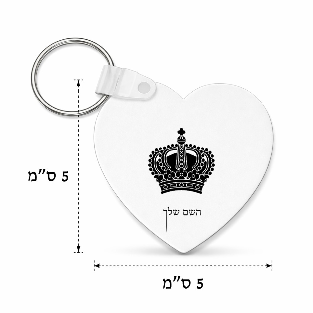 מחזיק מפתחות בצורת לב בעיצוב אישי עם השם שלך בעיצוב כתר מלכותי גודל המחזיק 5 × 5 ס"מ. את השם המבוקש ניתן לציין בהזמנה, אם לא צויין אנחנו ניצור קשר לבירור.