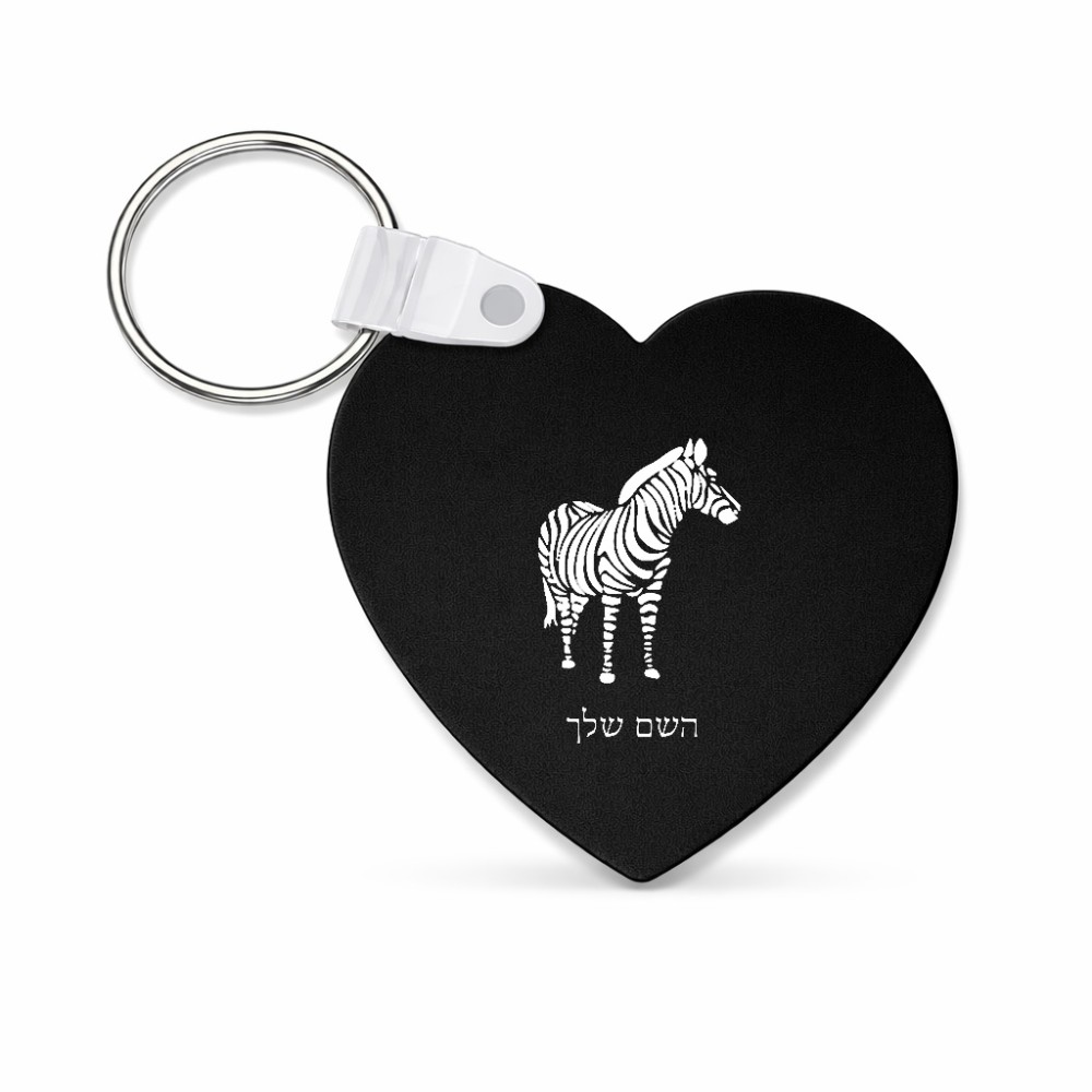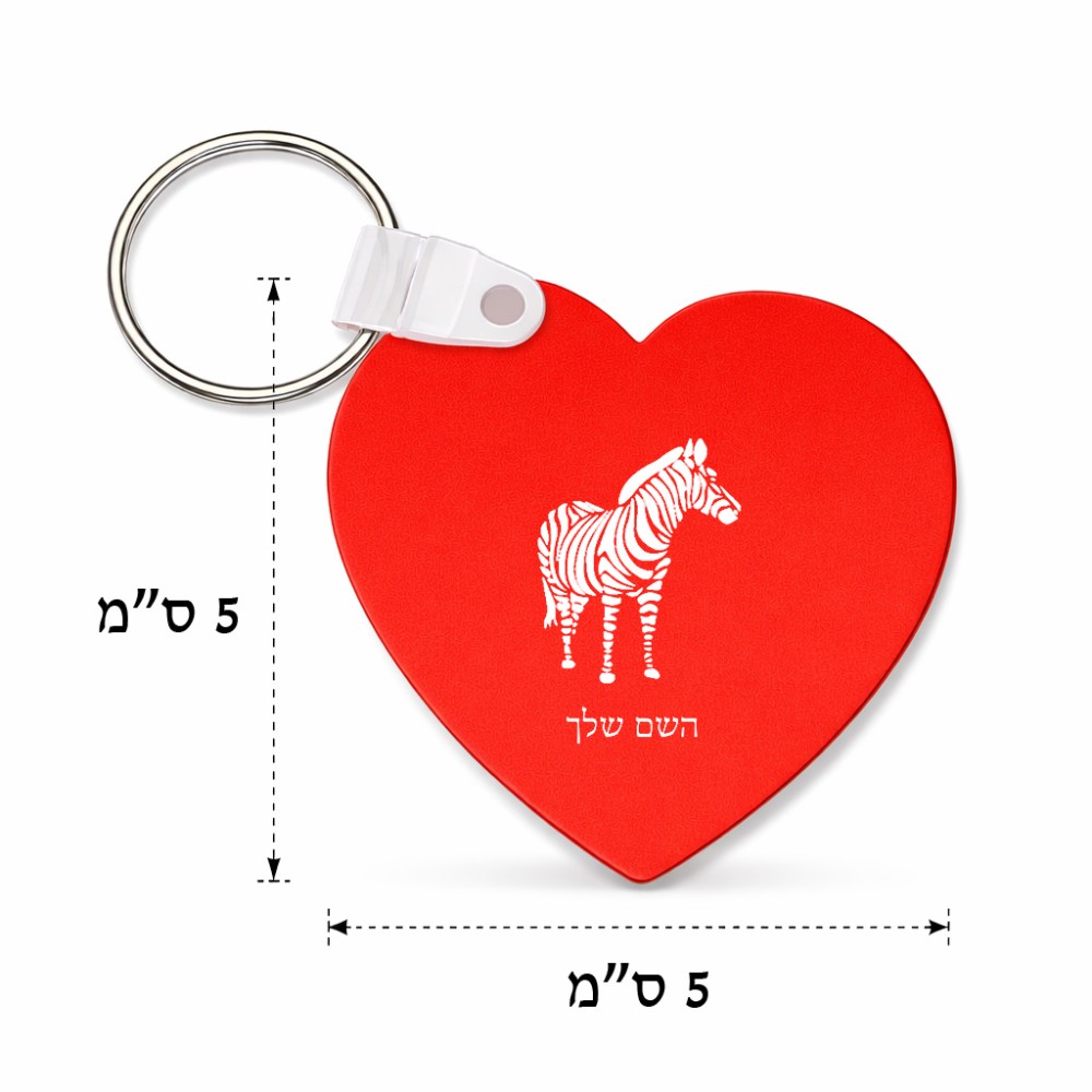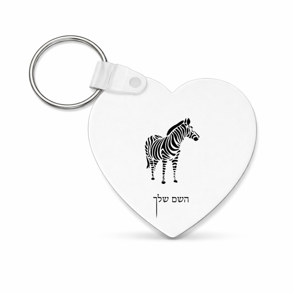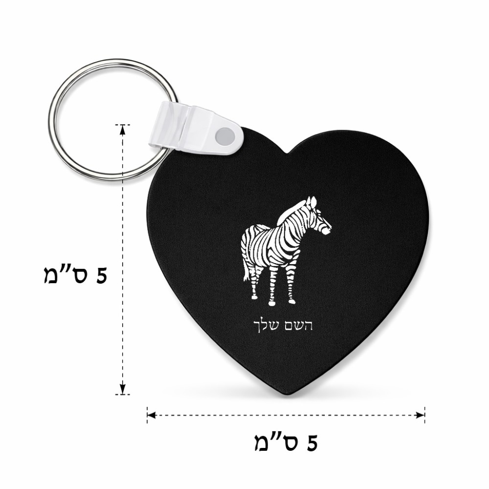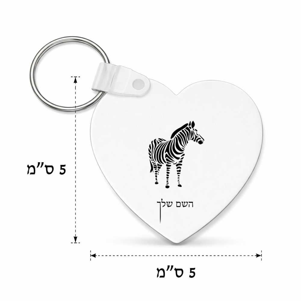 מחזיק מפתחות בצורת לב בעיצוב אישי עם השם שלך בעיצוב זברה גודל המחזיק 5 × 5 ס"מ. את השם המבוקש ניתן לציין בהזמנה, אם לא צויין אנחנו ניצור קשר לבירור.