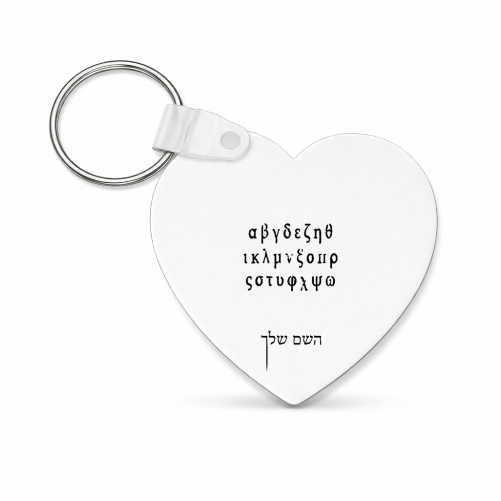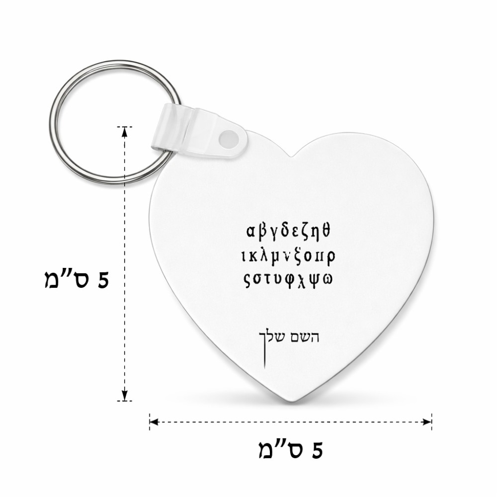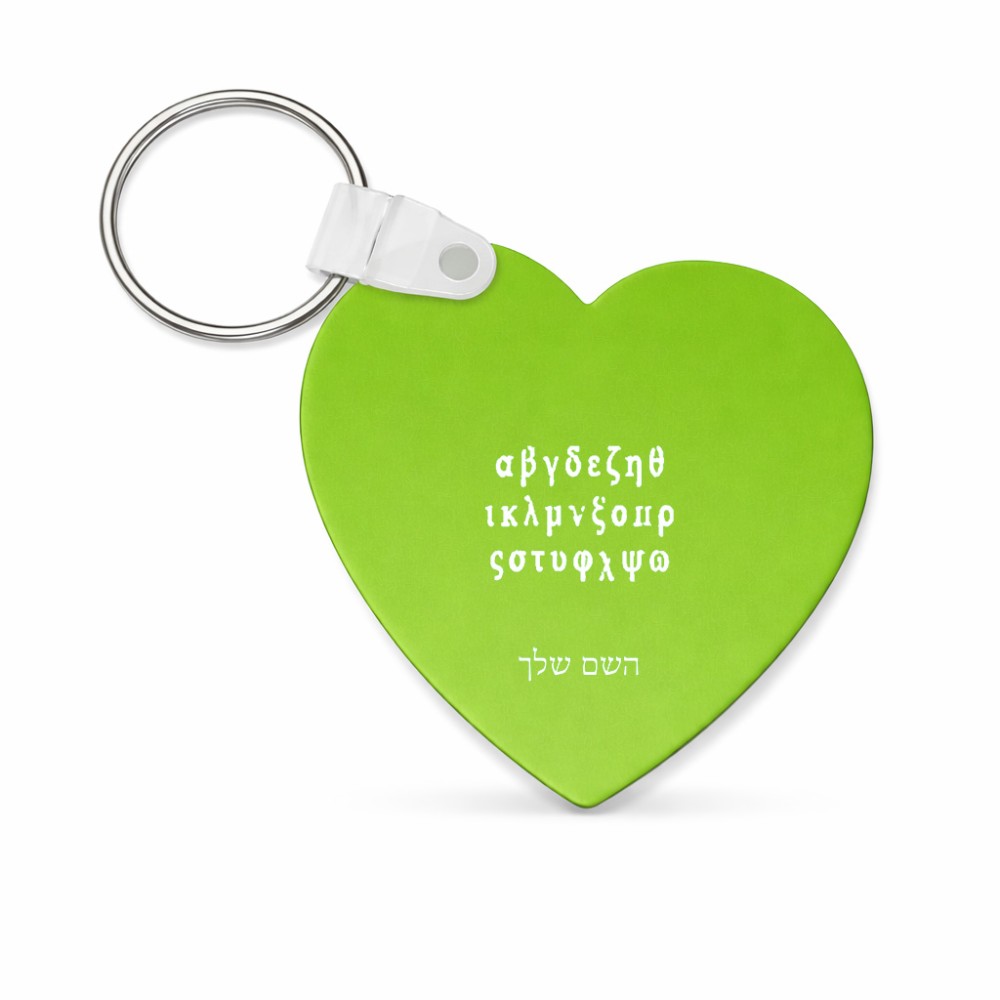 מחזיק מפתחות בצורת לב בעיצוב אישי עם השם שלך בעיצוב האלפבית היווני גודל המחזיק 5 × 5 ס"מ. את השם המבוקש ניתן לציין בהזמנה, אם לא צויין אנחנו ניצור קשר לבירור.