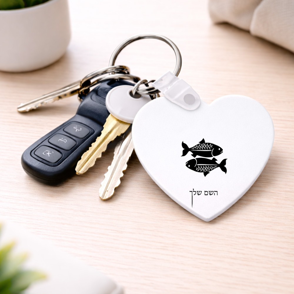 מחזיק מפתחות בצורת לב בעיצוב אישי עם השם שלך בעיצוב מזלות - דגים גודל המחזיק 5 × 5 ס"מ. את השם המבוקש ניתן לציין בהזמנה, אם לא צויין אנחנו ניצור קשר לבירור.