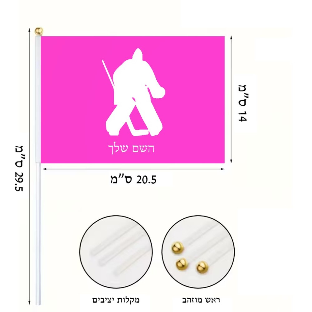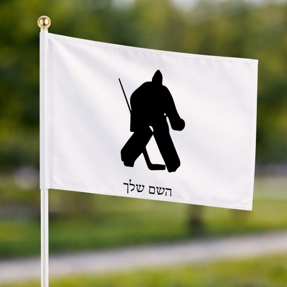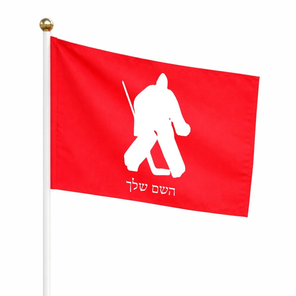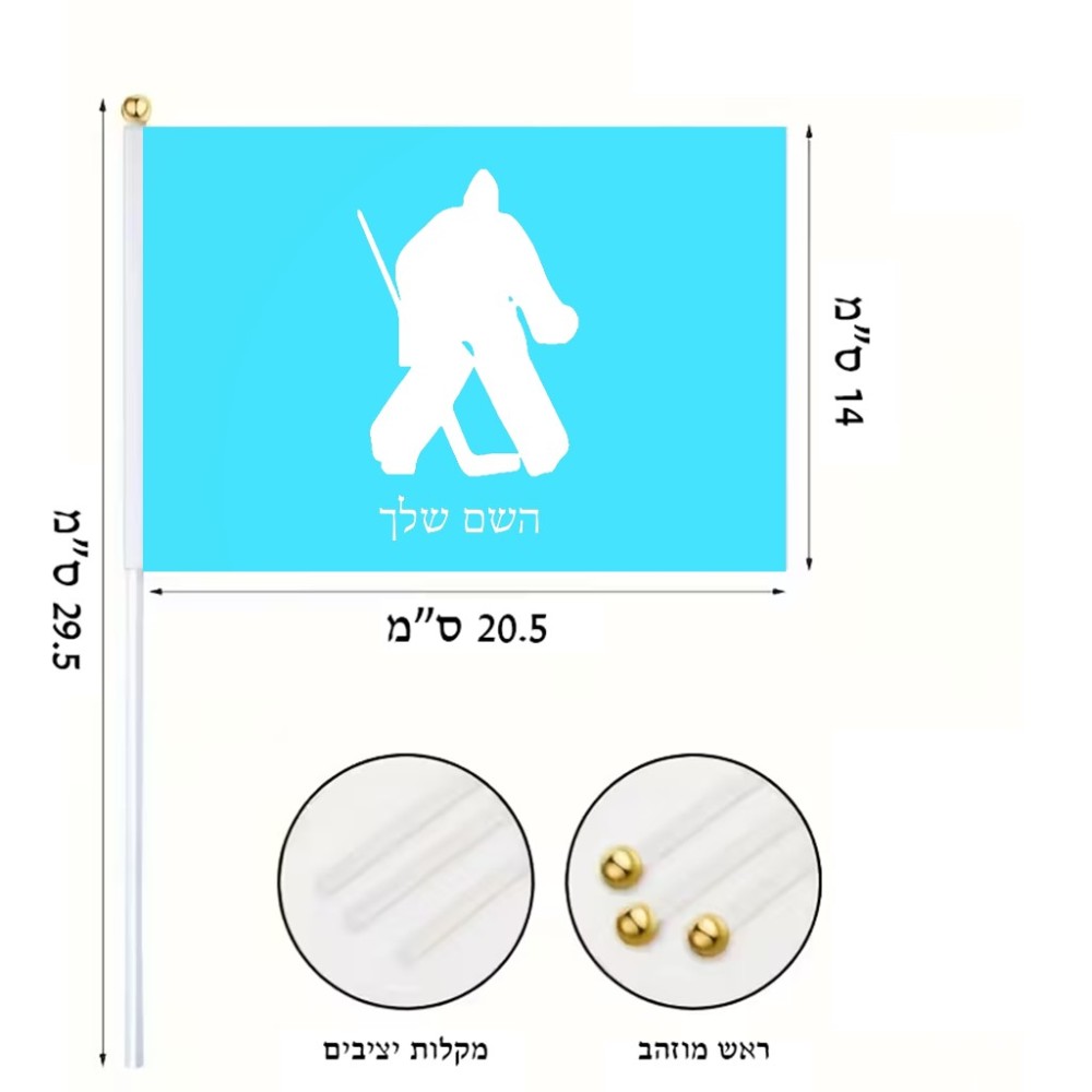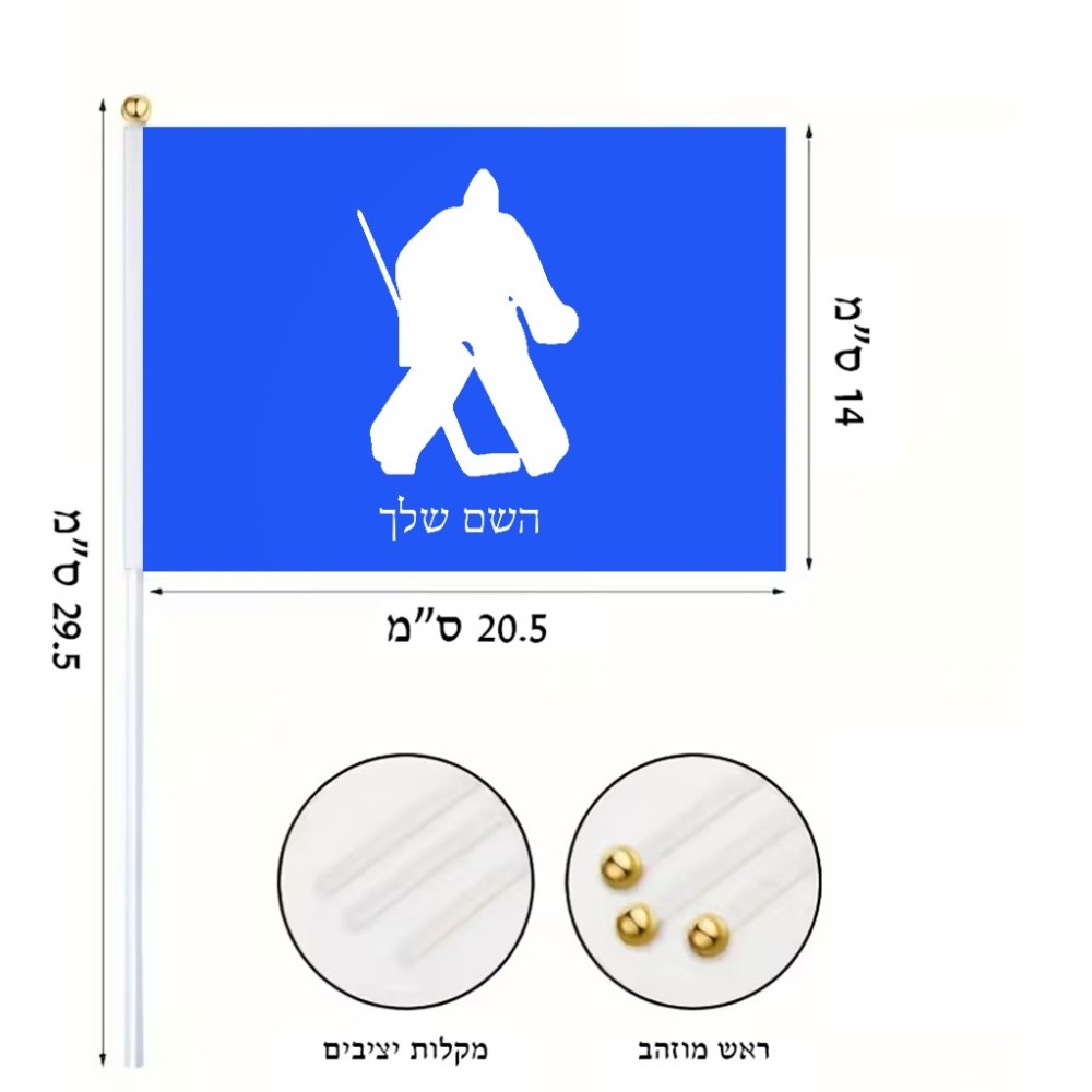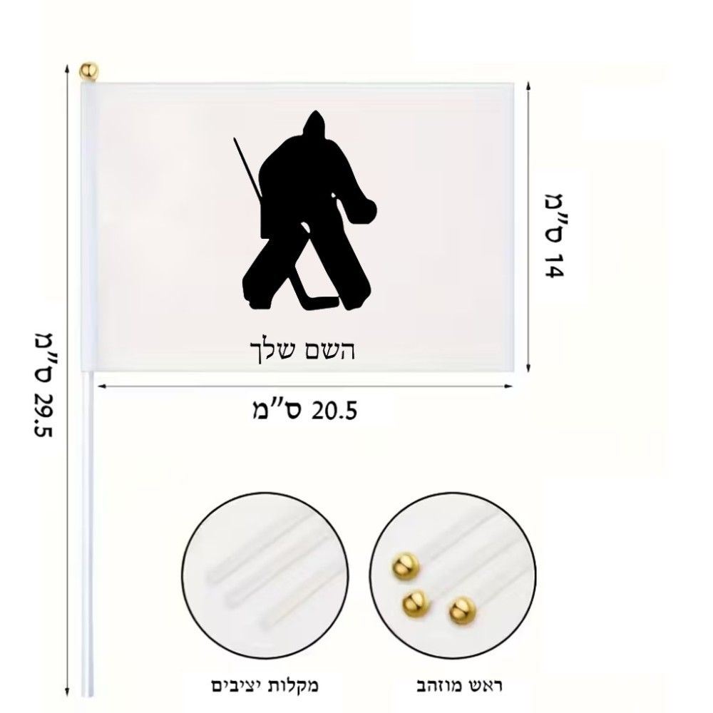 דיגלון בעיצוב אישי עם השם שלך בעיצוב הוקי שוערים גודל הדיגלון 20.5 × 14 ס"מ, ההדפסה מתבצעת בשני צידי הדגל, את השם המבוקש ניתן לציין בהזמנה, אם לא צויין אנחנו ניצור קשר לבירור.